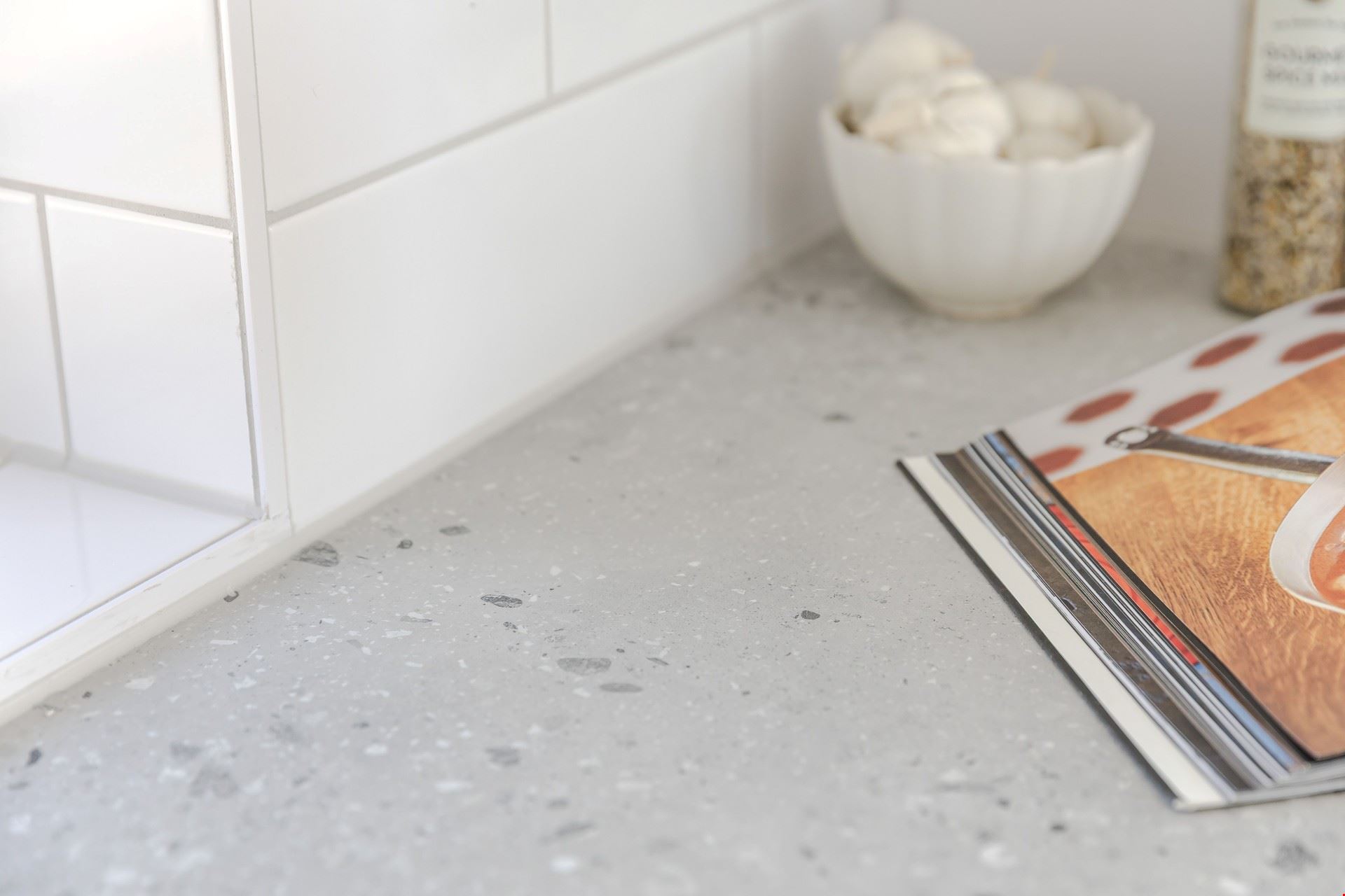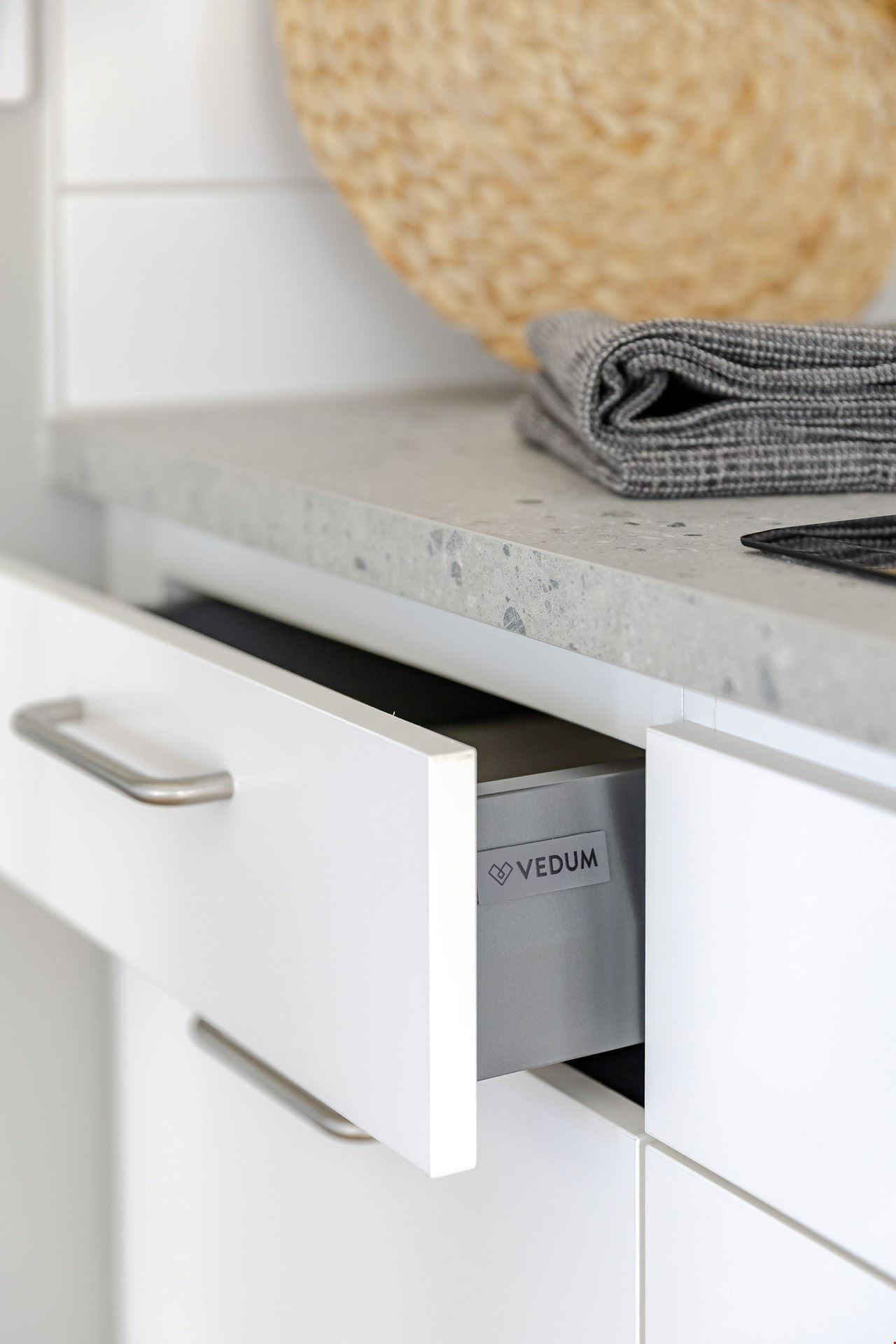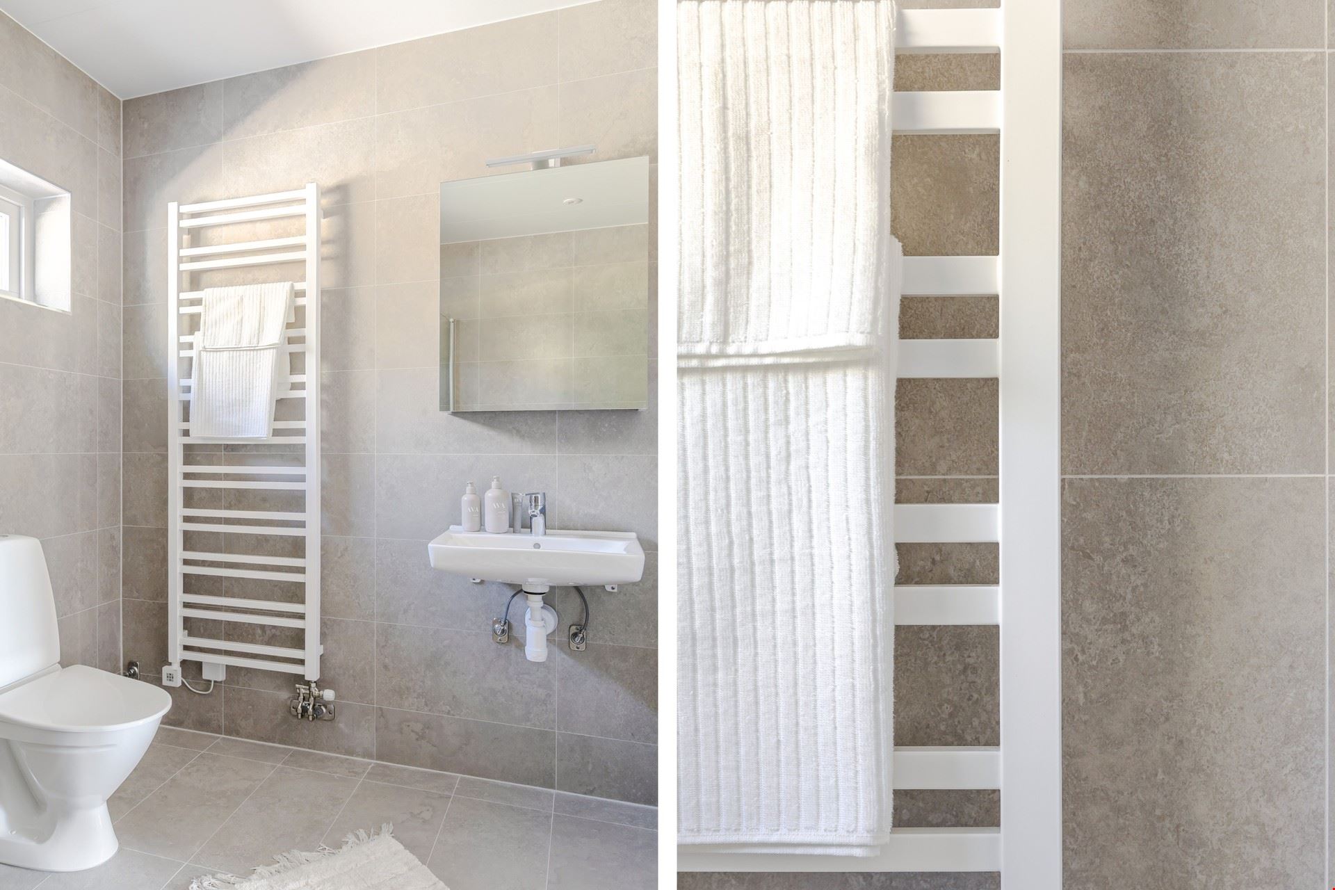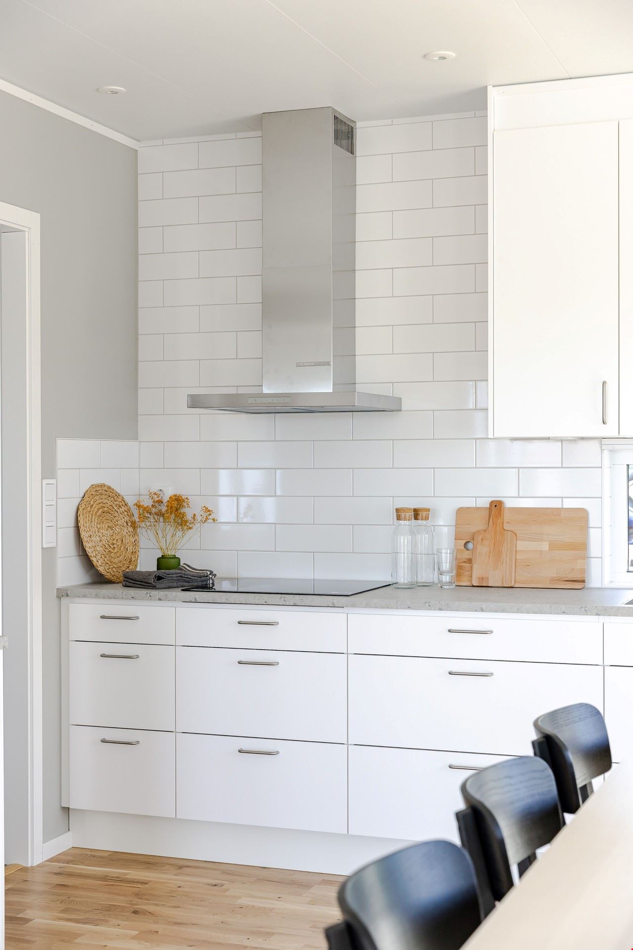 Köket kommer från Vedum med vita luckor, rostfria handtag och Cento-bänkskiva. Vitvaror från Bosch är redan på plats. Badrummet på entréplan är helkaklat i York greige och utrustat med komfortvärme, duschhörna, kommod och handdukstork.