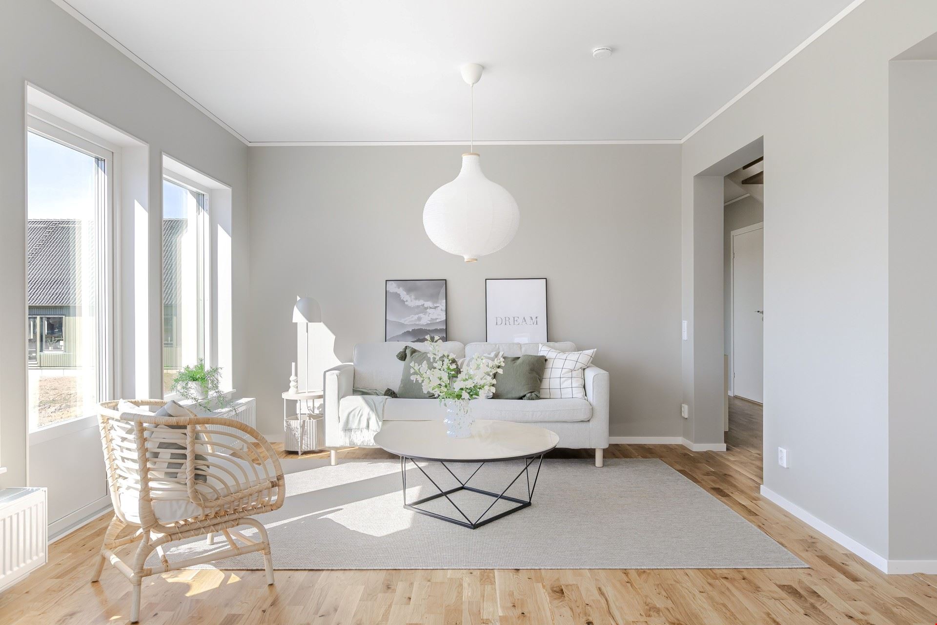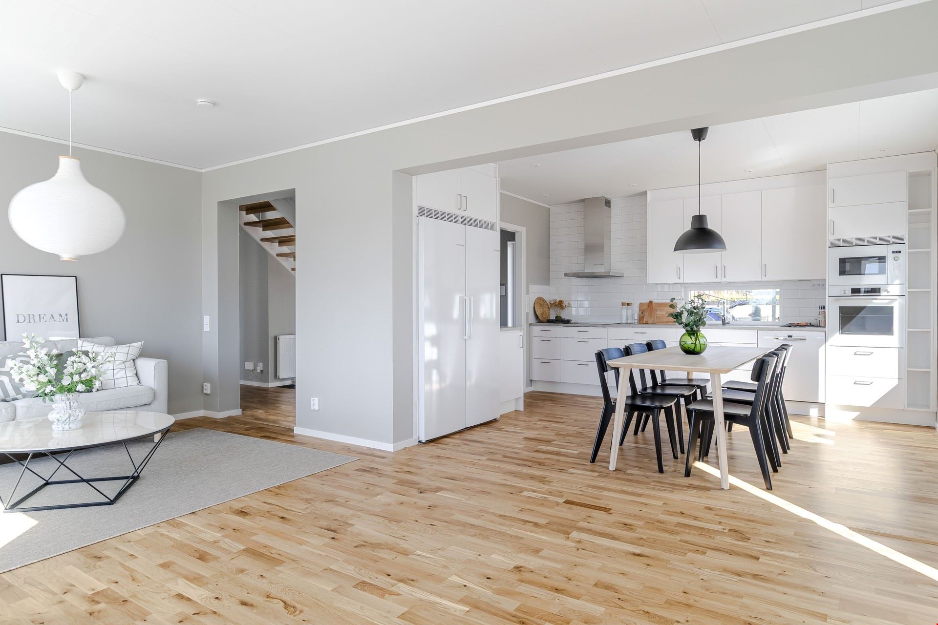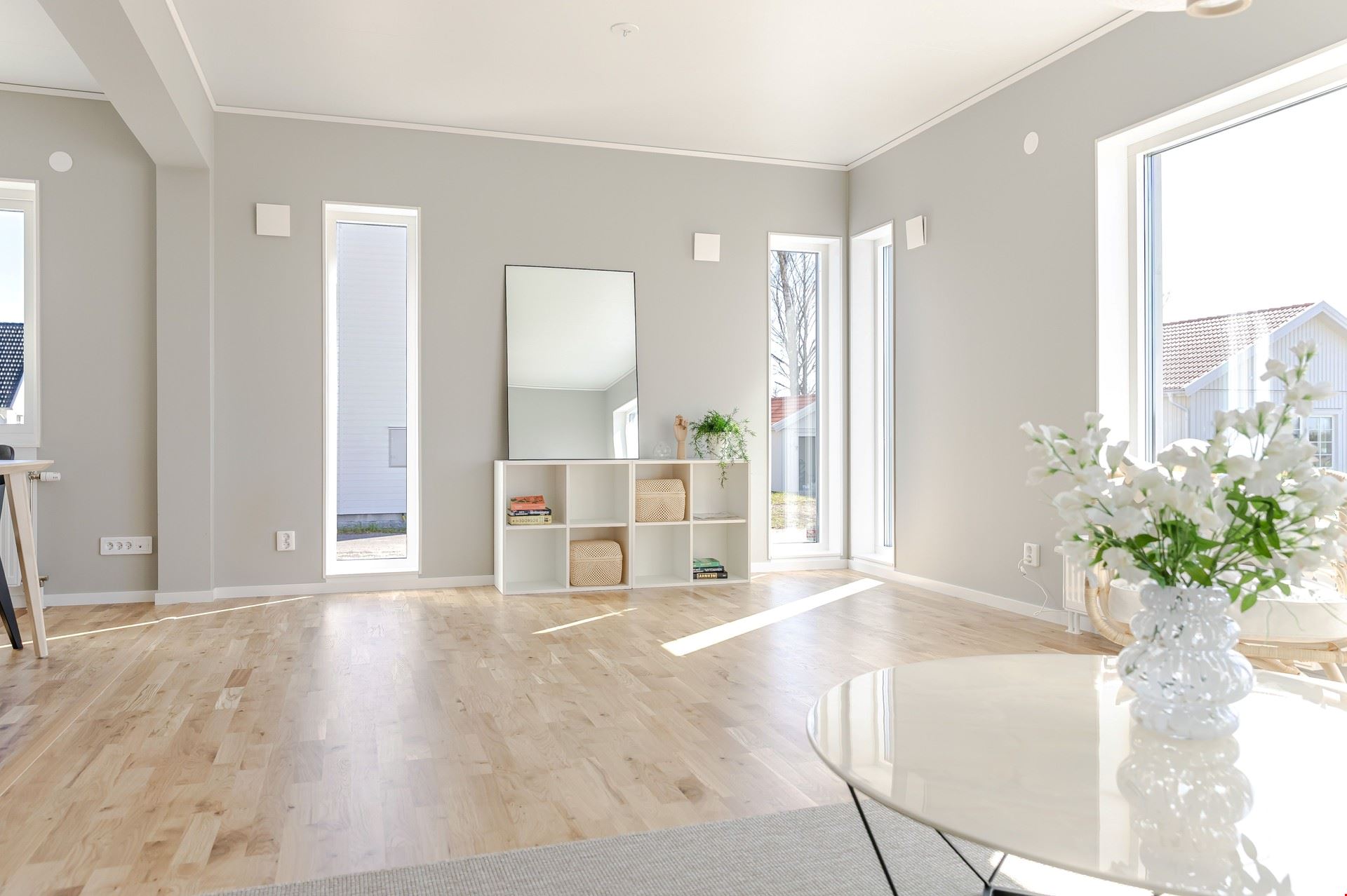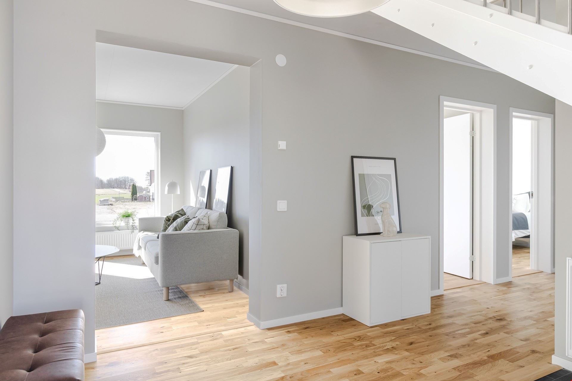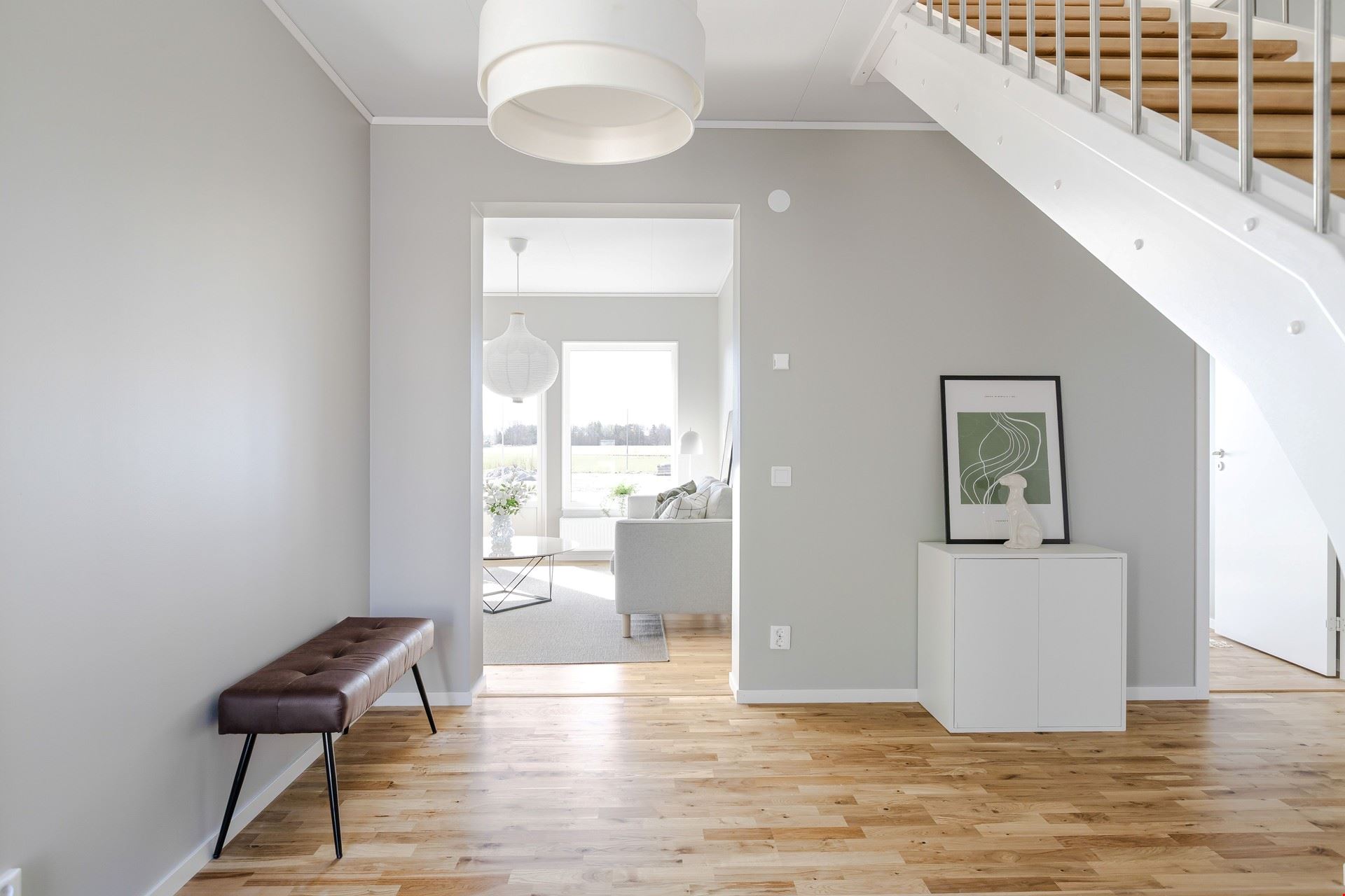 Redan i hallen möts du av ett slitstarkt högtrycksgolv i nyansen Blackstone. På entréplan hittar du två av husets fem sovrum, ett helkaklat badrum samt ett ljust och rymligt vardagsrum med direkt utgång till tomten. Här är det enkelt att samla familj och vänner – oavsett om det är vardag eller helg.