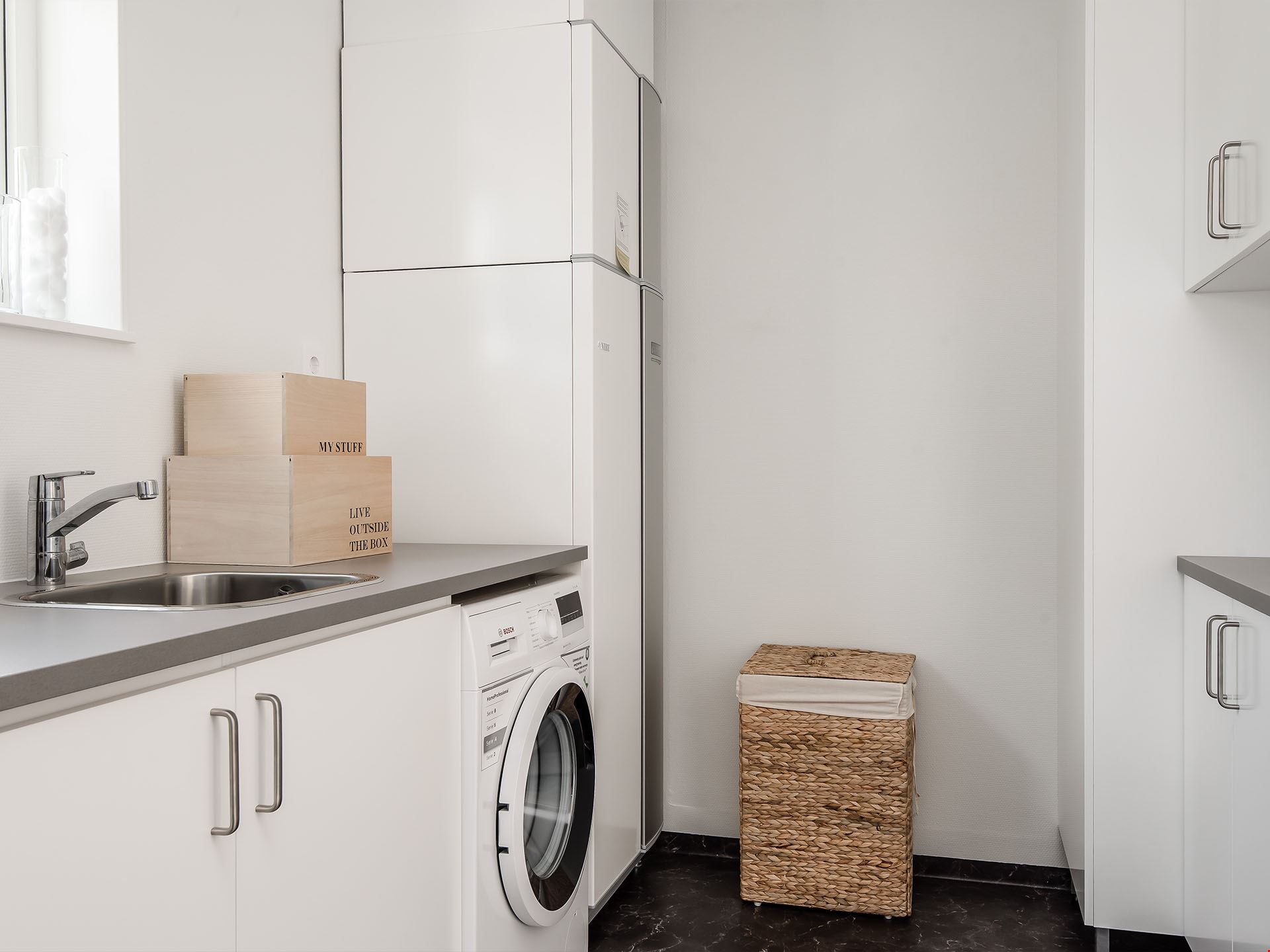 Villa Näsby är ett stort hus i litet format. Huset fördelar sig på 95 m² och består av 3 rum och kök. Mittskeppet i huset utgör samvaroytor, den avskärmade men öppna entrén ger ett härligt välkomnande och möjlighet till en extra förvaring i nischen. I Husets ena ände ligger de två sovrummen samlade intill de kaklade badrummet med duschvägg och kommod. Köket kommer från Vedum och är utrustat med vårt så kallade "lyxkök". Här får du ett kök med höga överskåp, dämpade lådor, mjukstängande luckor, högskåp för inbyggd ugn och micro, rostfria vitvaror, samt rostfri frihängande fläkt. Köket har en tidlös stil med vita spegelluckor, handtag i matt stål och mörk bänksskiva.