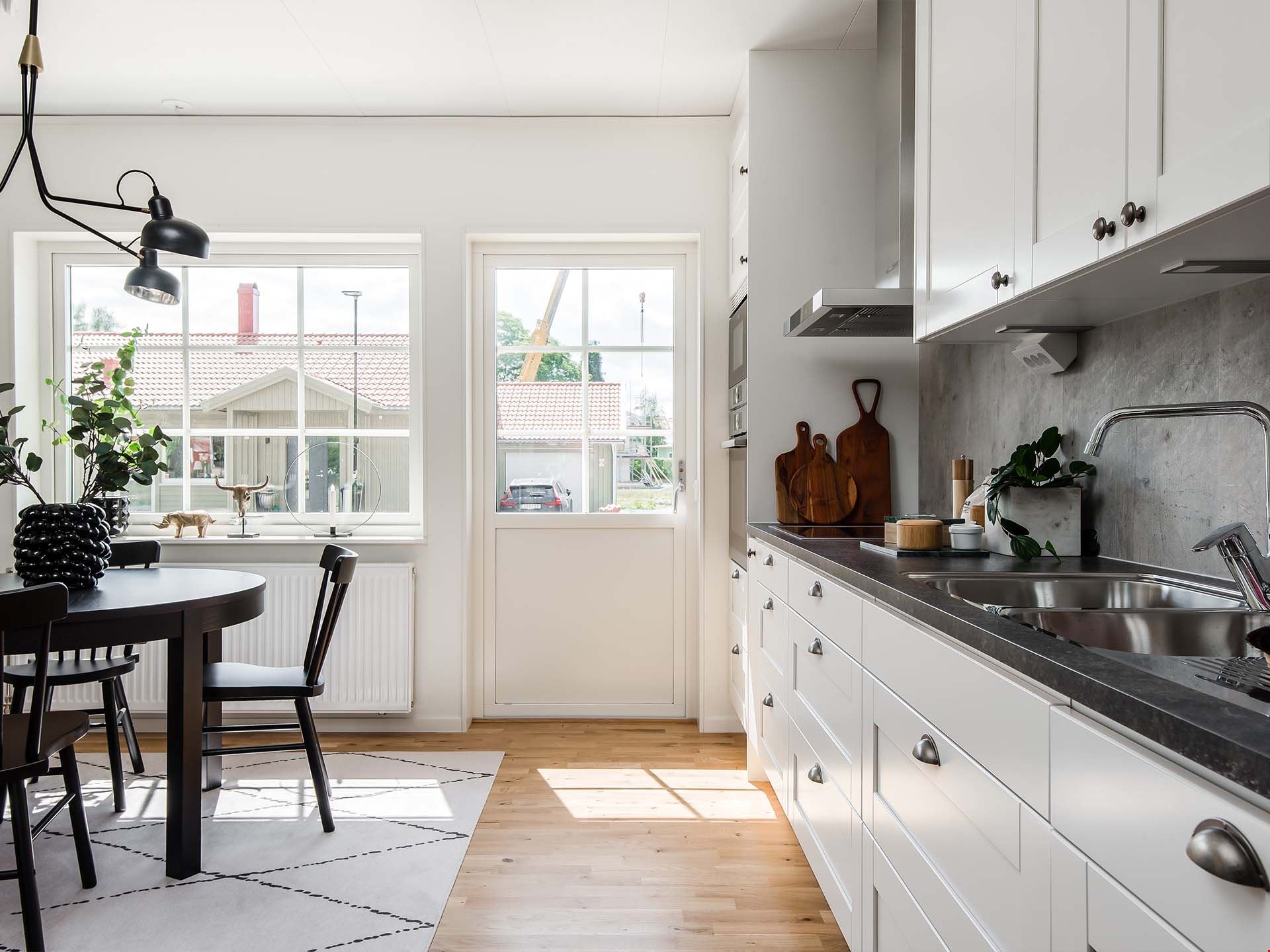 Villa Näsby är ett stort hus i litet format. Huset fördelar sig på 95 m² och består av 3 rum och kök. Mittskeppet i huset utgör samvaroytor, den avskärmade men öppna entrén ger ett härligt välkomnande och möjlighet till en extra förvaring i nischen. I Husets ena ände ligger de två sovrummen samlade intill de kaklade badrummet med duschvägg och kommod. Köket kommer från Vedum och är utrustat med vårt så kallade "lyxkök". Här får du ett kök med höga överskåp, dämpade lådor, mjukstängande luckor, högskåp för inbyggd ugn och micro, rostfria vitvaror, samt rostfri frihängande fläkt. Köket har en tidlös stil med vita spegelluckor, handtag i matt stål och mörk bänksskiva.