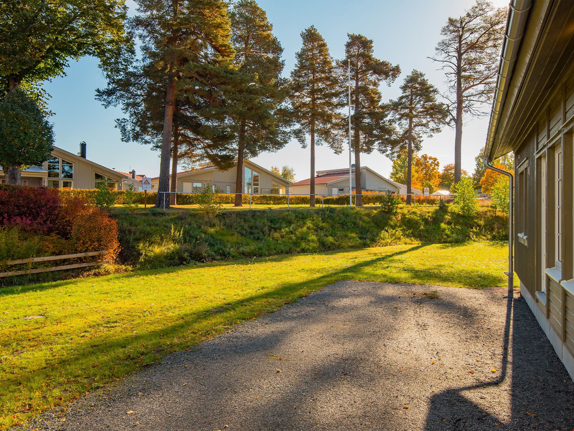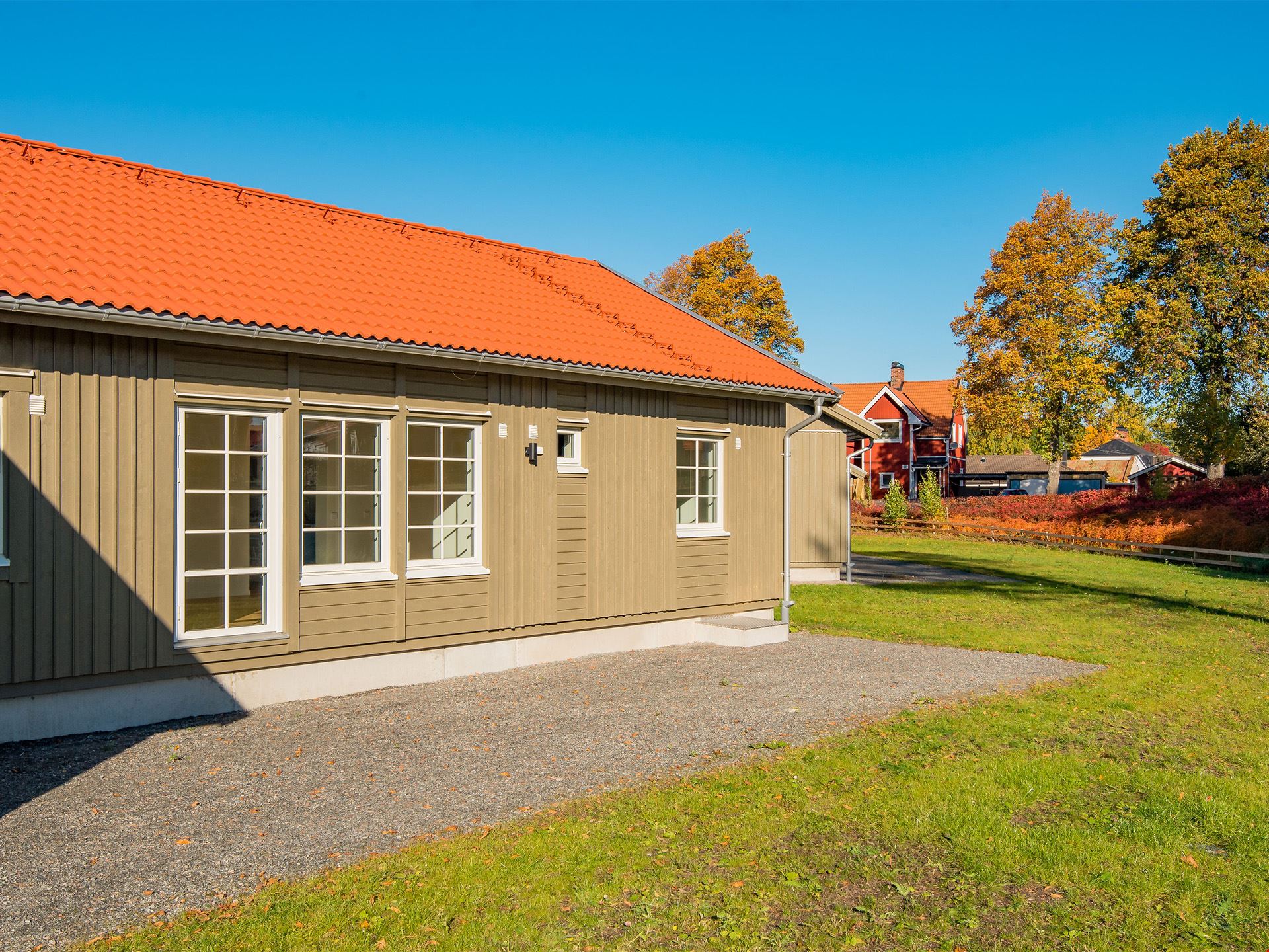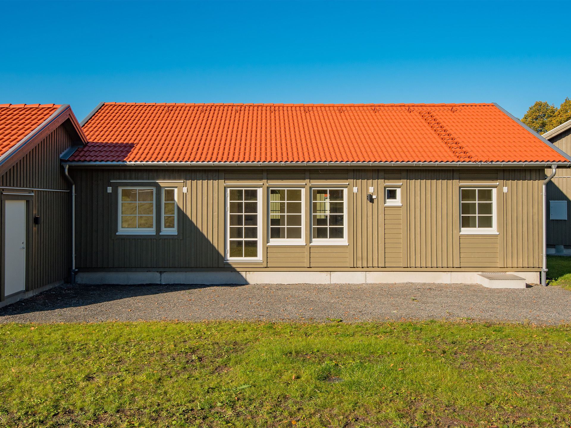 Målarfärg för en strykning ingår till utvändig målning i färgen 6010- G90Y samt gräsmatta, grusad infart och gångytor.