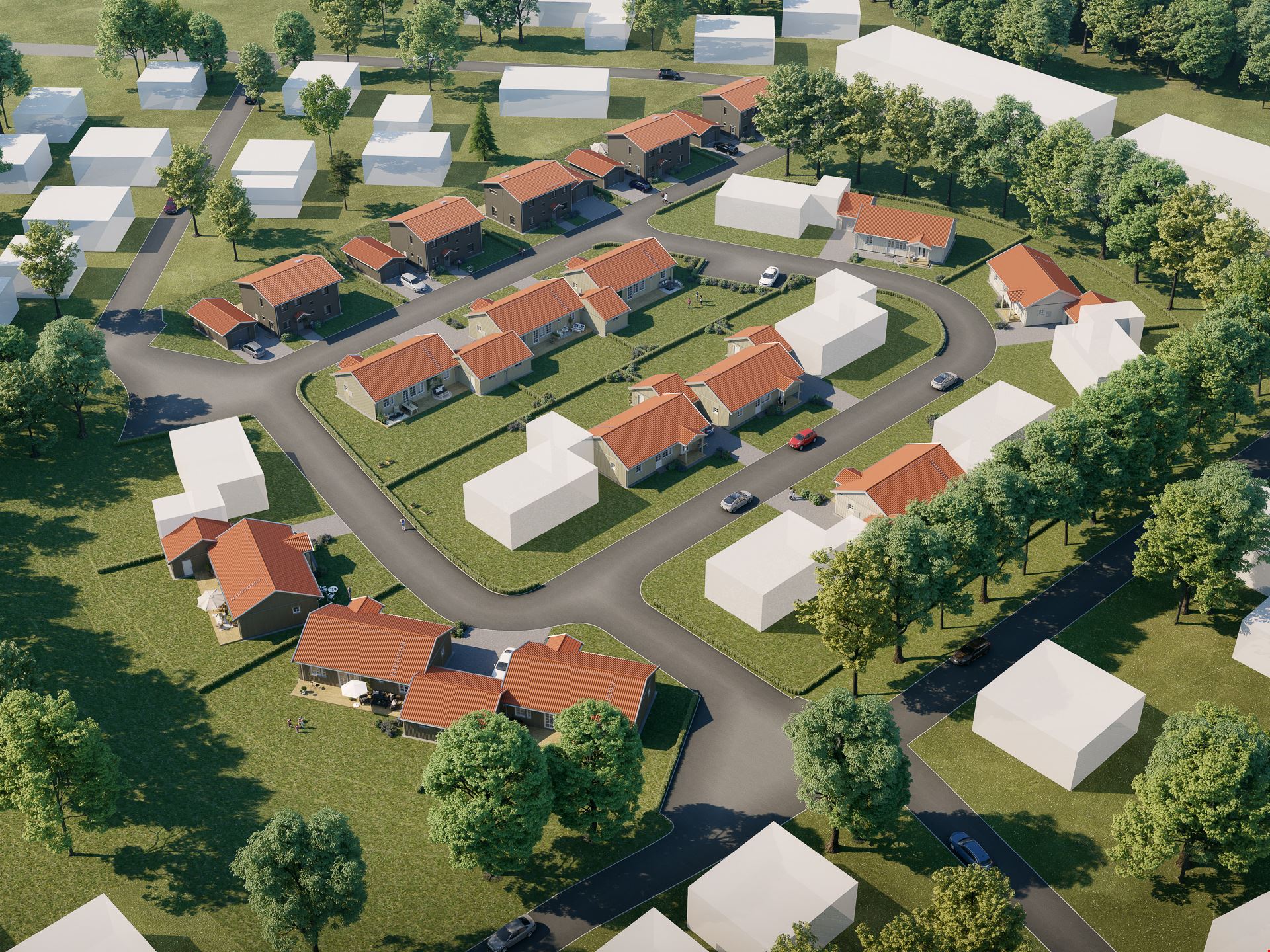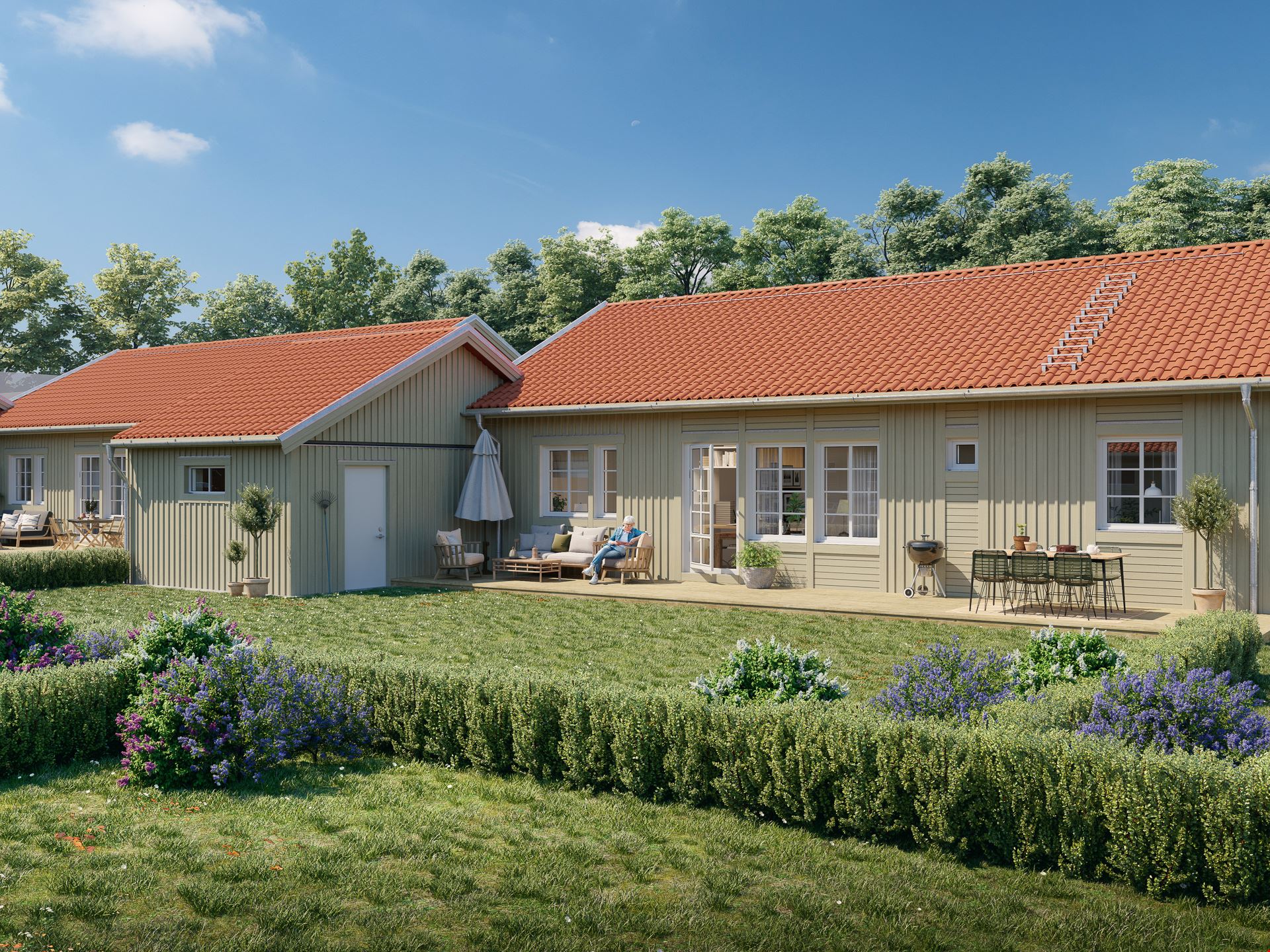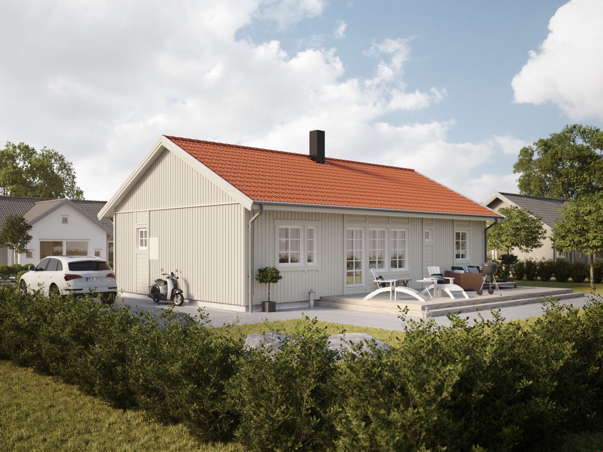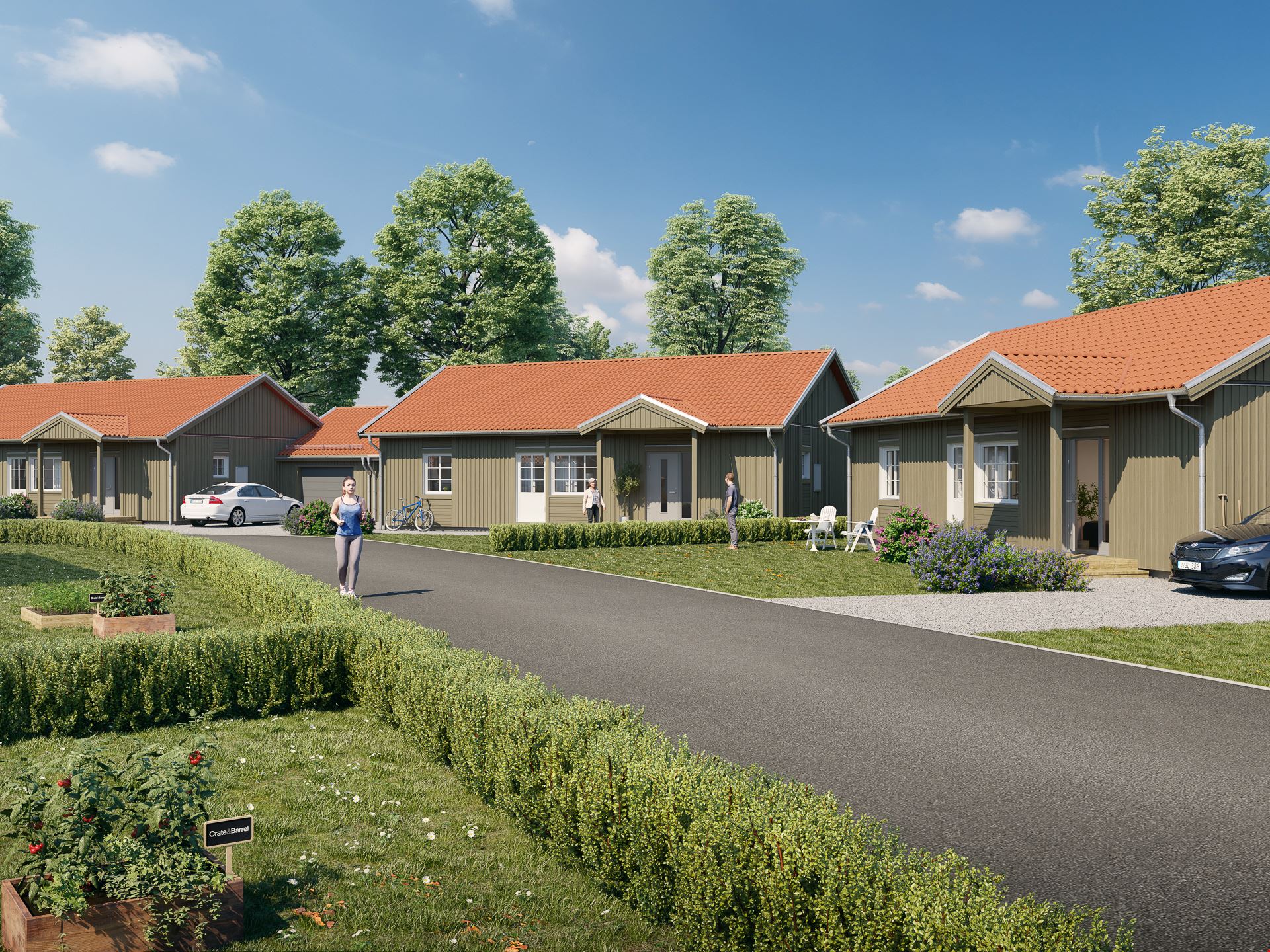 Notera att bilderna är en illustration, t.ex. ingår inte häckar, altan och eldstad.