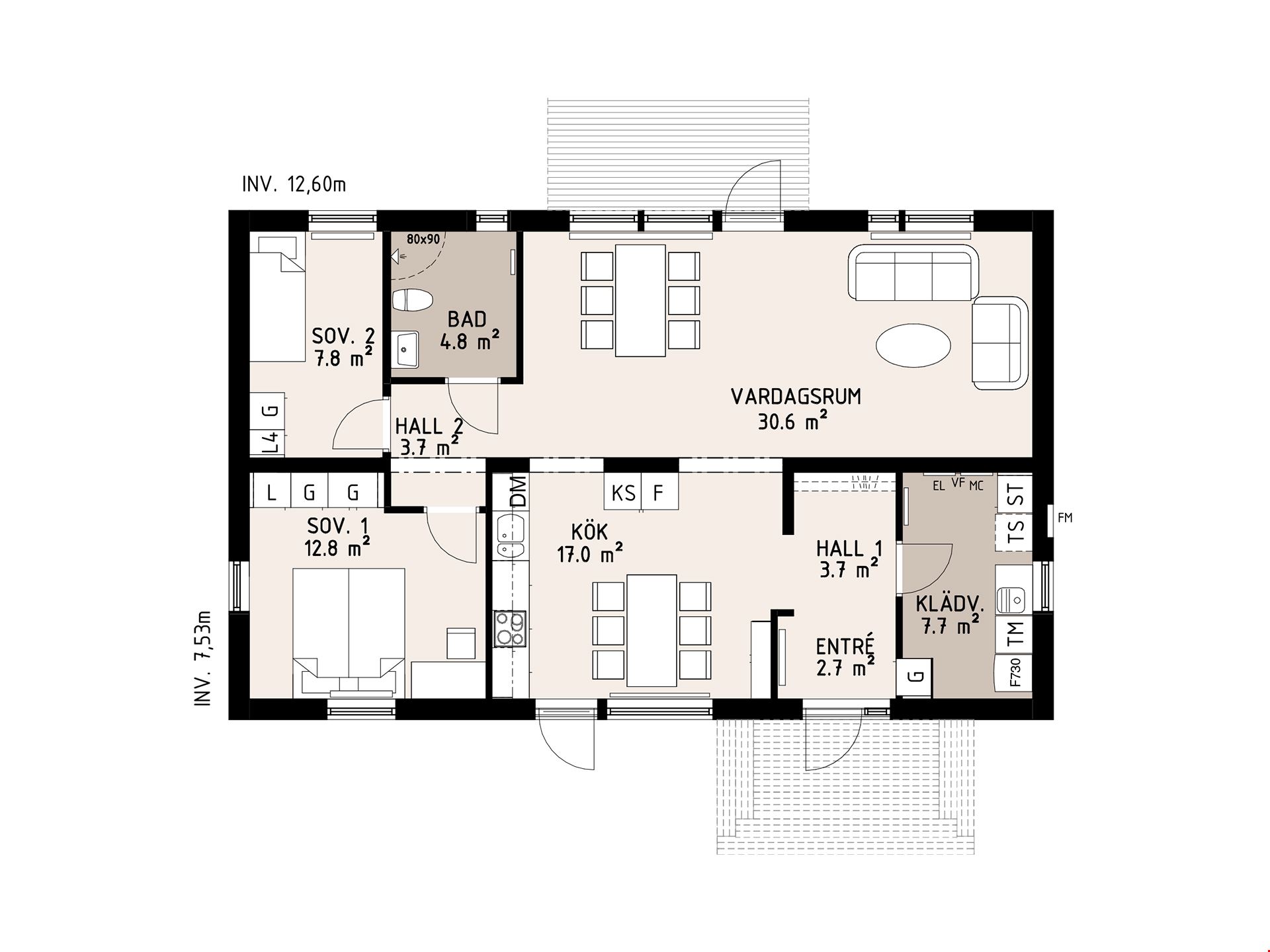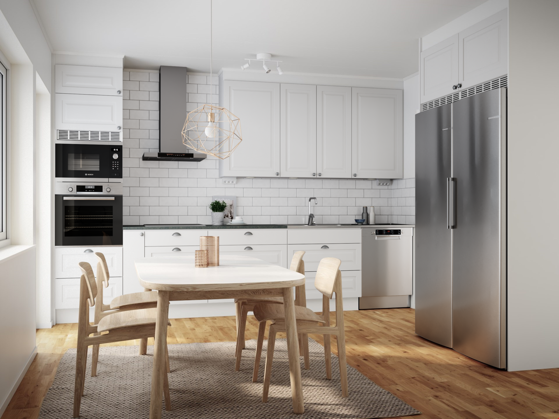 Villa Näsby är ett stort hus i litet format. Huset fördelar sig på 95 m² och består av 3 rum och kök. Mittskeppet i huset utgör samvaroytor, den avskärmade men öppna entrén ger ett härligt välkomnande och möjlighet till en extra förvaring i nischen. I Husets ena ände ligger de två sovrummen samlade intill de kaklade badrummet med duschvägg och kommod. Köket kommer från Vedum och är utrustat med vårt så kallade "lyxkök". Här får du ett kök med höga överskåp, dämpade lådor, mjukstängande luckor, högskåp för inbyggd ugn och micro, rostfria vitvaror, samt rostfri frihängande fläkt. Köket har en tidlös stil med vita spegelluckor, handtag i matt stål och mörk bänksskiva.