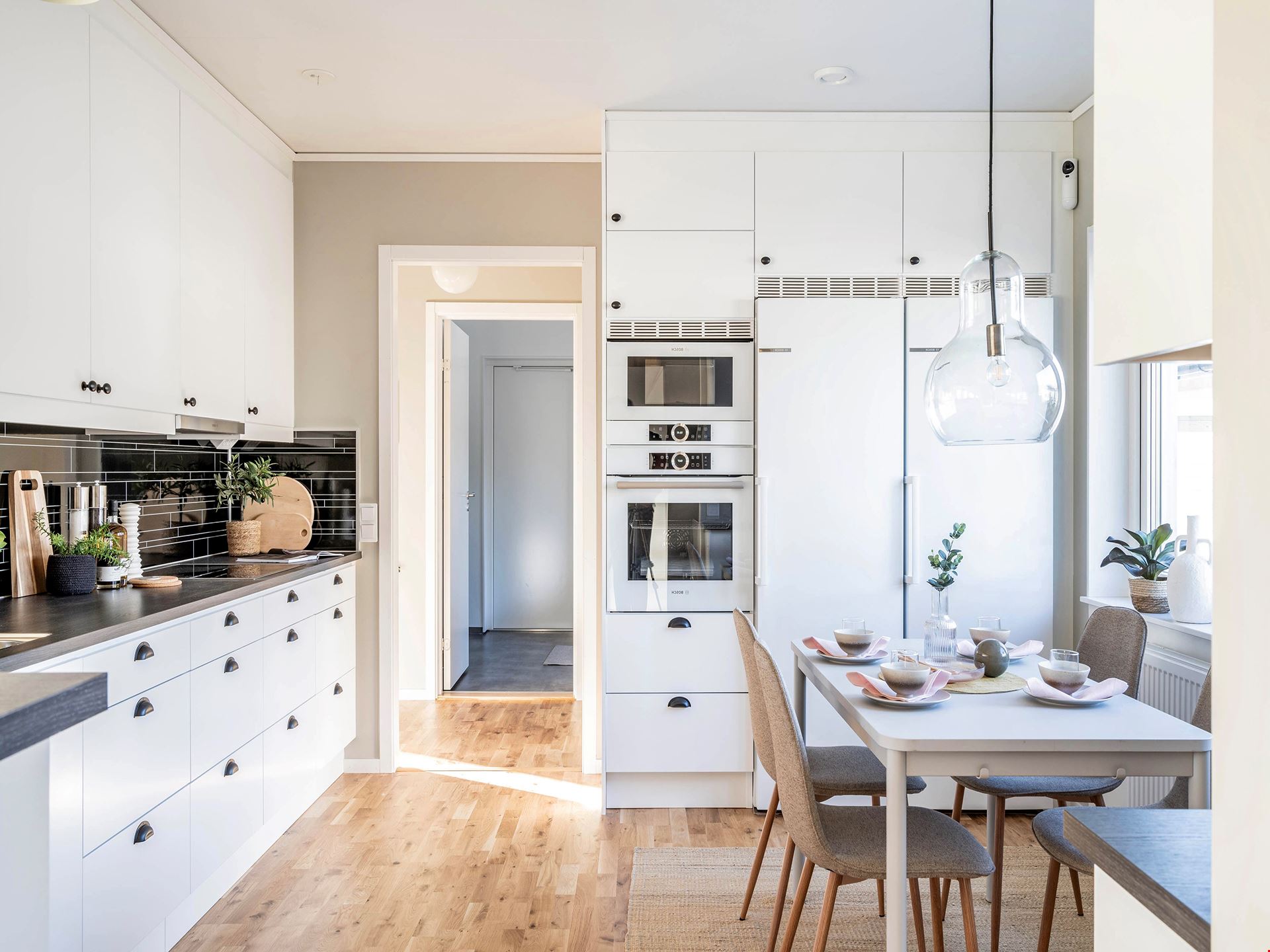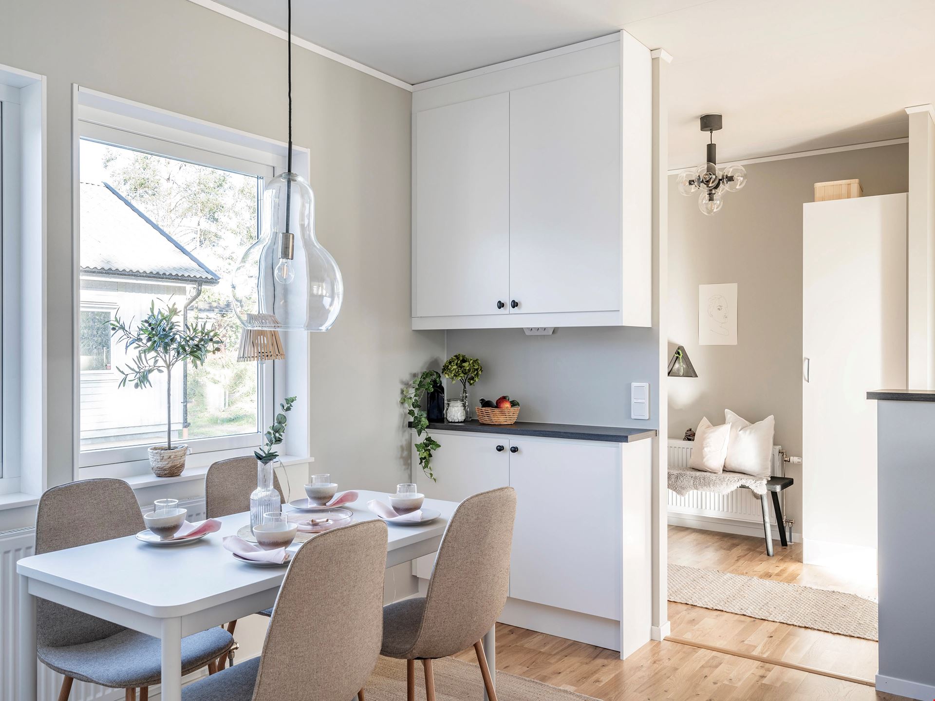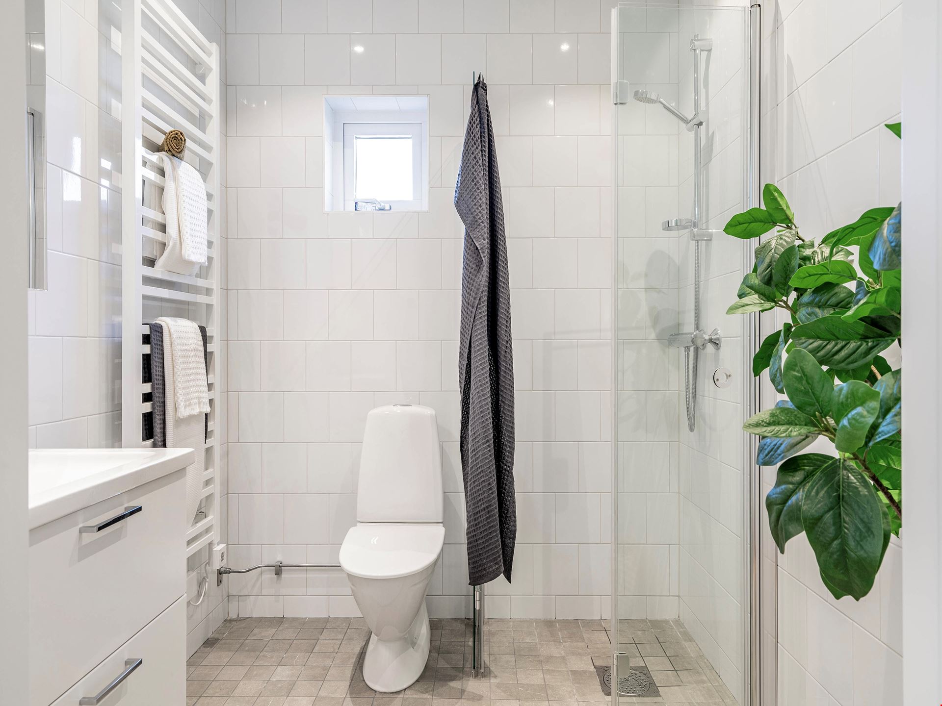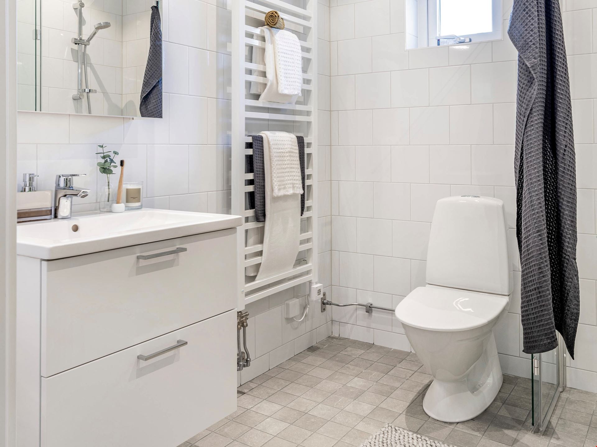 Köket kommer från Vedum och är ett inbyggnadskök med höga överskåp, fullutdragslådor, extra avställningsyta, integrerad diskmaskin, induktionshäll samt vit kyl och frys. Det stora badrummet är inrett med kakel och klinker, vit kommod, duschhörna och golvvärme. Det mindre badrummet är inrett med våtrumsmatta och vit kommod.