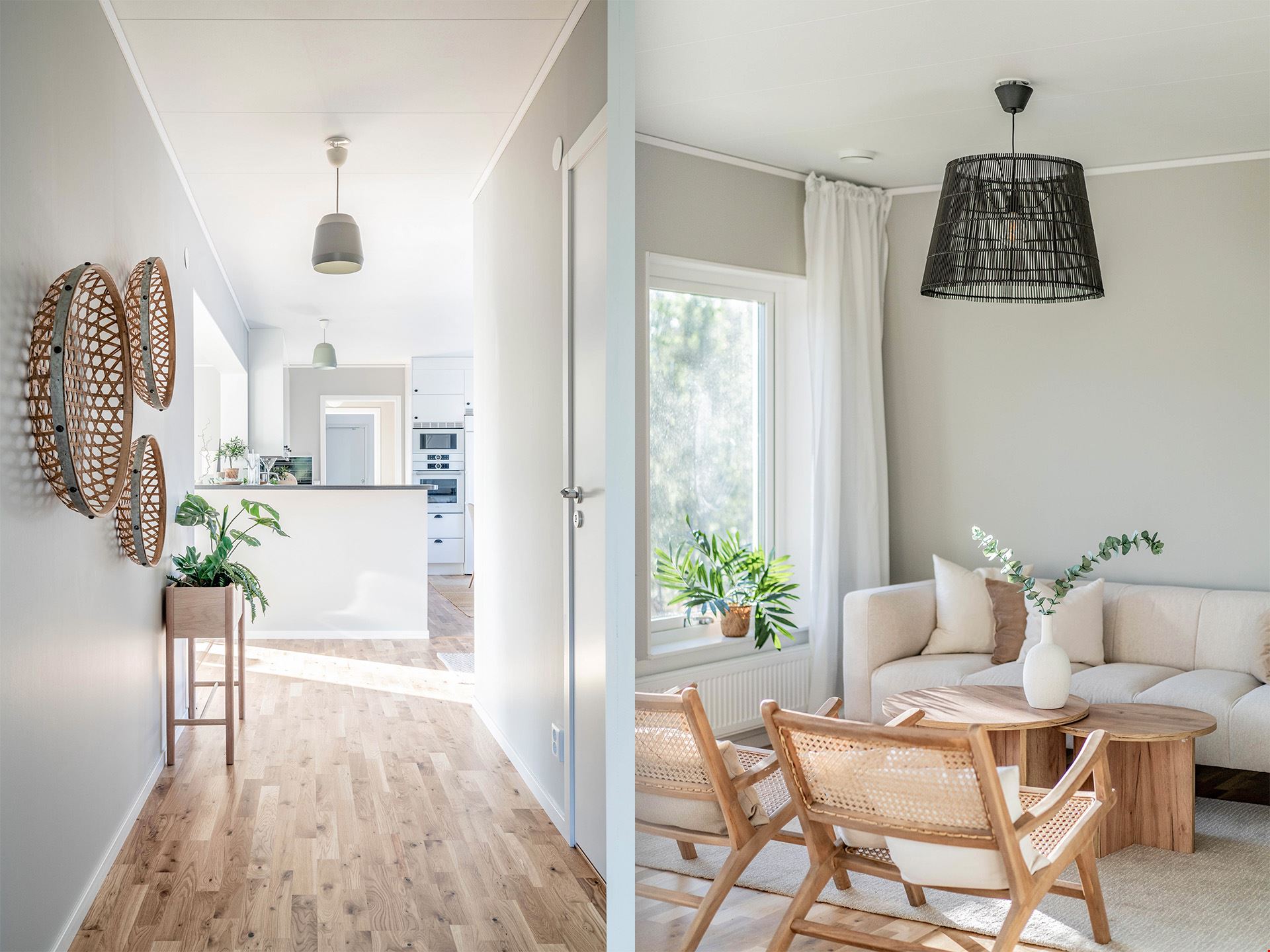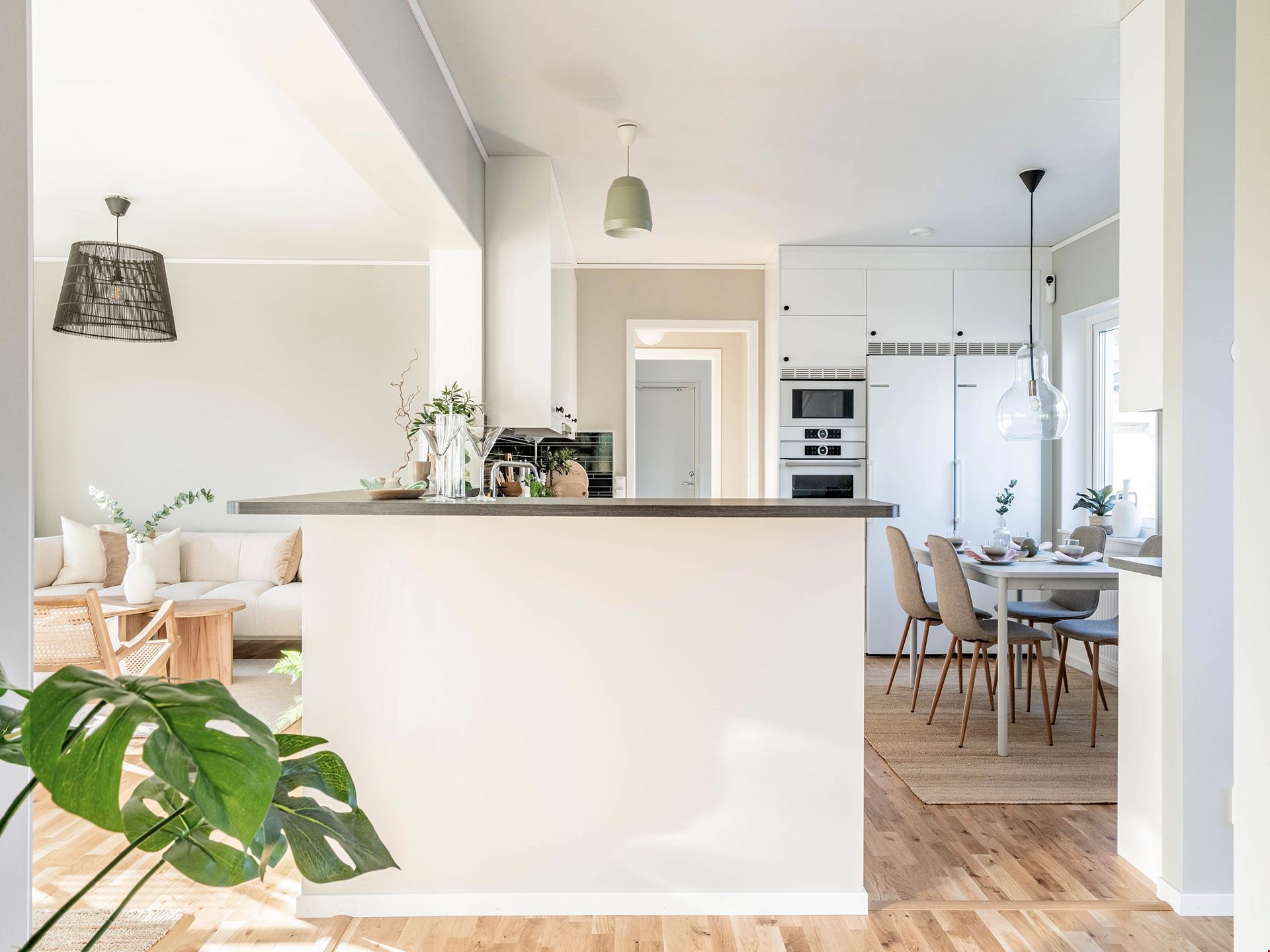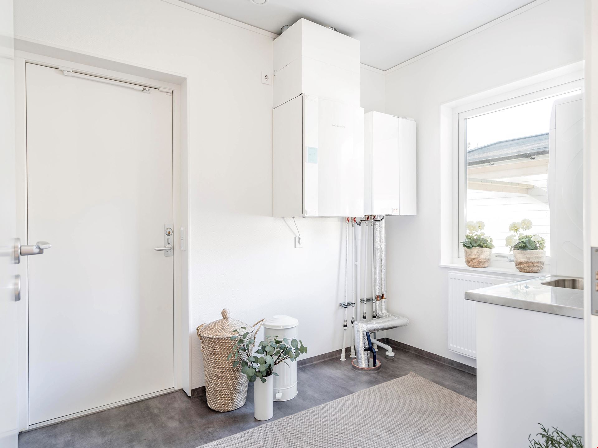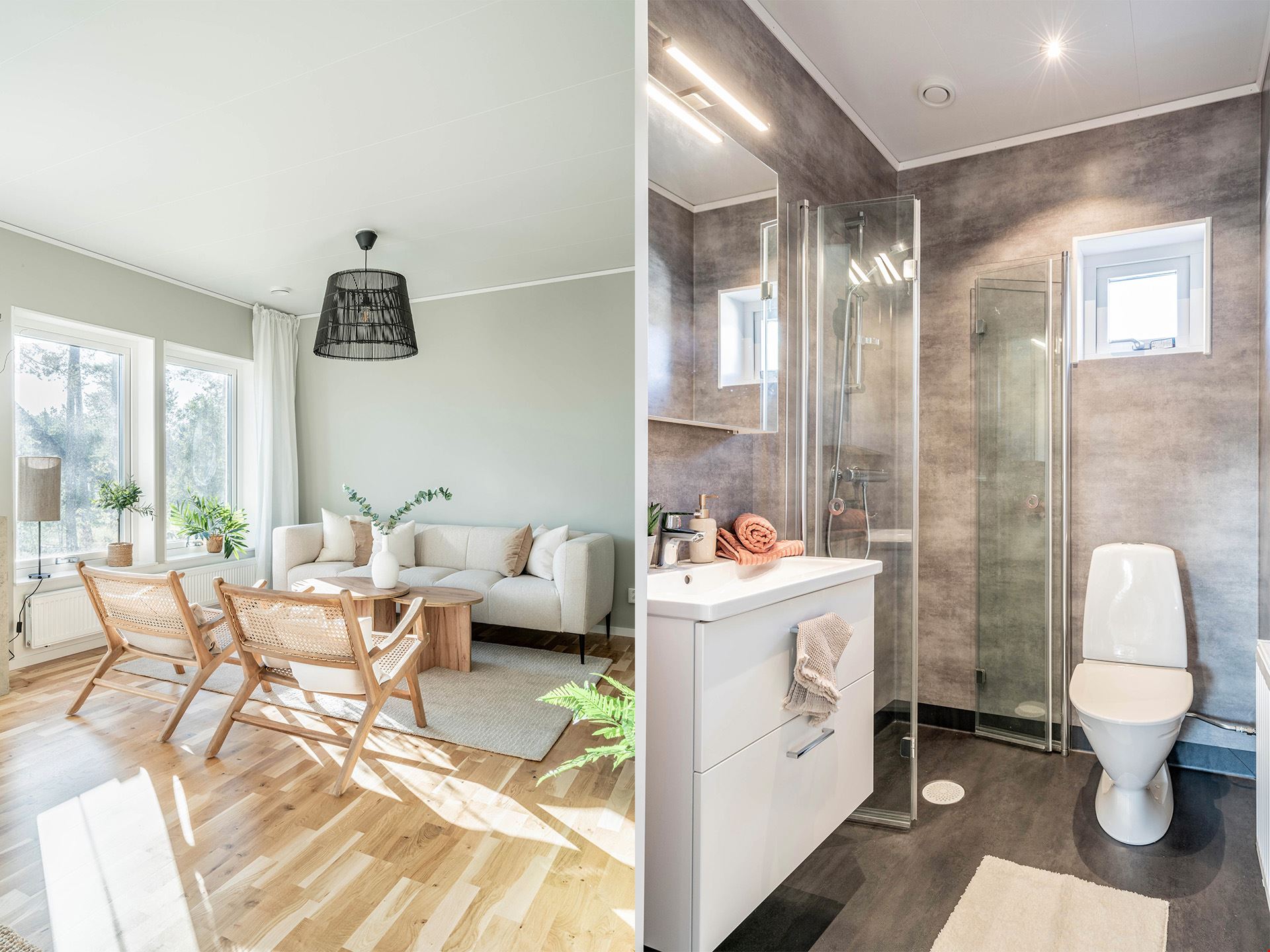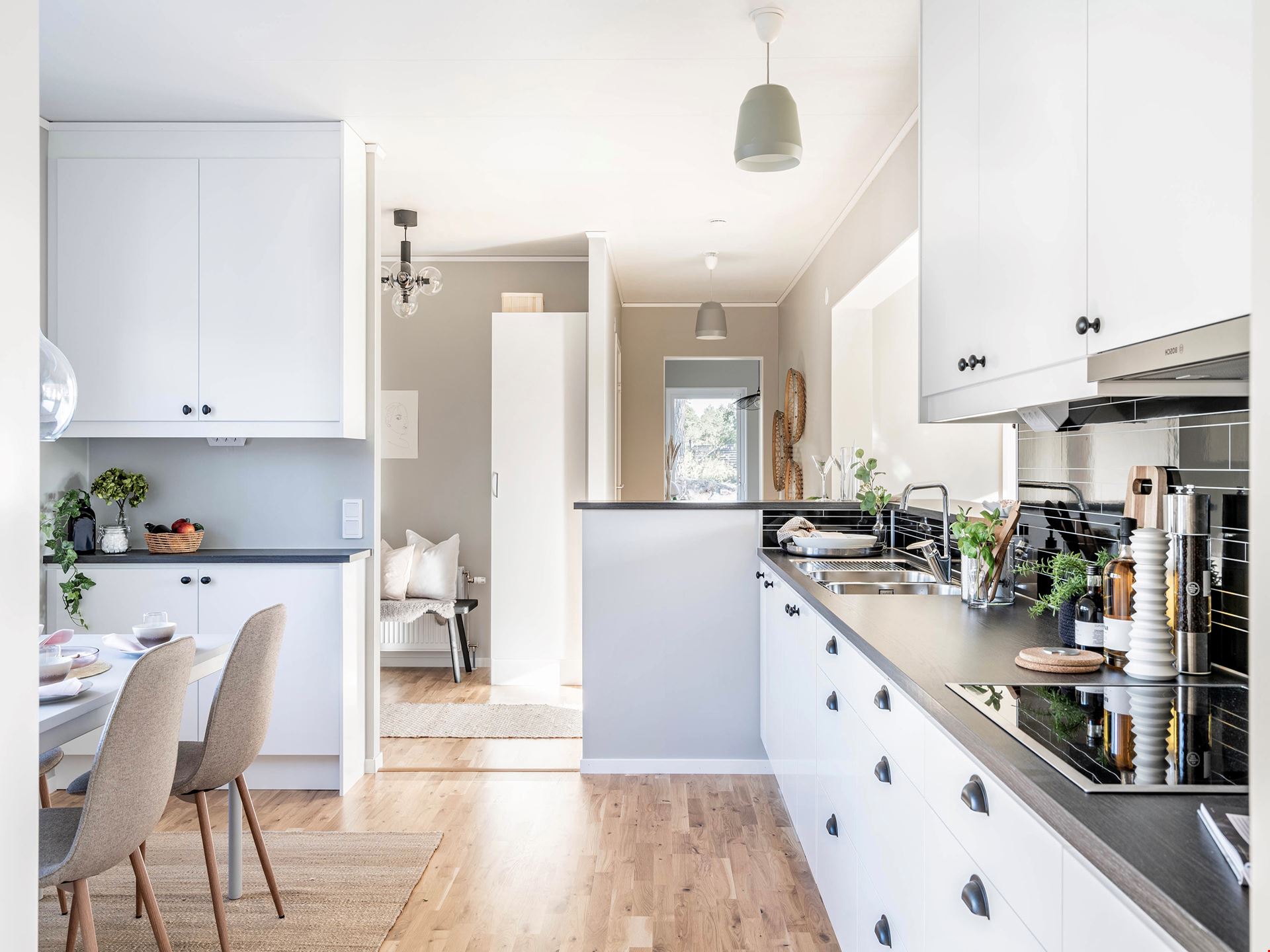 Köket kommer från Vedum och är ett inbyggnadskök med höga överskåp, fullutdragslådor, extra avställningsyta, integrerad diskmaskin, induktionshäll samt vit kyl och frys. Det stora badrummet är inrett med kakel och klinker, vit kommod, duschhörna och golvvärme. Det mindre badrummet är inrett med våtrumsmatta och vit kommod.