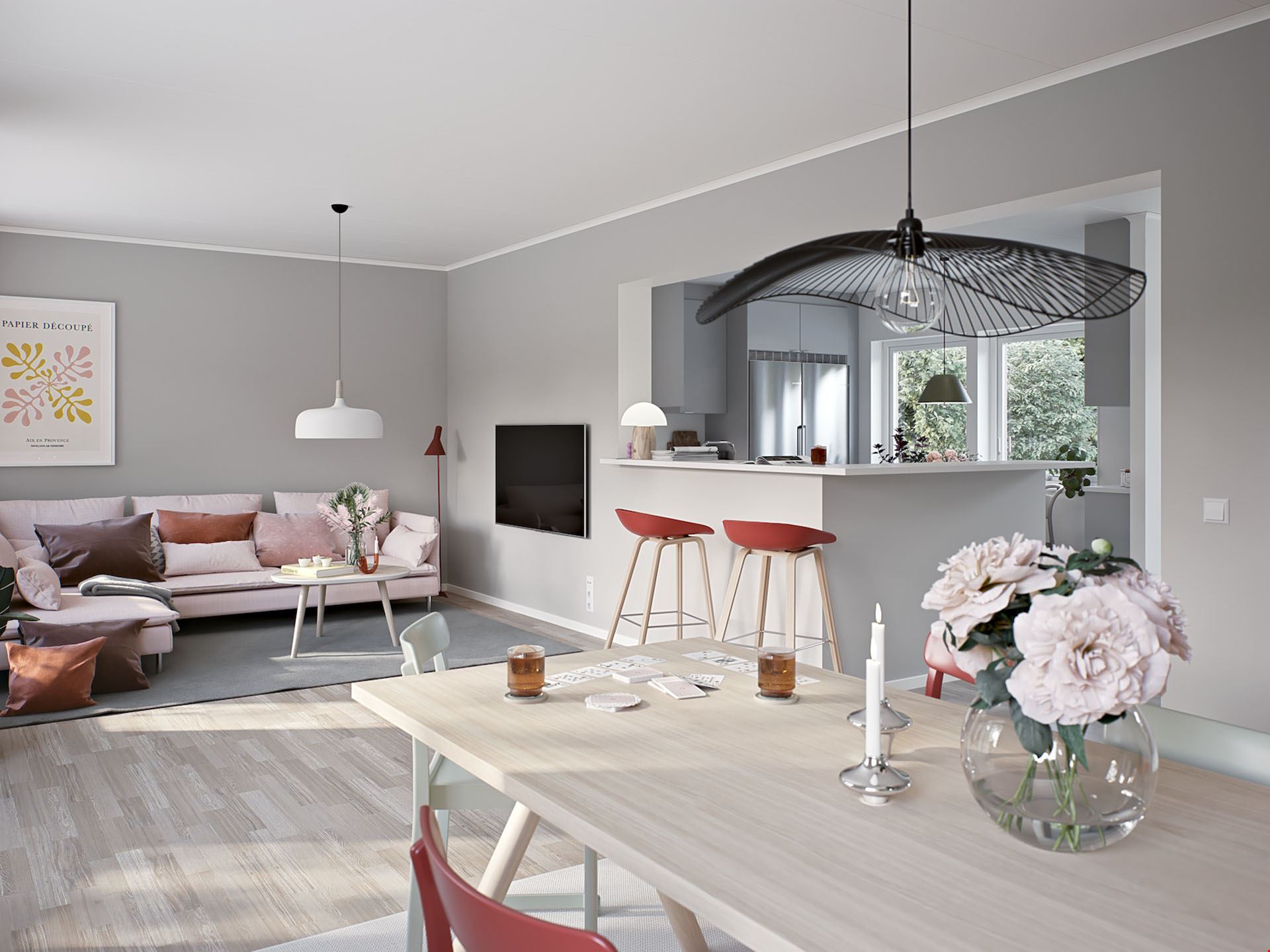 Favoriten Villa Fredriksdal bjuder på trivsamma och välplanerade kvadratmetrar i form av ett ljust, lättskött 1-planshus med rum för många olika husdrömmar. Här kan du nämligen välja mellan fem olika planlösningar. Villa Fredriksdal stoltserar både med egen barn- respektive vuxenavdelning, och med sociala ytor för både vardag och fest. Redan i entrén välkomnas du av ljuset, som kännetecknar hela huset. Rakt fram väntar vardagsrummet som är fint redan från början, och som kan bli oerhört maffigt om tre sovrum räcker för er. Här serveras också ett riktigt kök med plats för mysiga vardagsmiddagar och god kontakt med vardagsrummet via bardisken.
