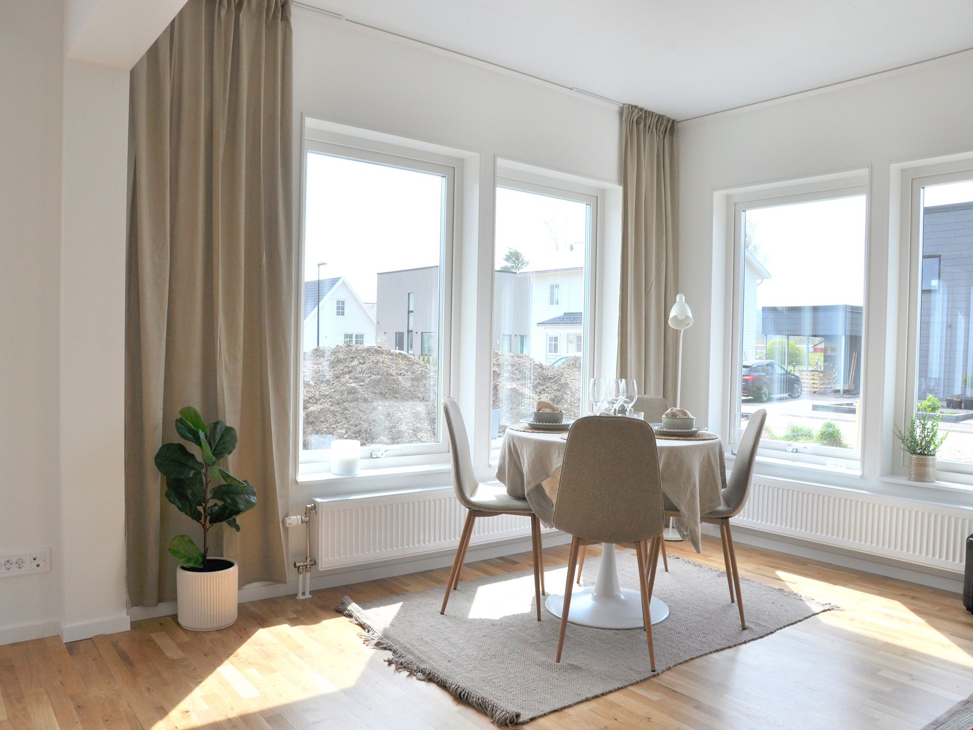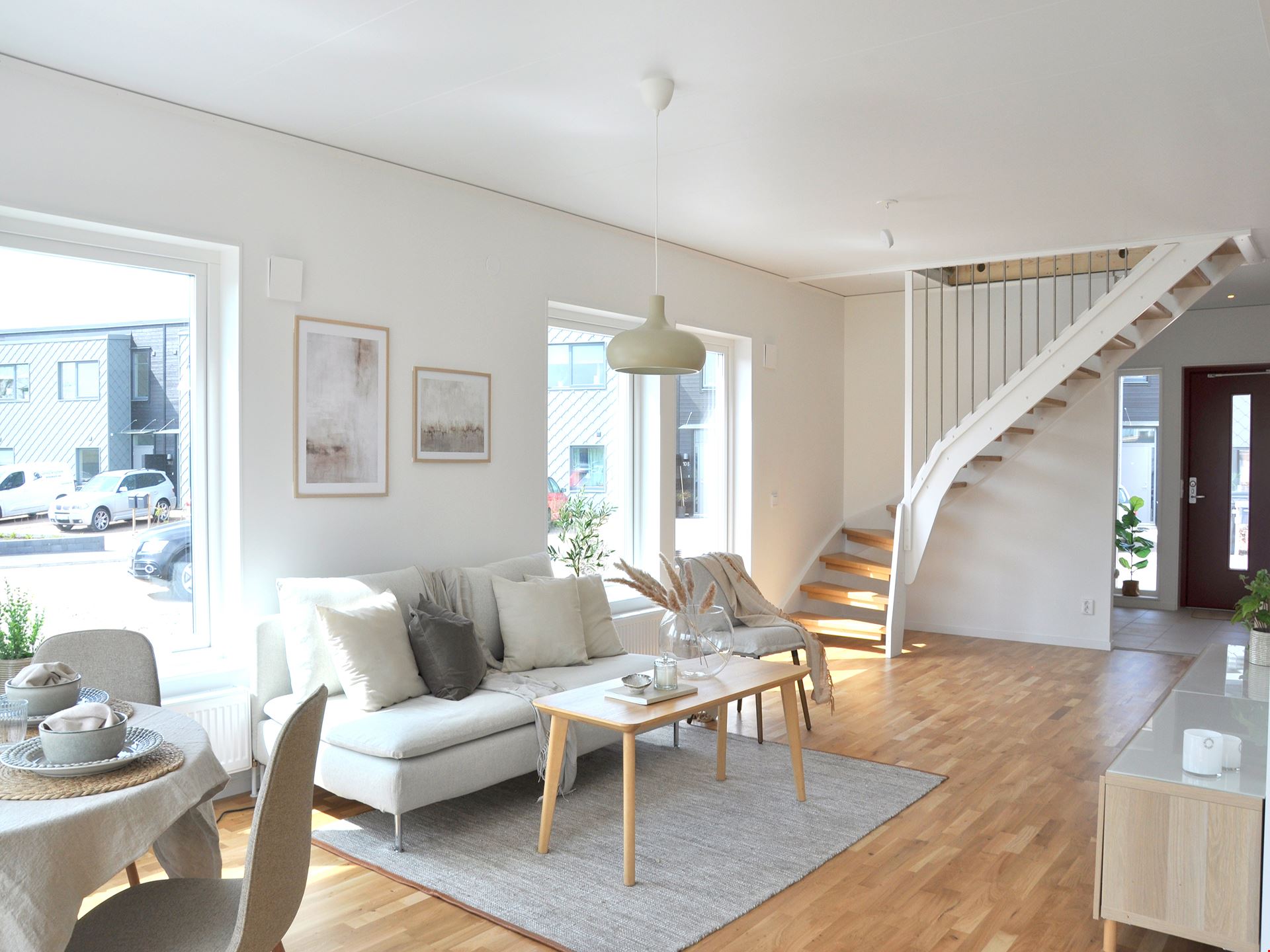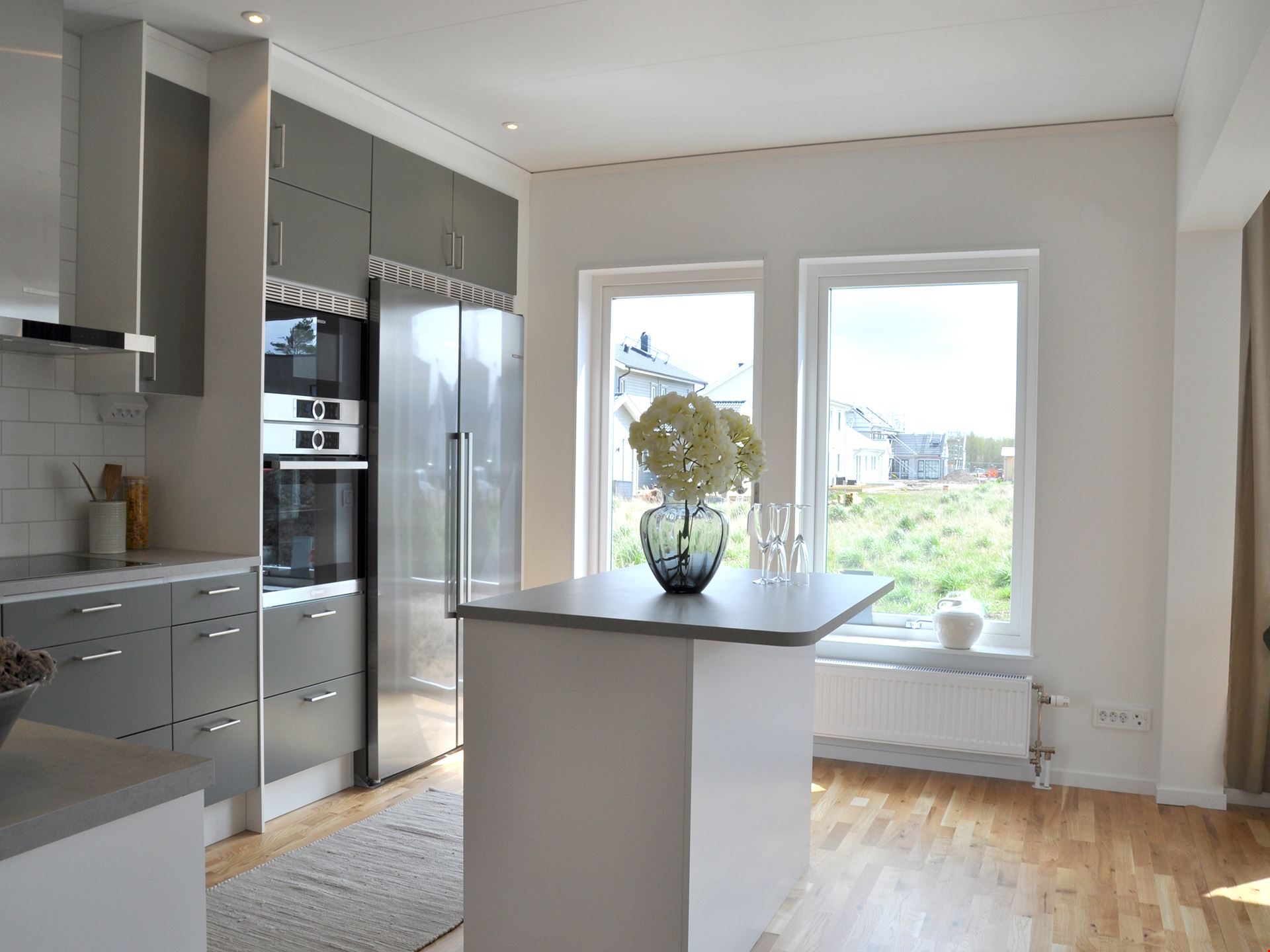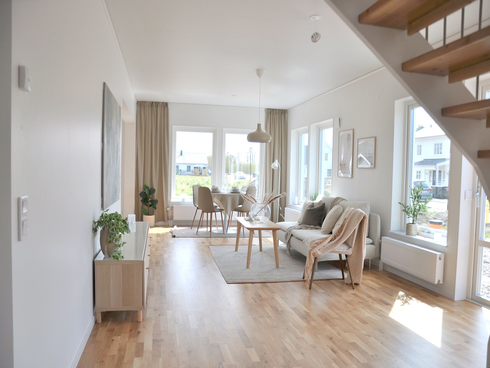 Från hallen tar du dig sedan vidare in till det stora vardagsrummet som är förberett med en trappa upp till det övre våningsplanet. I vardagsrummet finns det plats för såväl soffgrupp som matplats. Köket kommer från Vedum och är utrustat med vårt så kallade "lyxkök". Här får du ett kök med en köksö, höga överskåp, dämpade lådor, mjukstängande luckor, högskåp för inbyggd ugn och micro, integrerad diskmaskin, rostfria vitvaror, samt rostfri frihängande fläkt.