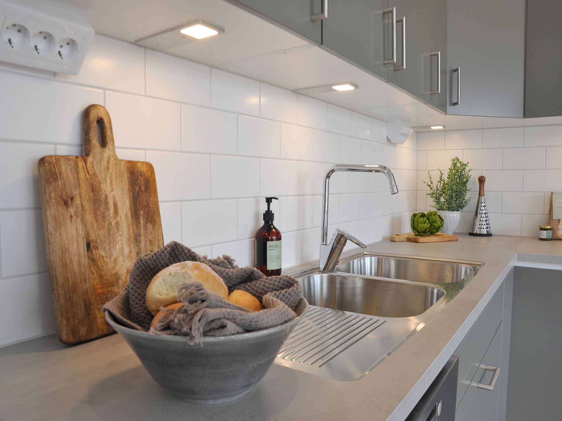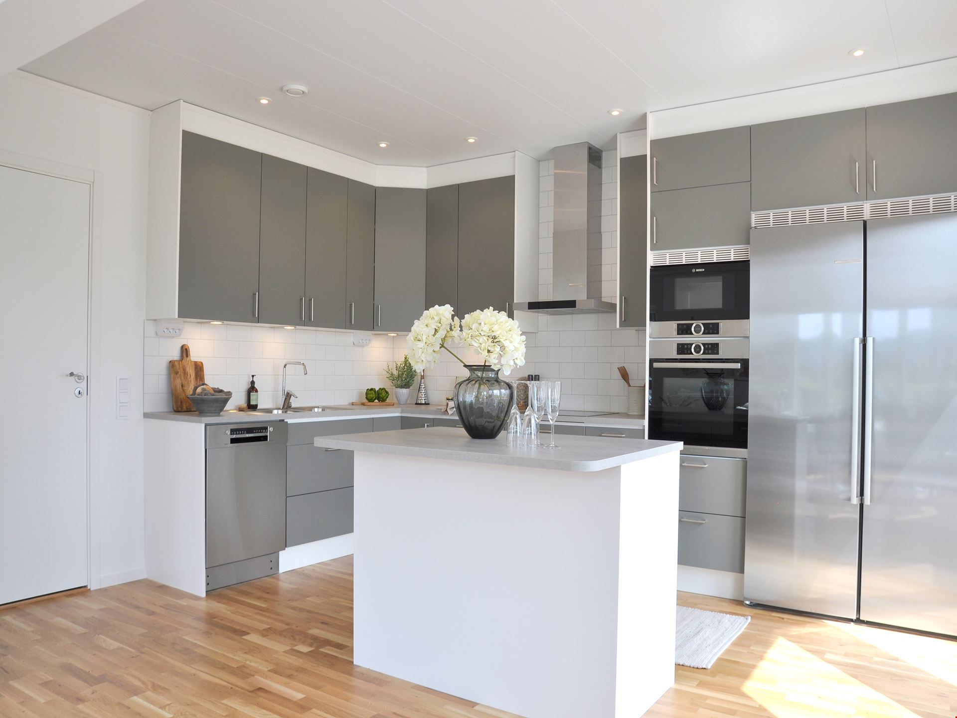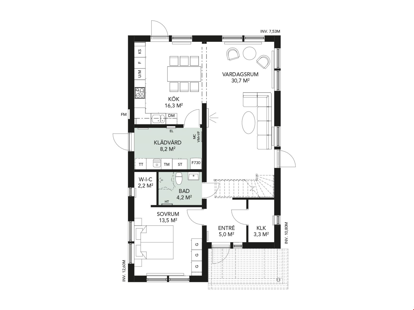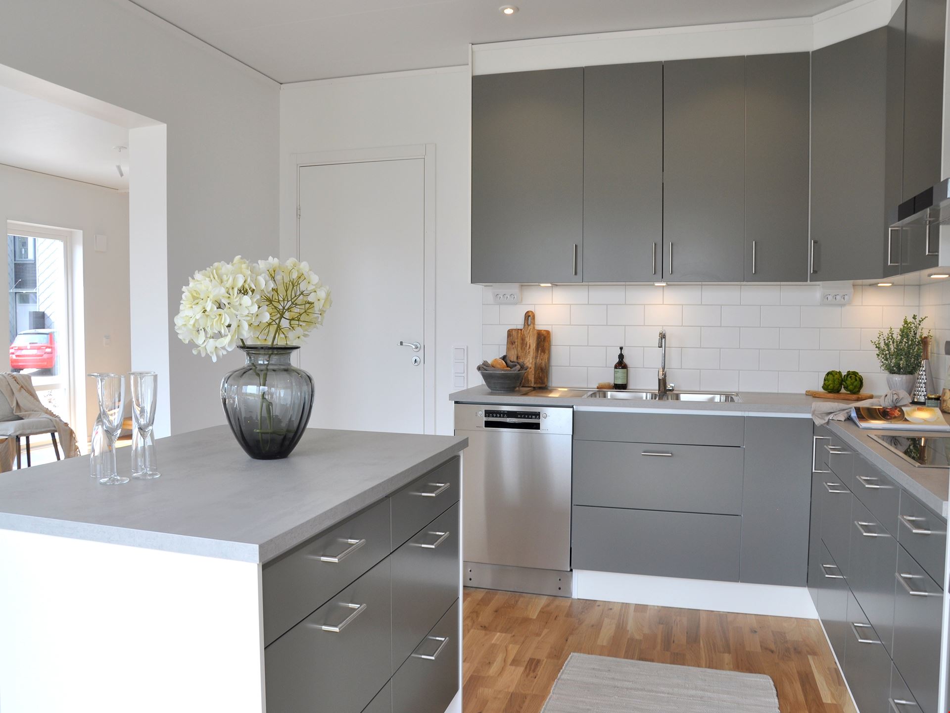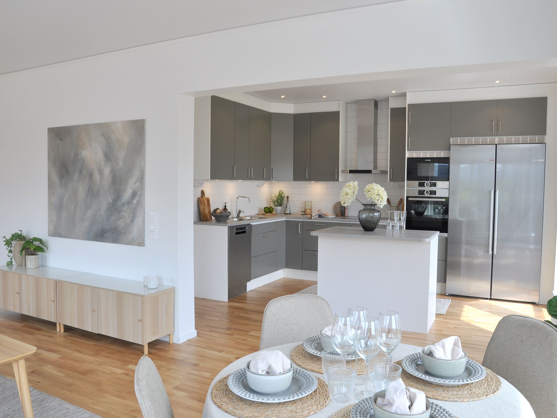 Från hallen tar du dig sedan vidare in till det stora vardagsrummet som är förberett med en trappa upp till det övre våningsplanet. I vardagsrummet finns det plats för såväl soffgrupp som matplats. Köket kommer från Vedum och är utrustat med vårt så kallade "lyxkök". Här får du ett kök med en köksö, höga överskåp, dämpade lådor, mjukstängande luckor, högskåp för inbyggd ugn och micro, integrerad diskmaskin, rostfria vitvaror, samt rostfri frihängande fläkt.
