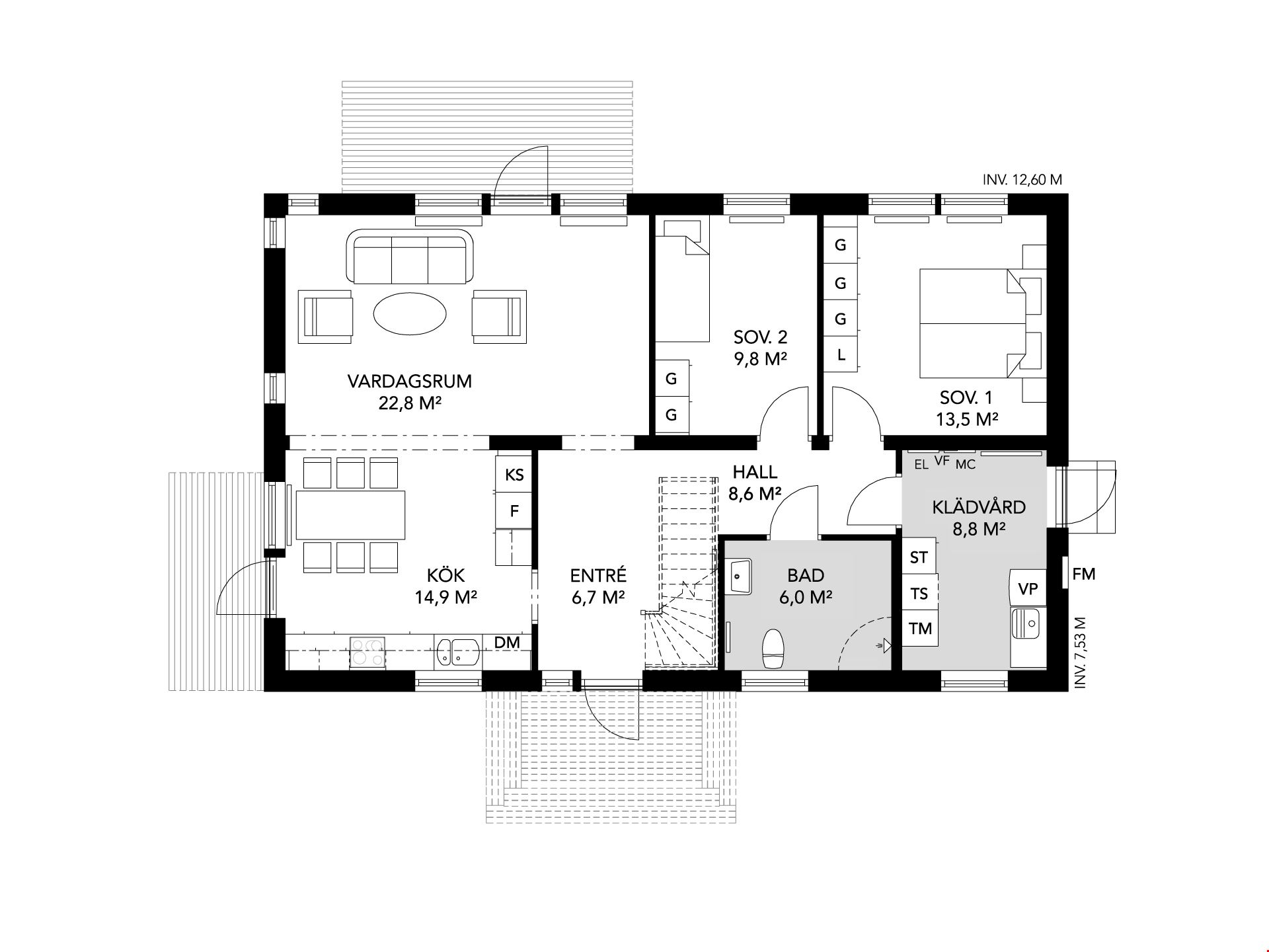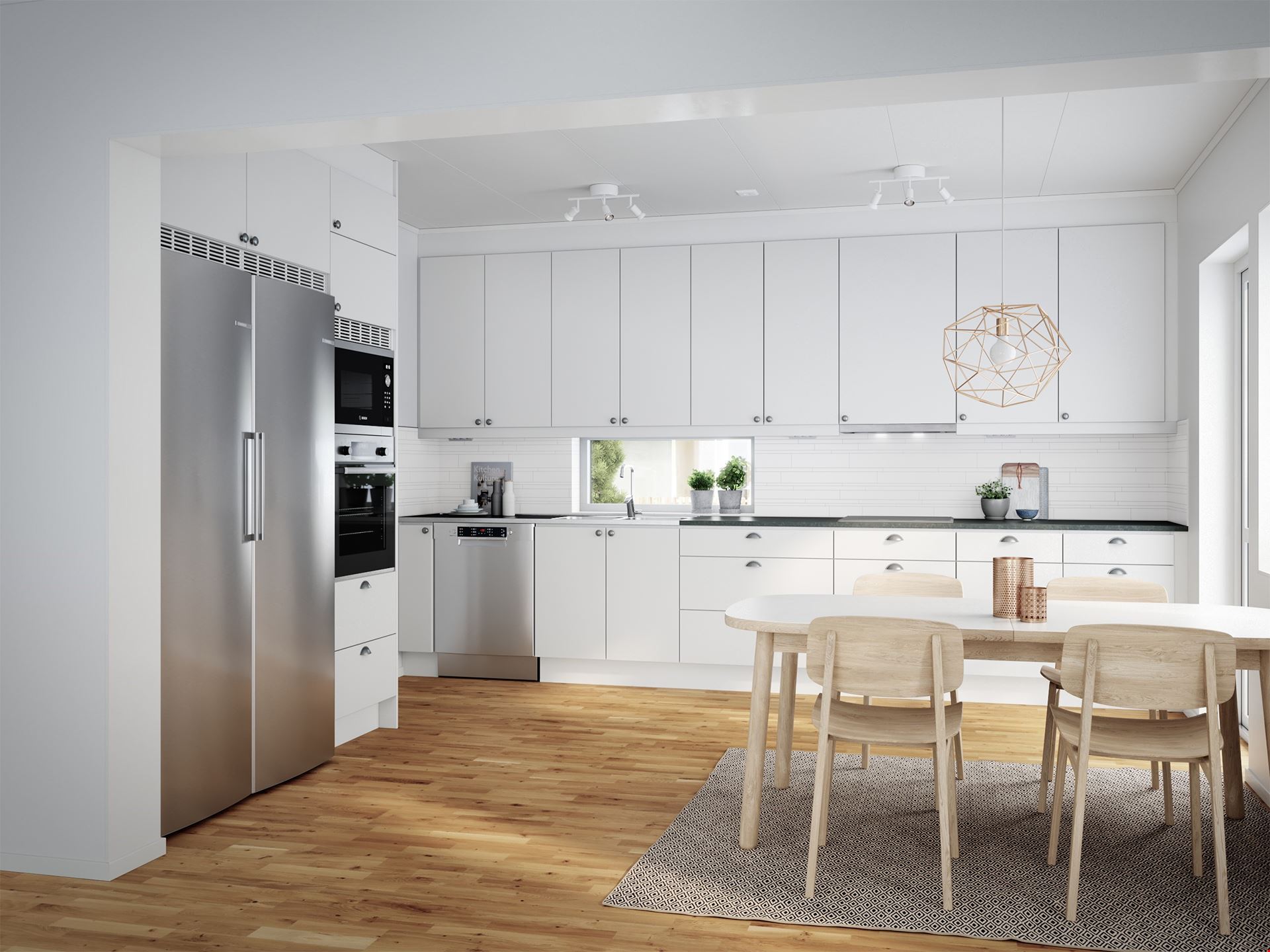 Huset fördelar sig på 95 kvm och består av tre rum och kök. Den öppna planlösningen mellan vardagsrum och kök skapar en känsla av rymd och gör det enkelt att umgås mellan rumsgränserna. Köket kommer från Vedum och levereras med vår nivå 2-standard, vilket innebär ett kök där förvaringsmöjligheterna är optimerade. Med inbyggnadsugn- och micro samt spishäll blir det plats för extra skåp och lådor. Vita, smakfulla luckor med laminerad bänkskiva i stenimitation matchas med ett vitt stänkskydd och ger köket en tidlös design. Maskinparken består av rostfri kyl, frys och diskmaskin, spishäll, inbyggd ugn, mikro samt fläkt. I andra änden av huset ligger ett generöst föräldrasovrum, ett mindre sovrum, tvättstuga och badrum samlat. Badrummet är inrett våtrumsmatta samt vid kommod.