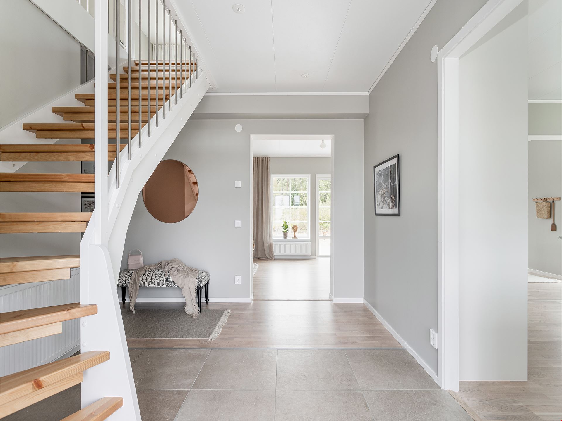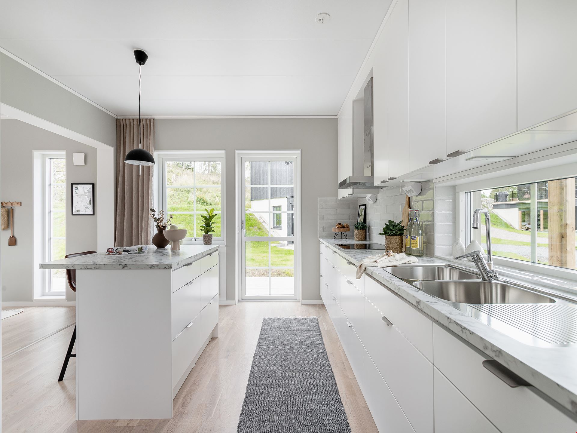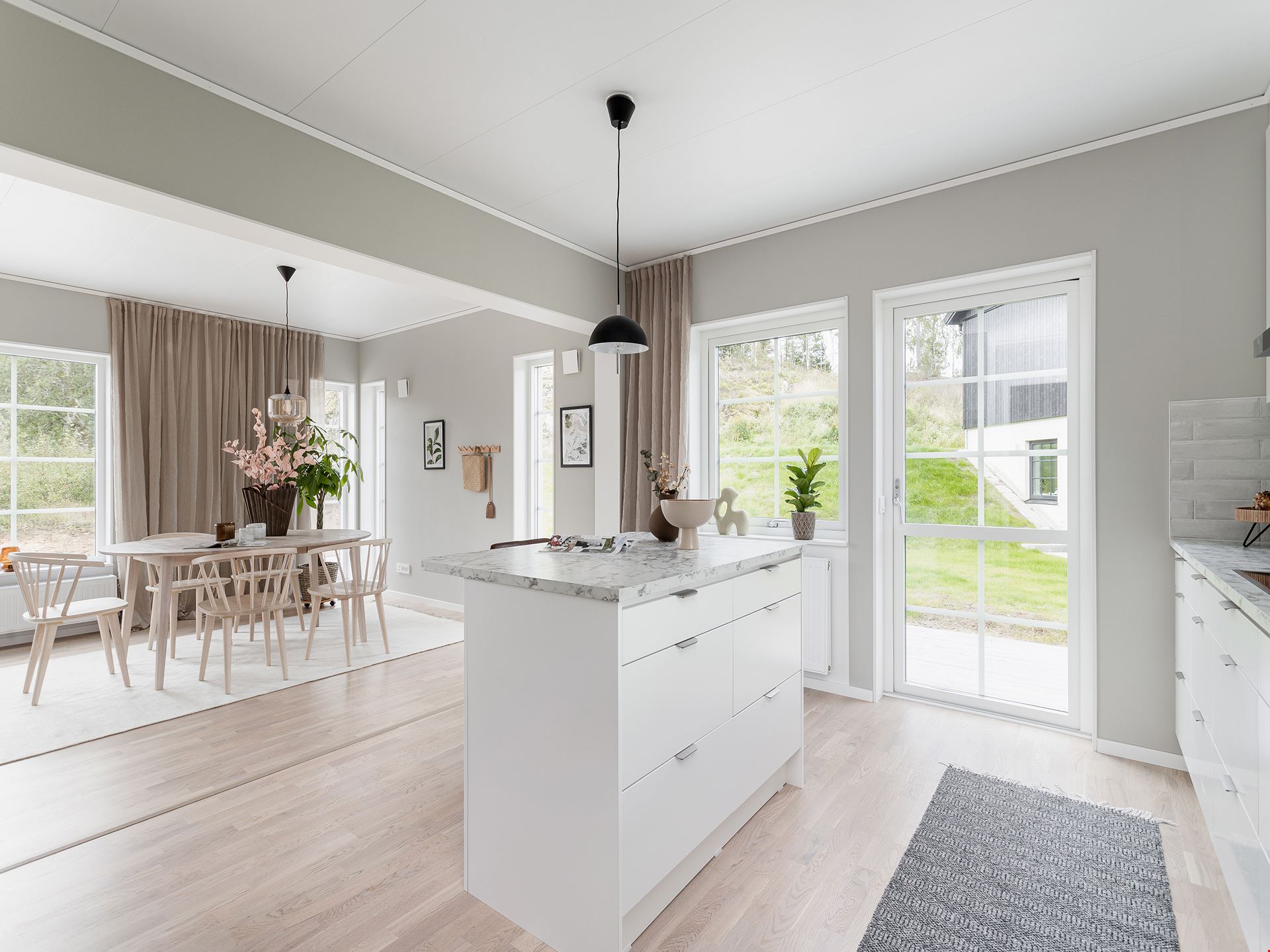 När du kliver in i det här huset möts du av en rymlig hall med fri sikt ut mot trädgården utanför. Vi smiter först in i köket, ett ljust och trivsamt sådant med bra arbetsytor och plats för matplats. Här finns också utgång till en stor och härlig altan, ett perfekt extrarum som förlänger sommaren.