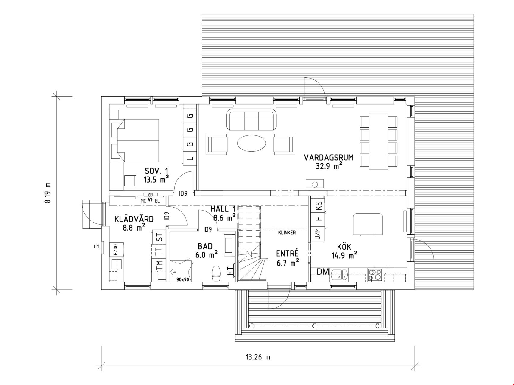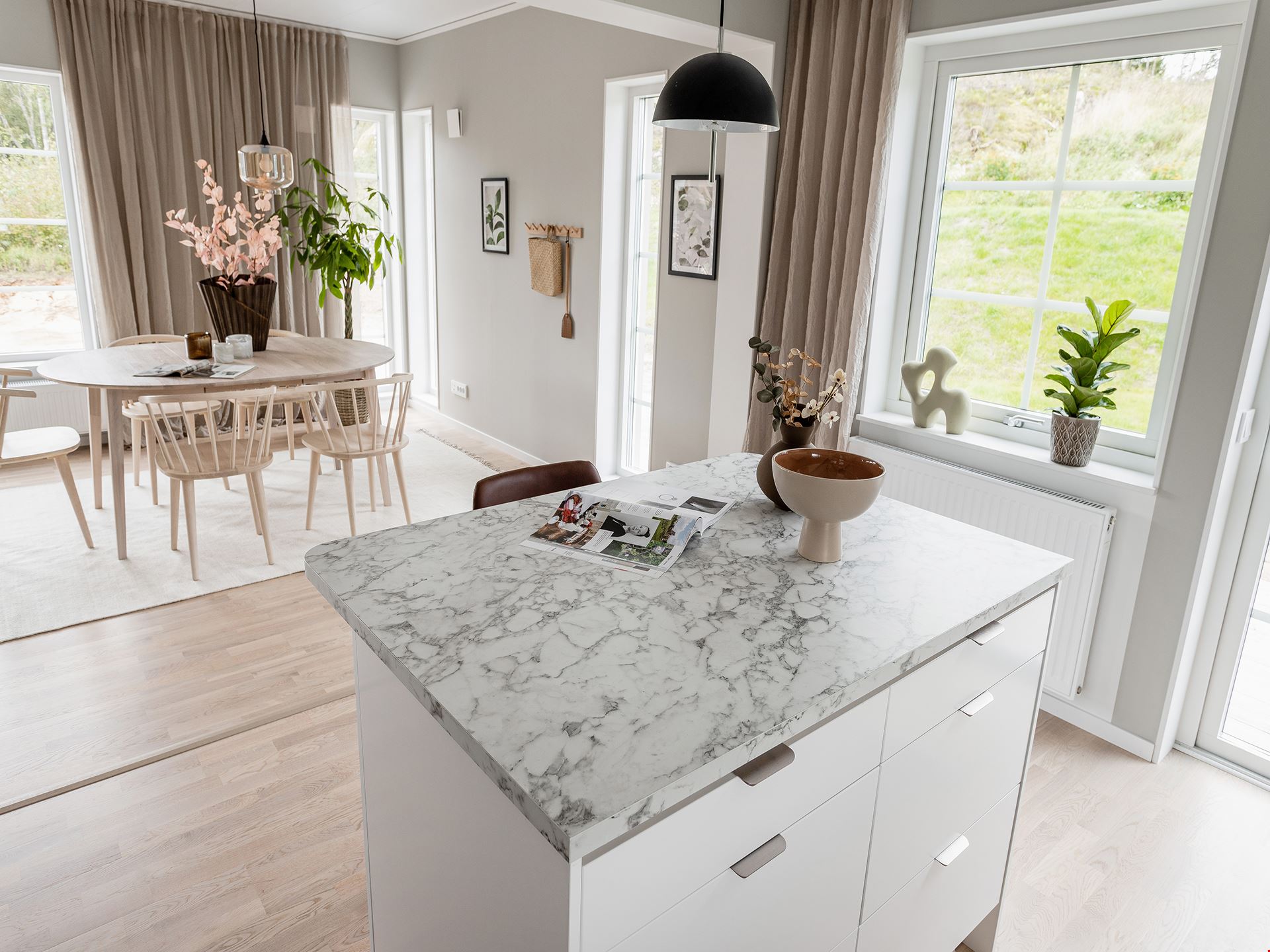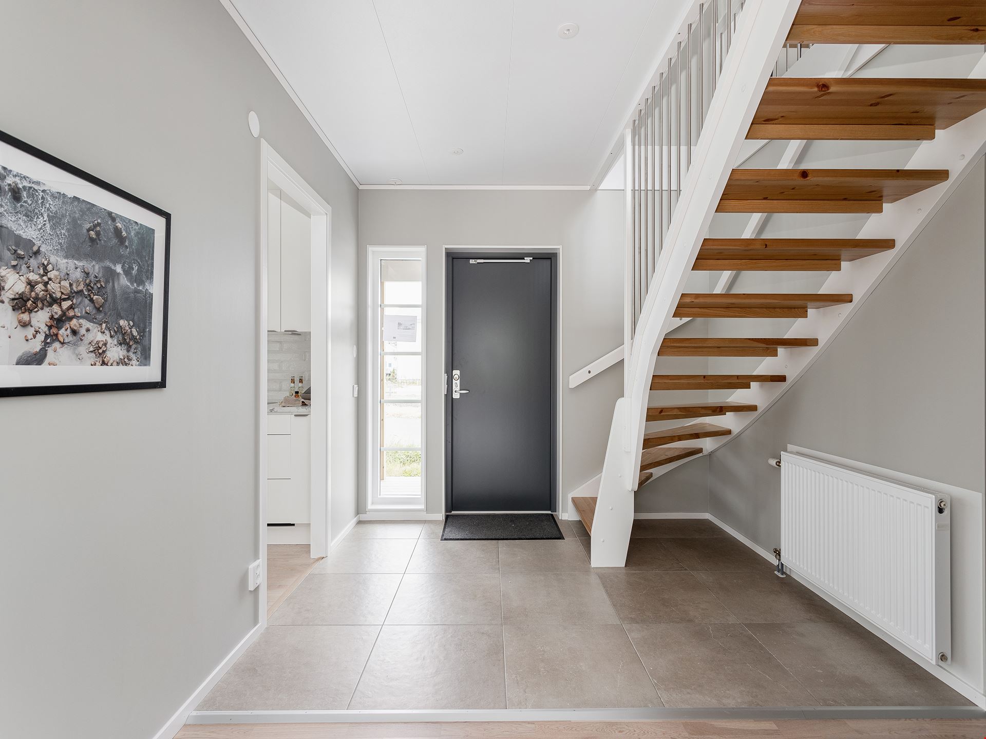 När du kliver in i det här huset möts du av en rymlig hall med fri sikt ut mot trädgården utanför. Vi smiter först in i köket, ett ljust och trivsamt sådant med bra arbetsytor och plats för matplats. Här finns också utgång till en stor och härlig altan, ett perfekt extrarum som förlänger sommaren.