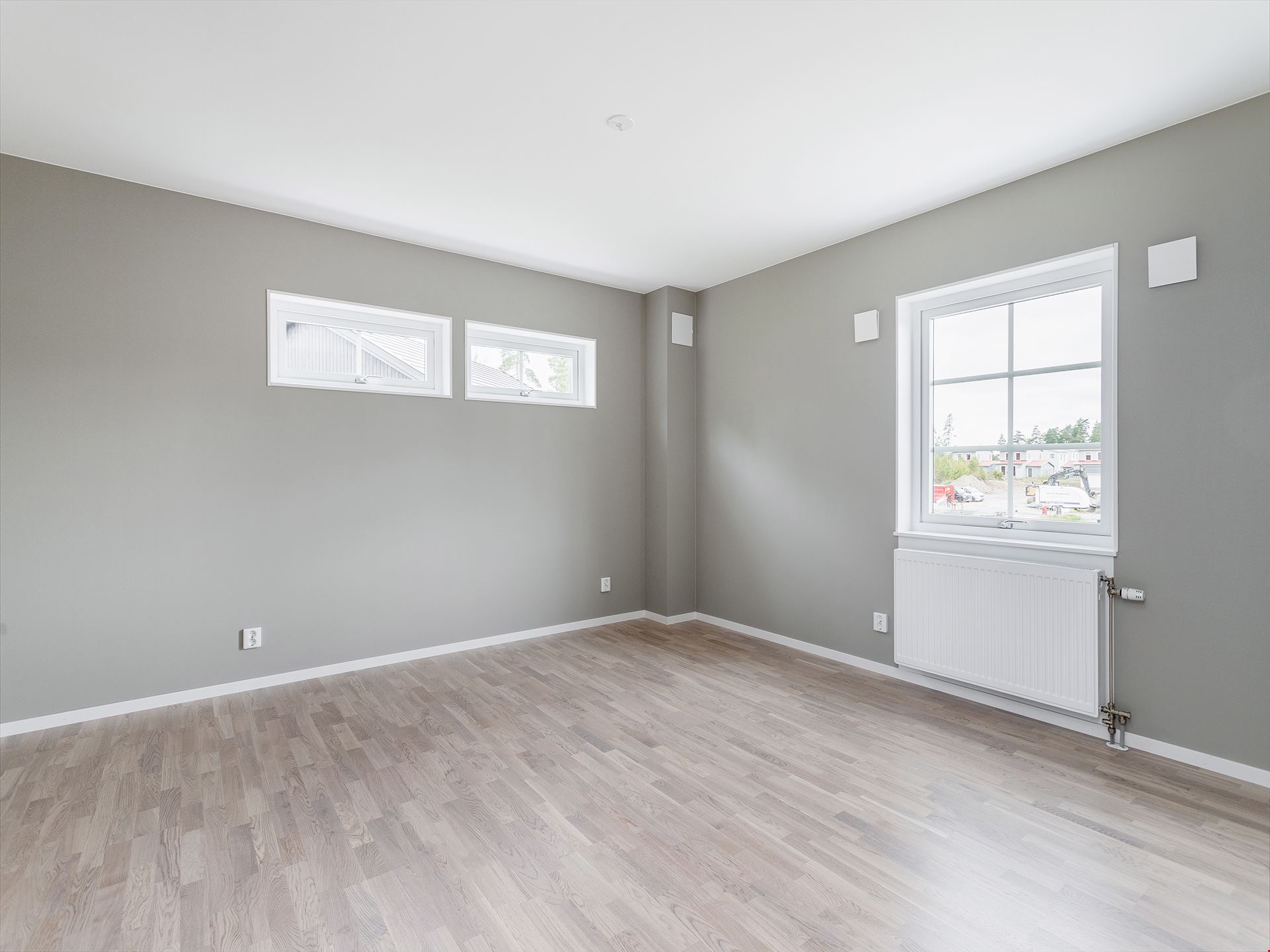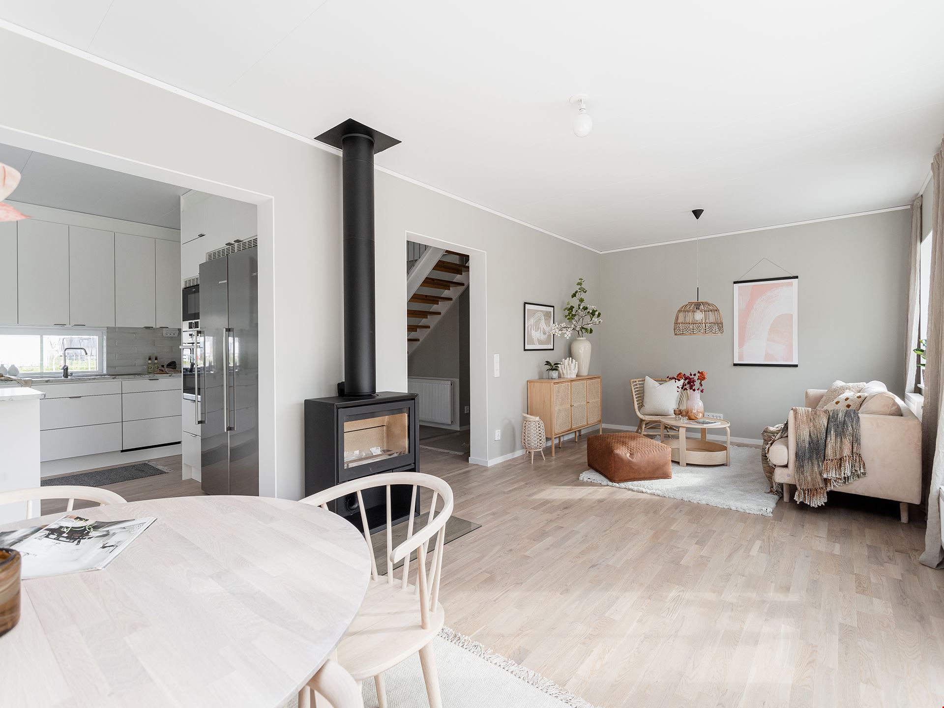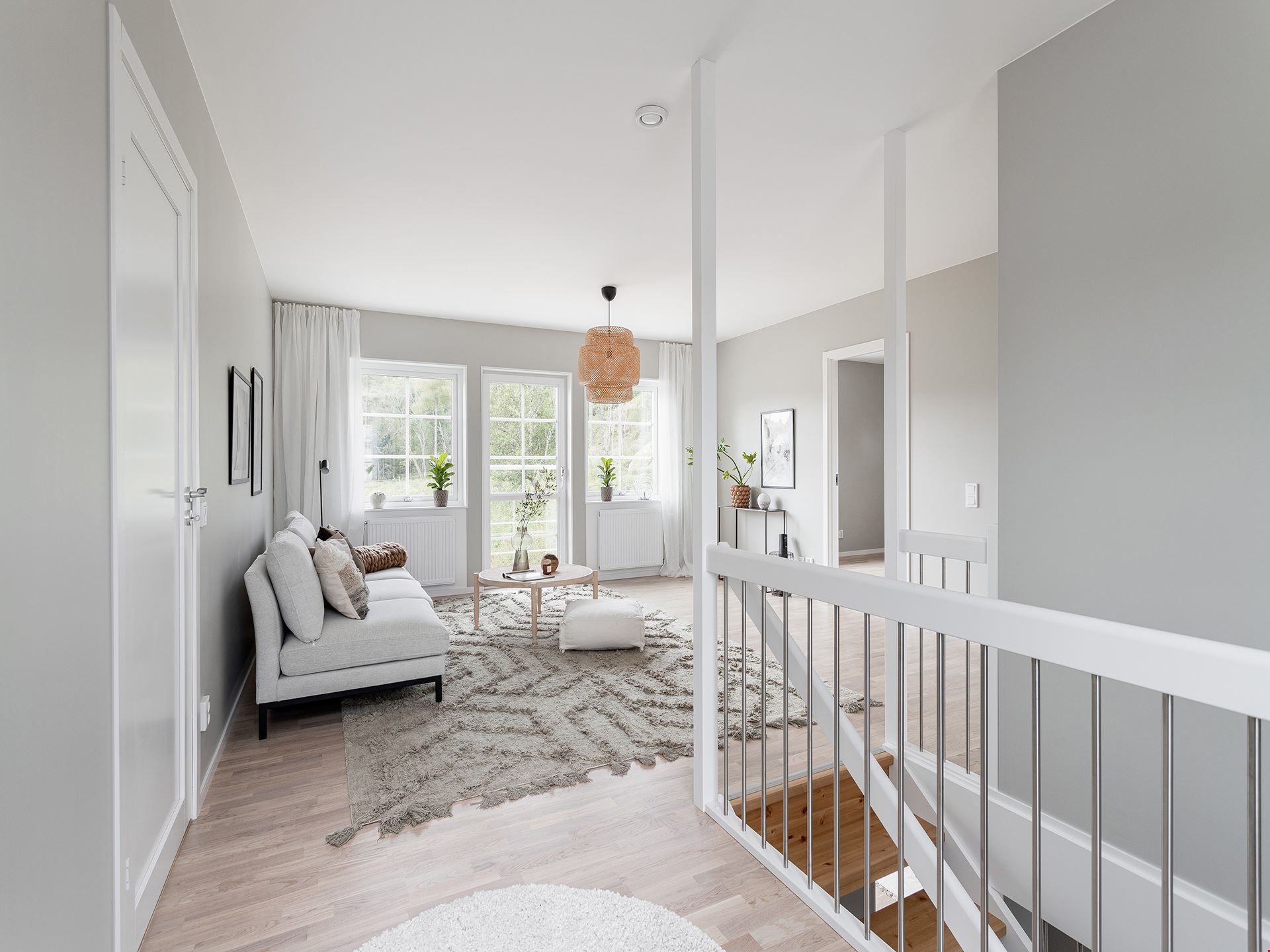 Köket ligger helt öppet mot det stora vardagsrummet som bjuder på ett fantastiskt ljusinsläpp och rymmer såväl matbord som soffgrupp utan problem. I andra änden av huset hittar du ett stort sovrum liksom husets tvättstuga – med praktisk groventré – och ditt nya, fräscha badrum. På husets övervåning finns gott om plats för familjens privata liv. Bortsett från de tre sovrummen finns där även ett trevligt allrum, en klädkammare och ett badrum.