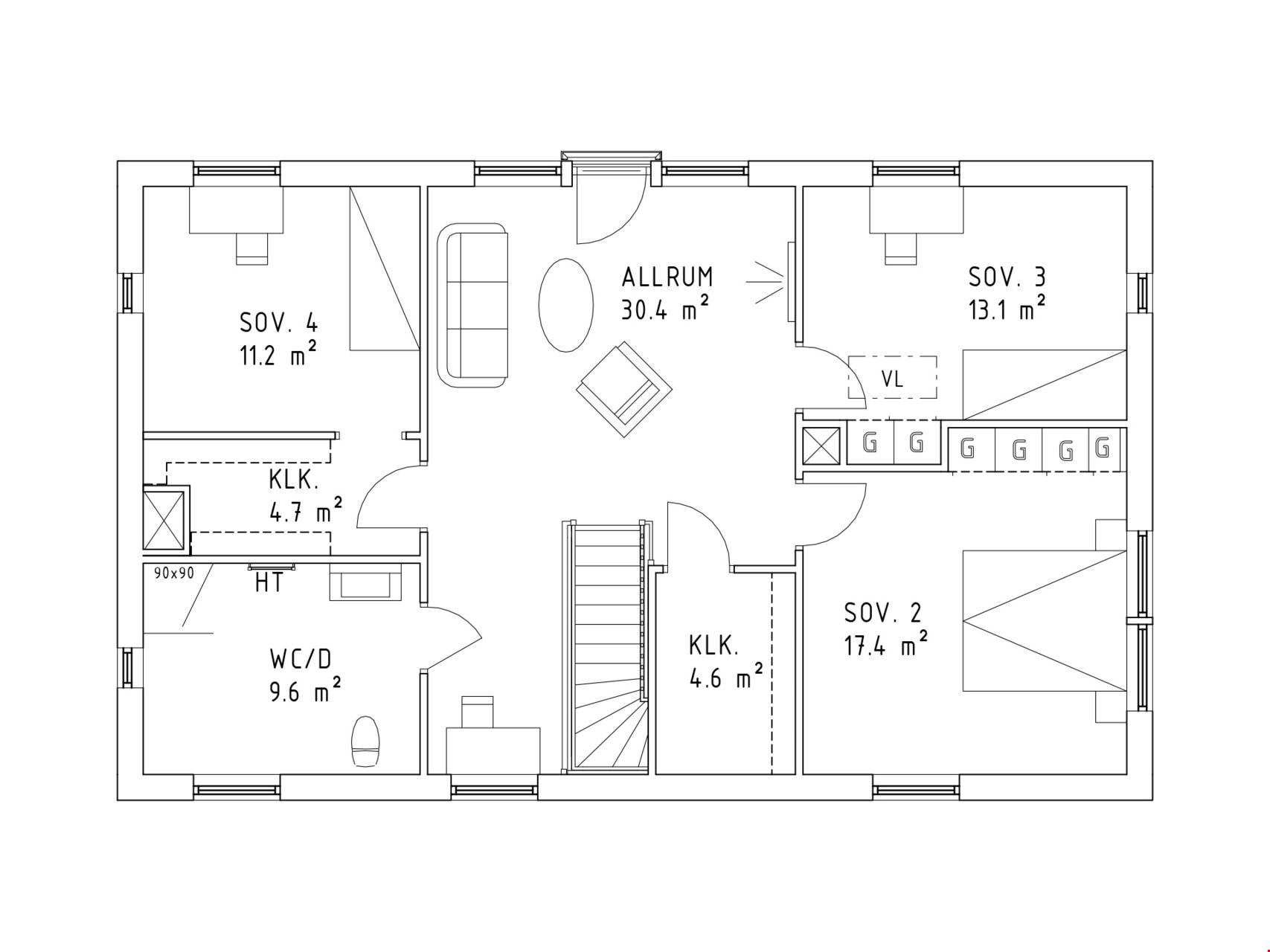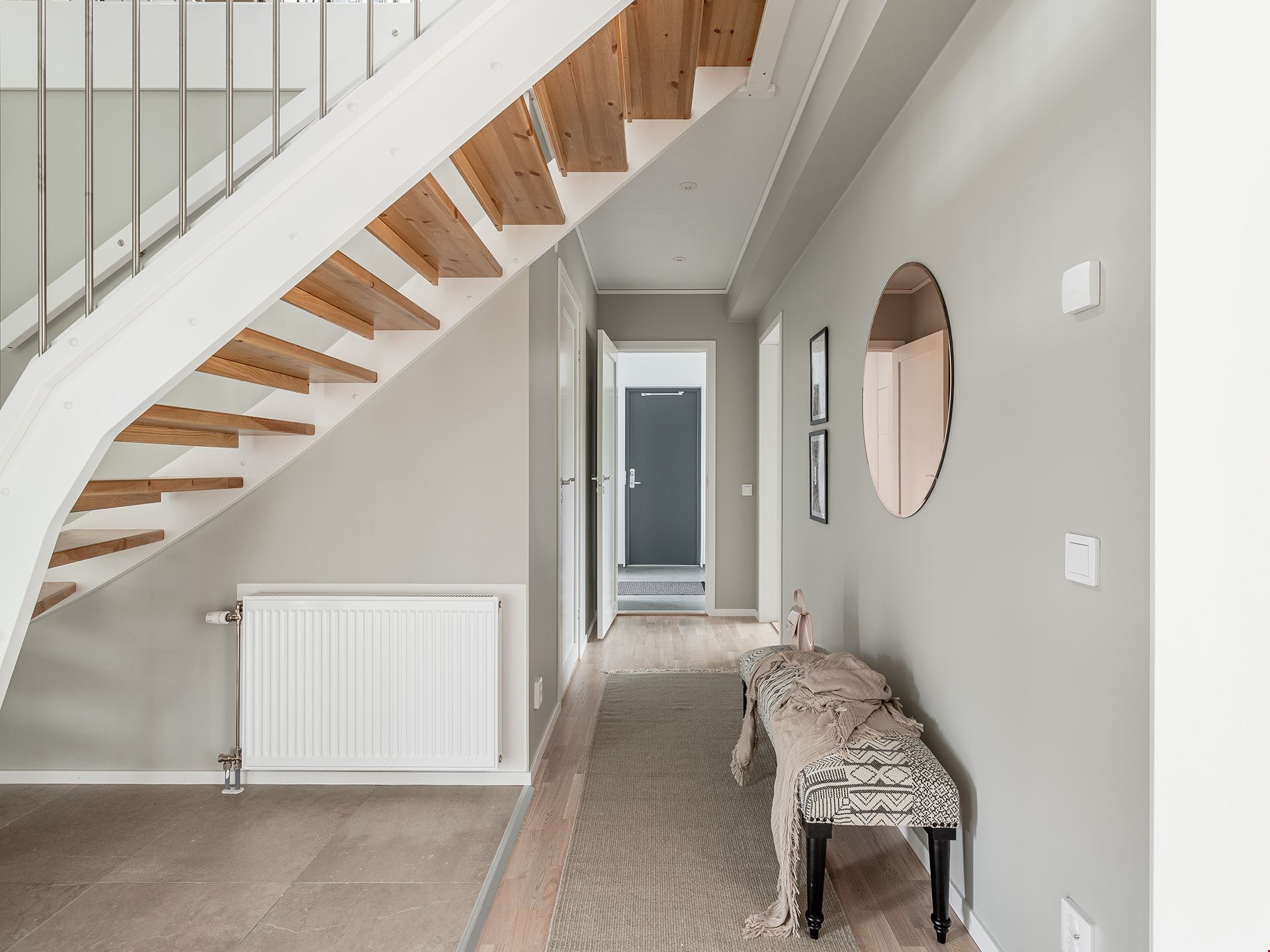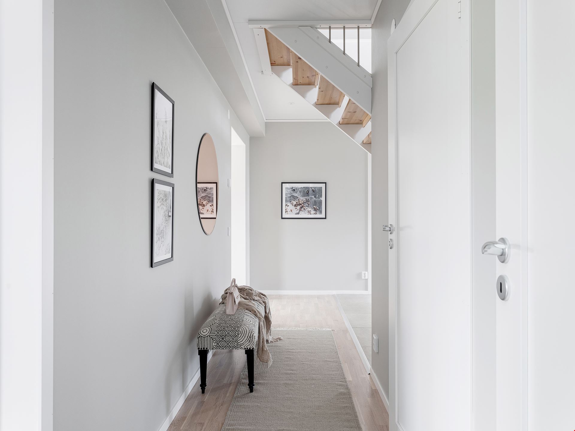 Köket ligger helt öppet mot det stora vardagsrummet som bjuder på ett fantastiskt ljusinsläpp och rymmer såväl matbord som soffgrupp utan problem. I andra änden av huset hittar du ett stort sovrum liksom husets tvättstuga – med praktisk groventré – och ditt nya, fräscha badrum. På husets övervåning finns gott om plats för familjens privata liv. Bortsett från de tre sovrummen finns där även ett trevligt allrum, en klädkammare och ett badrum.