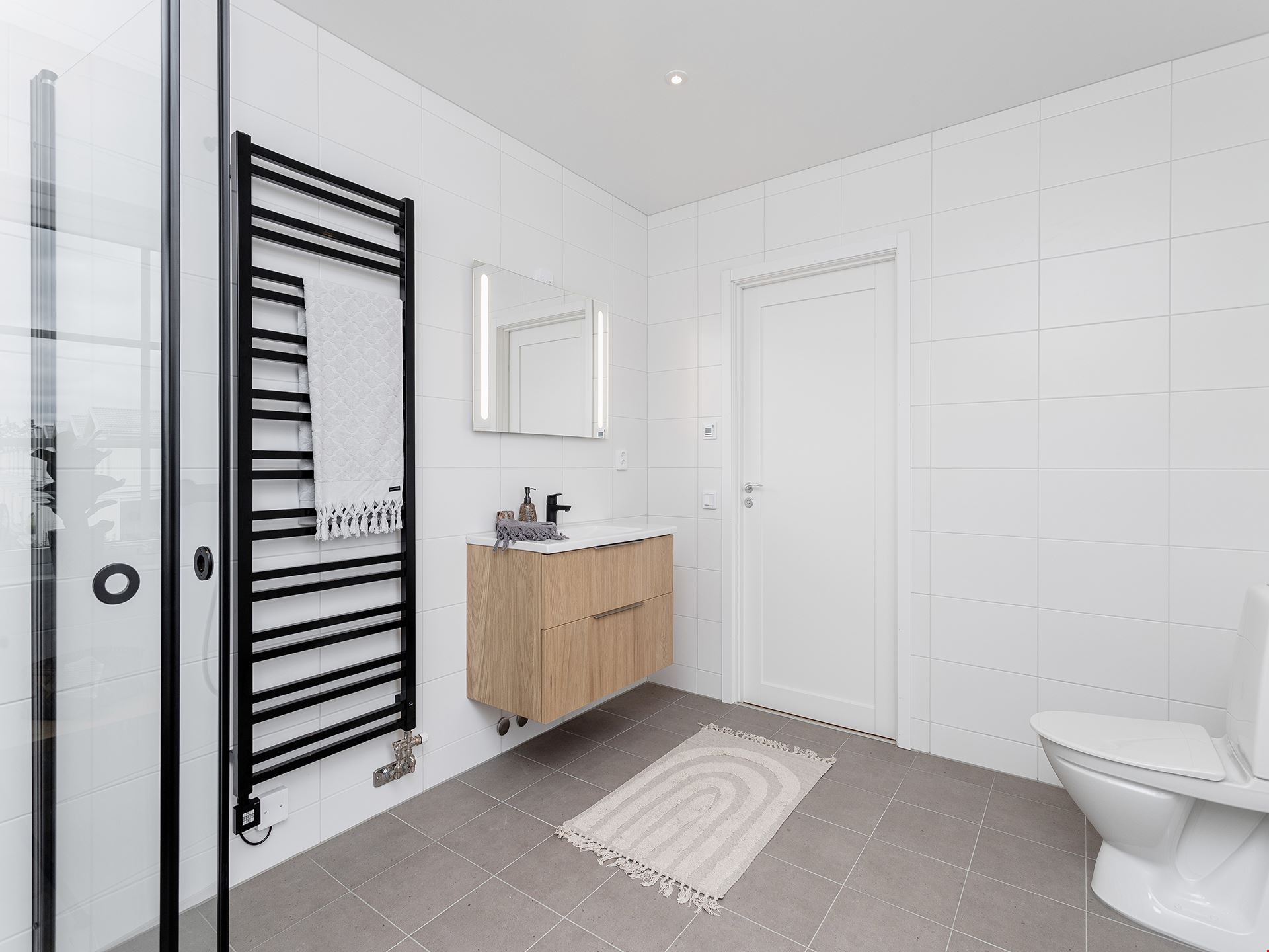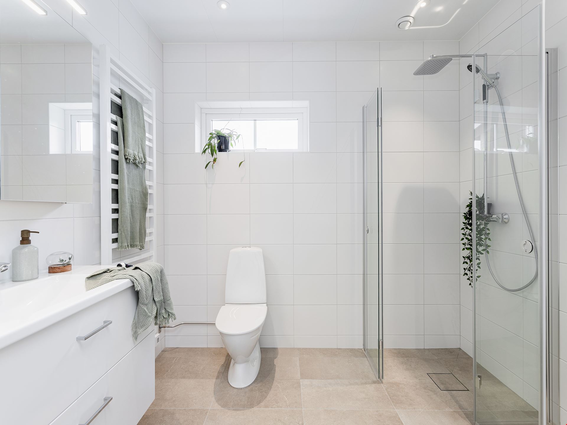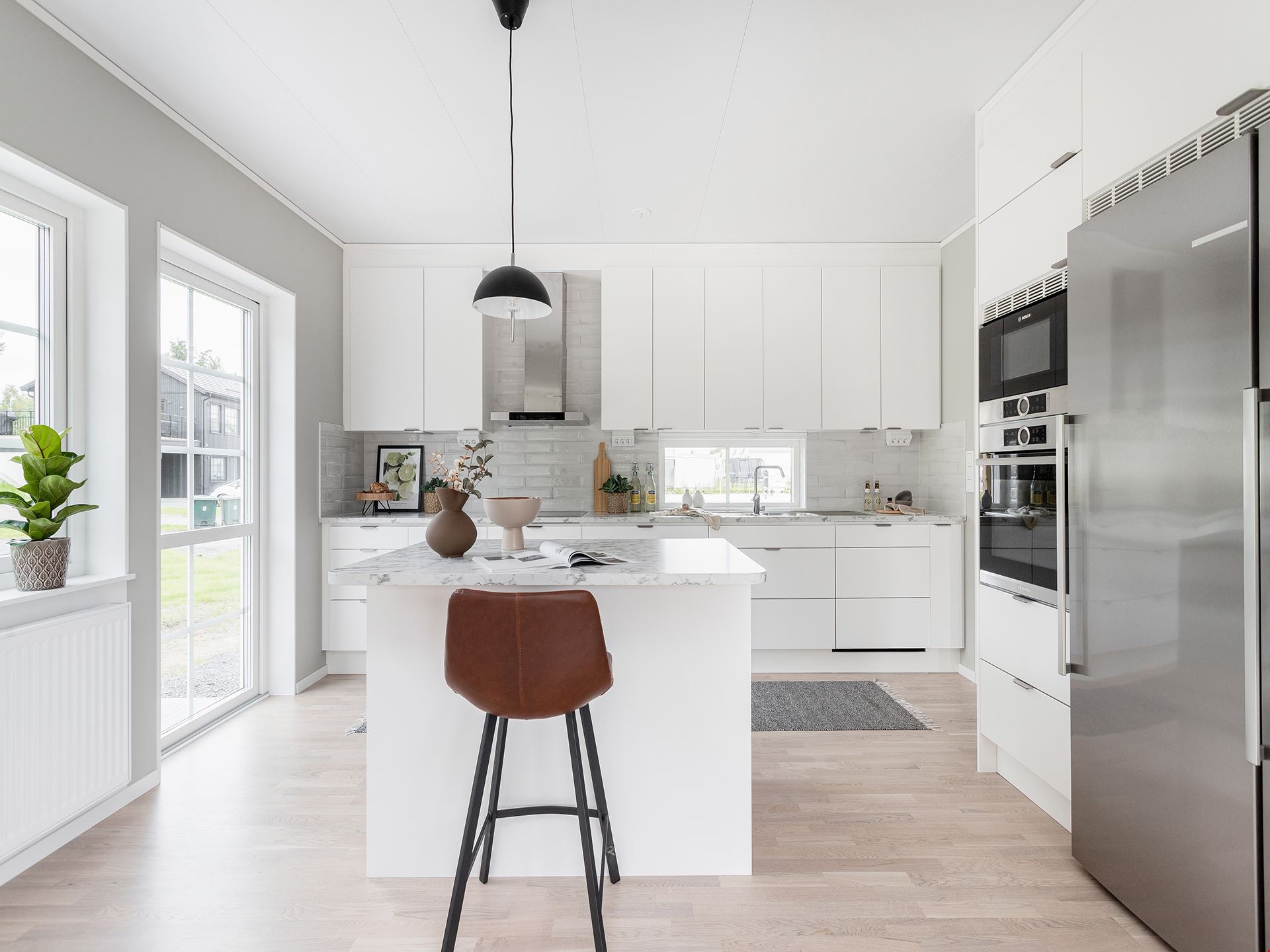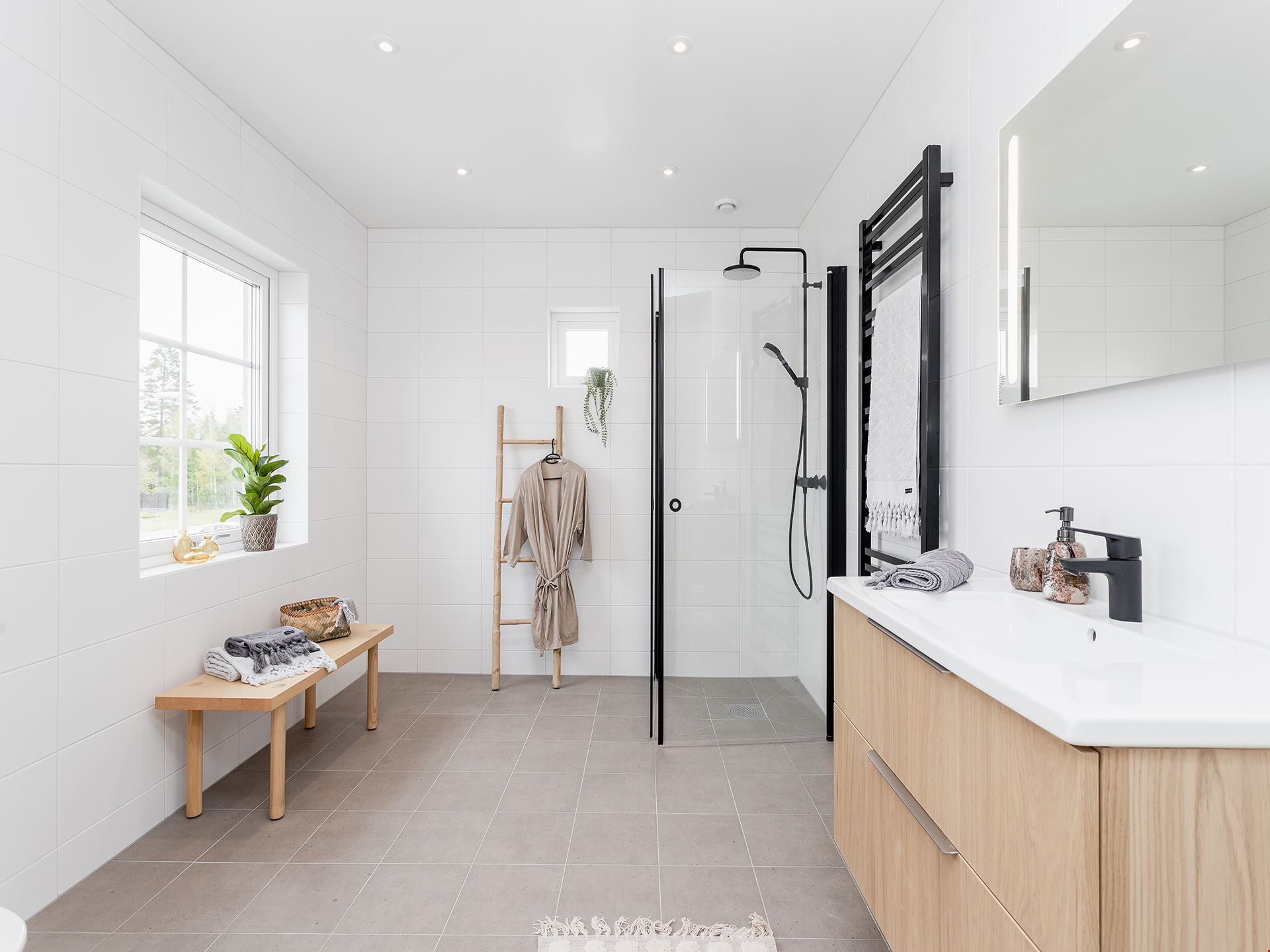 Här behöver du inte krångla med mängder av tillval. Vi har vi valt vårt lyxigaste kök från Vedum, med höga överskåp, dämpade lådor, mjukstängande luckor, inbyggd ugn och mikro i högskåp, integrerad diskmaskin, rostfria vitvaror och vägghängd fläkt. Alla vitvaror kommer från Bosch. Badrummen bjuder på kakel och klinker med komfortgolvvärme, inredning från Vedum och en stilren duschhörna – och i tvättstugan väntar både tvättmaskin och torktumlare på att ta hand om din tvätt.
