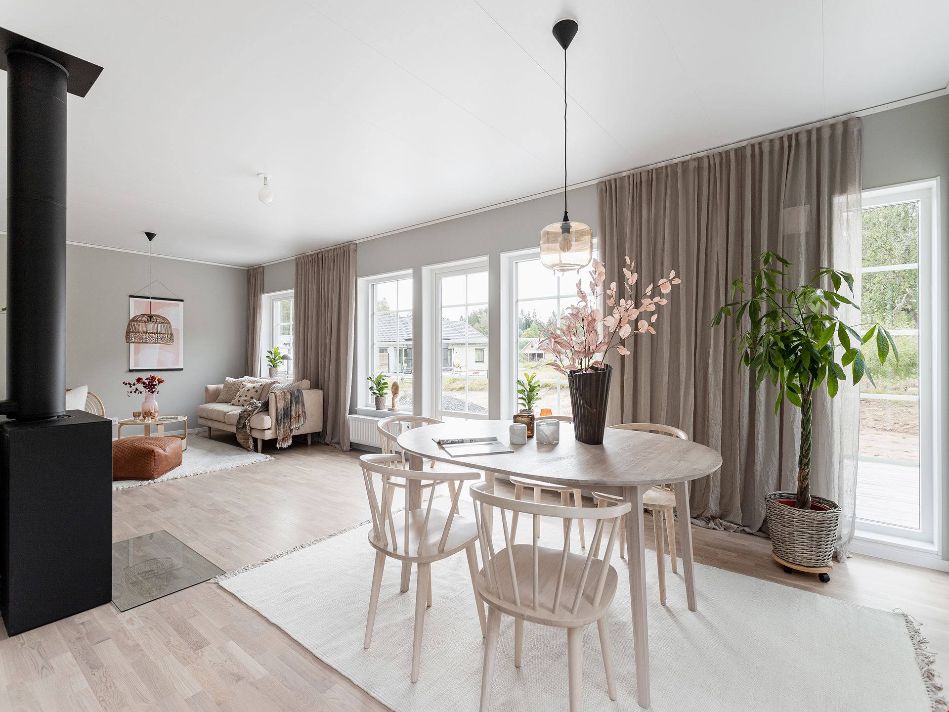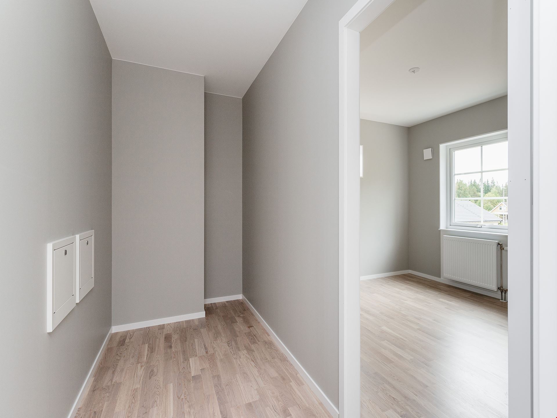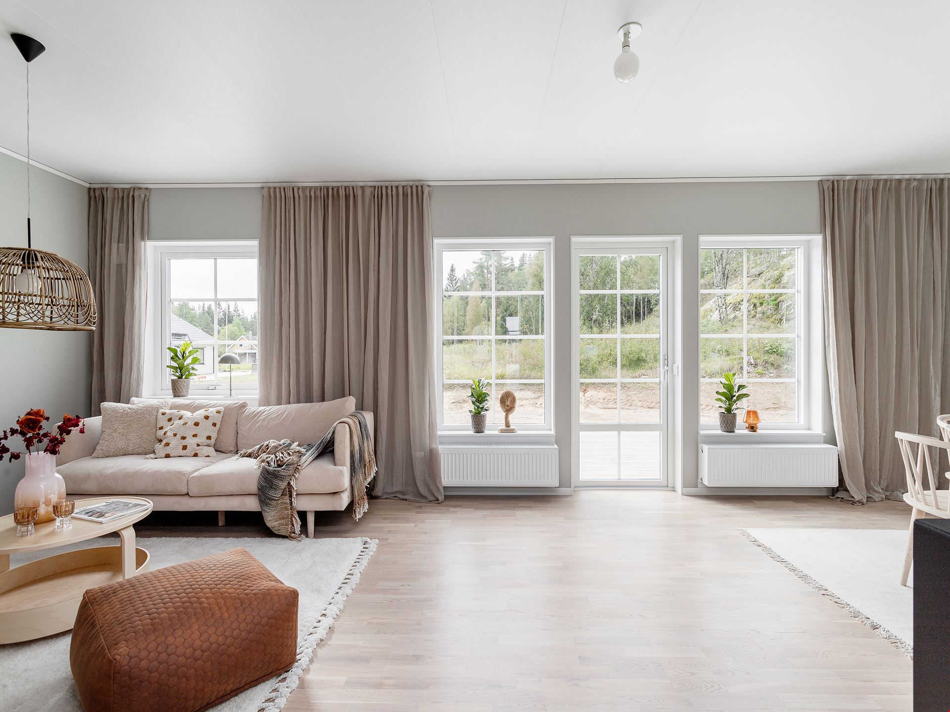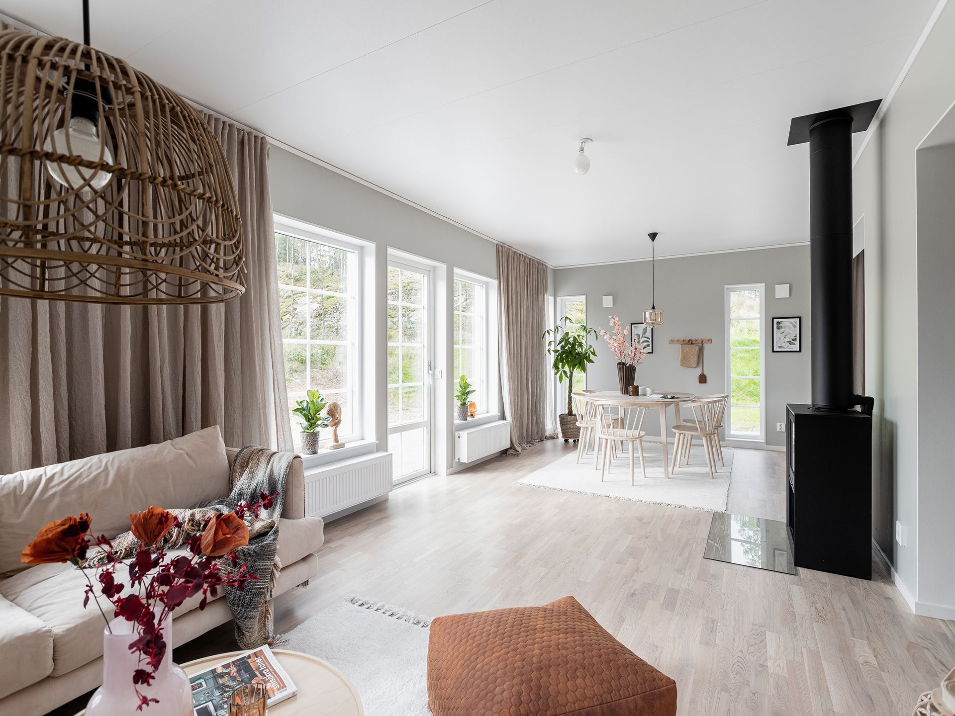 Villa Huskvarna är en av våra mest populära husmodeller. Här får det liggande panel och mellangrått tak. Insidan bjuder på en riktigt bra planlösning, genomgående hög standard och stilren inredning med ljusa ekparkettgolv samt beigea och krämvita tapeter.