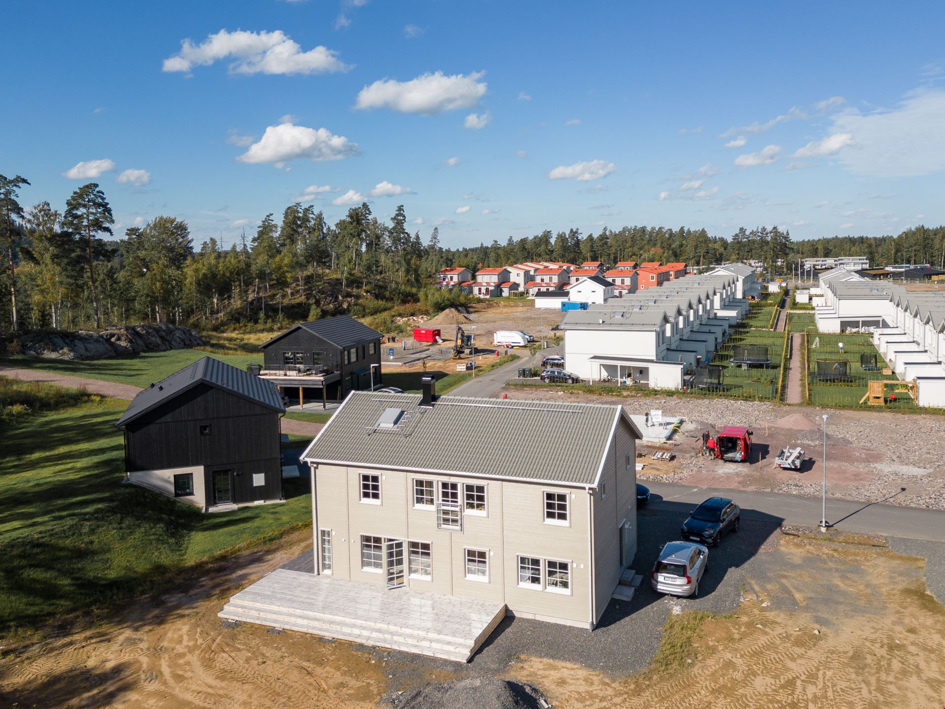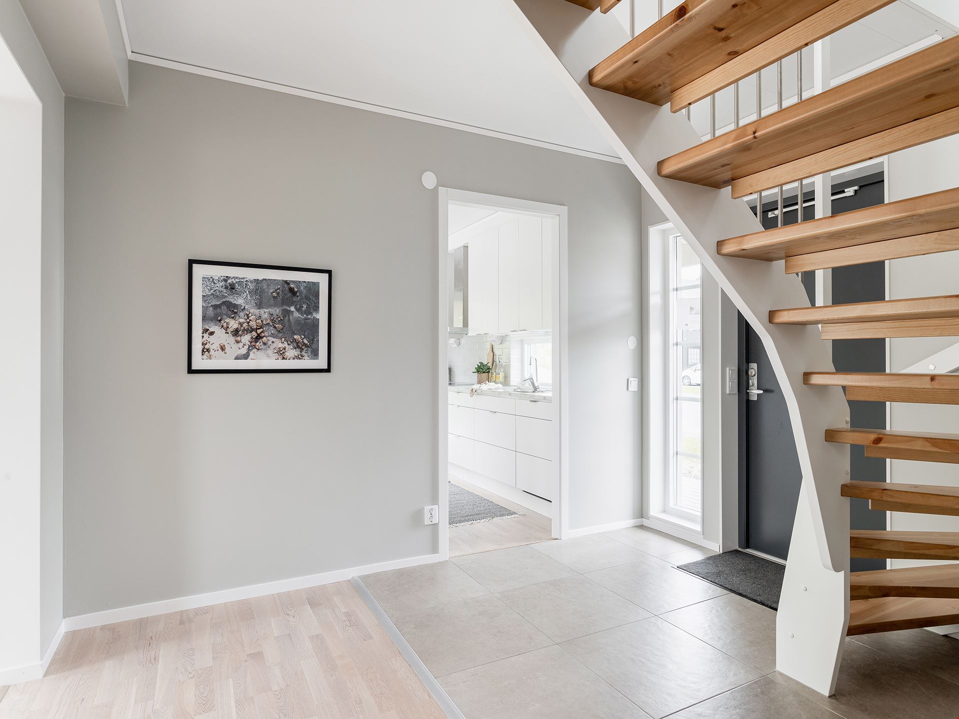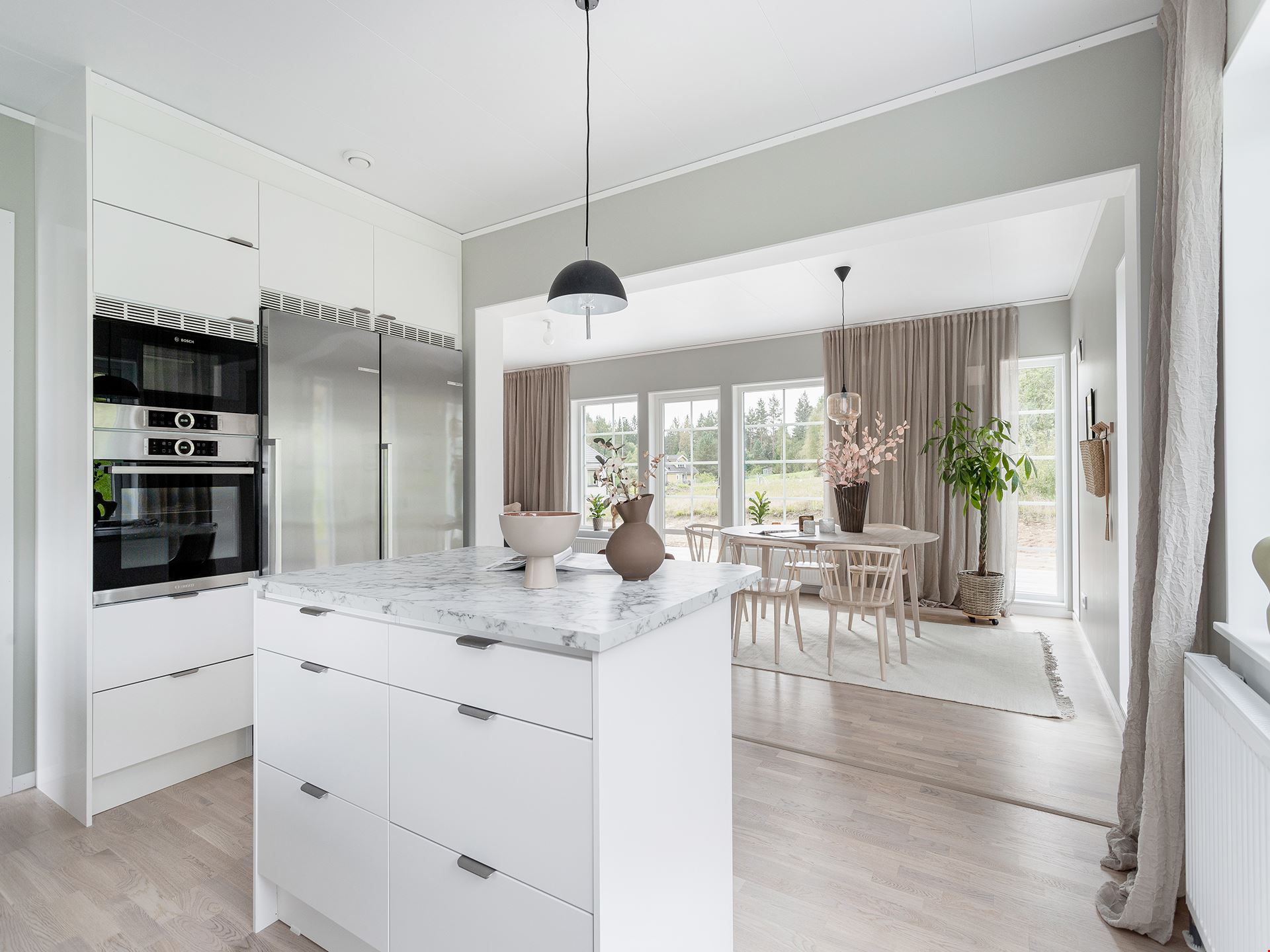 Villa Huskvarna är en av våra mest populära husmodeller. Här får det liggande panel och mellangrått tak. Insidan bjuder på en riktigt bra planlösning, genomgående hög standard och stilren inredning med ljusa ekparkettgolv samt beigea och krämvita tapeter.