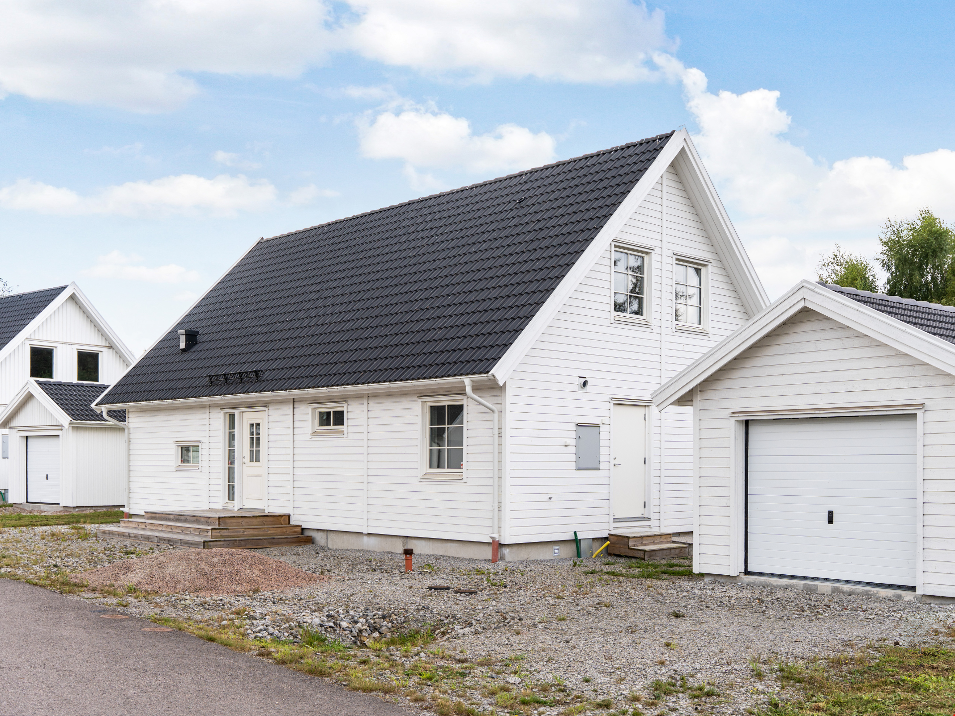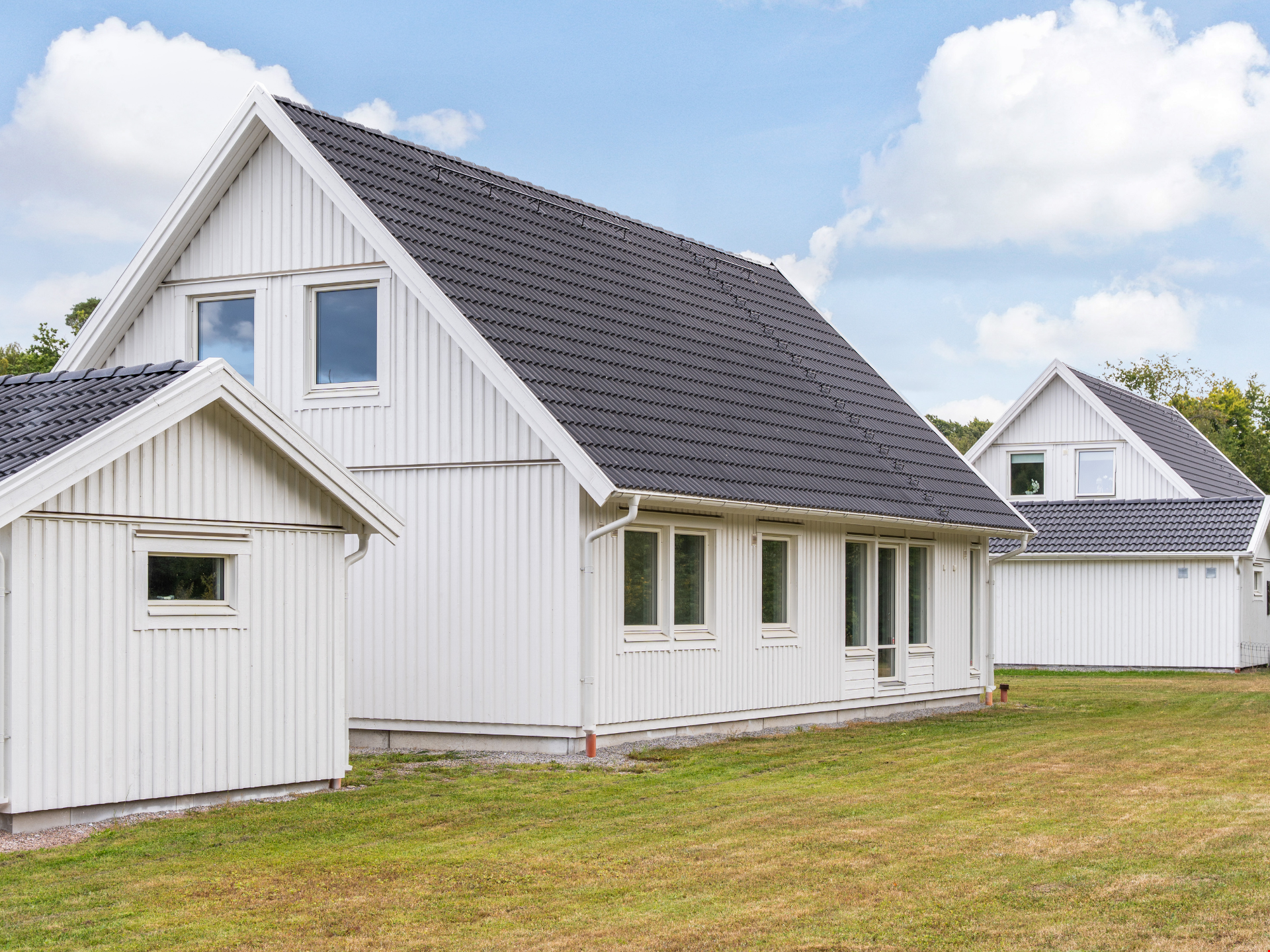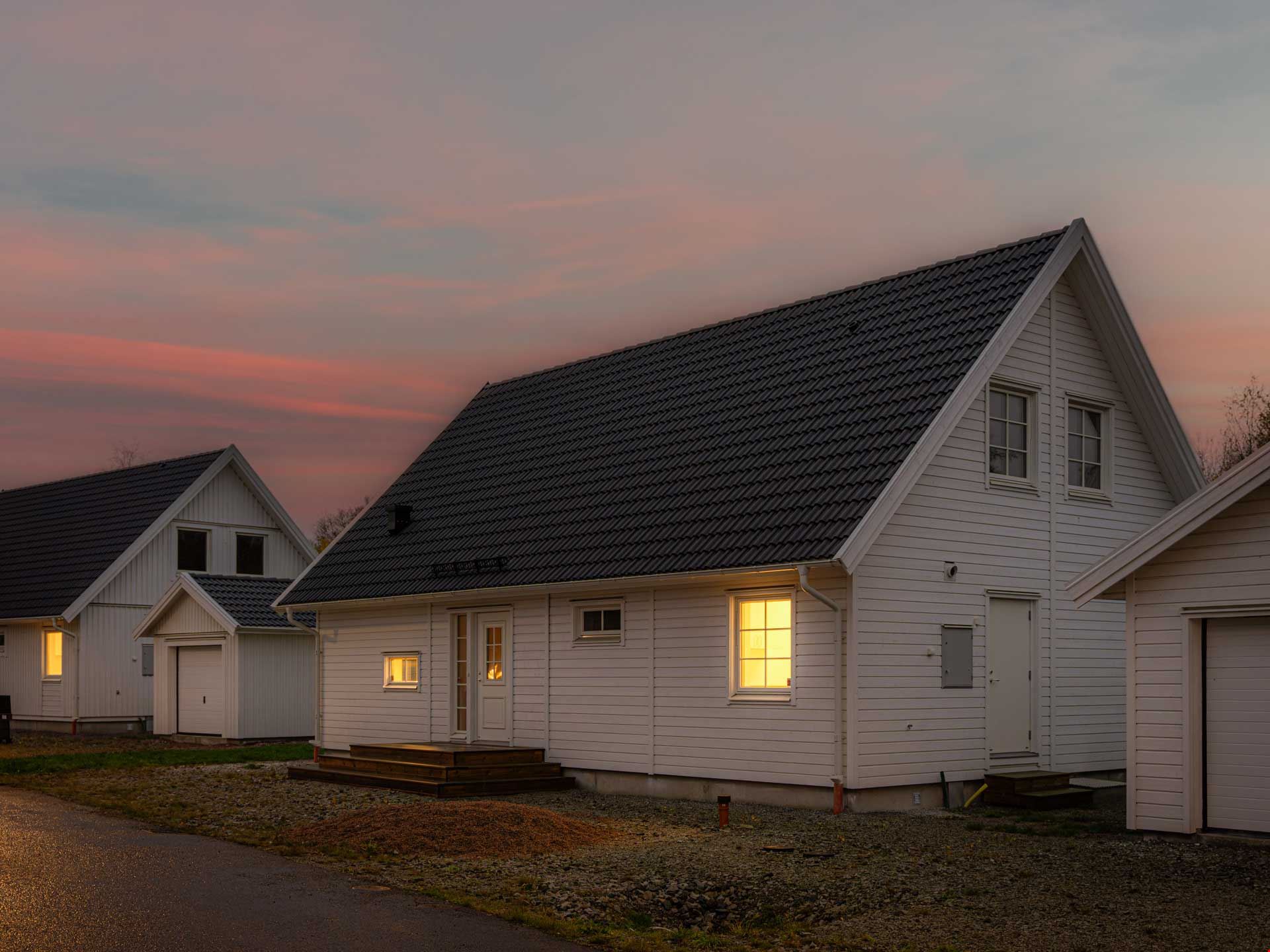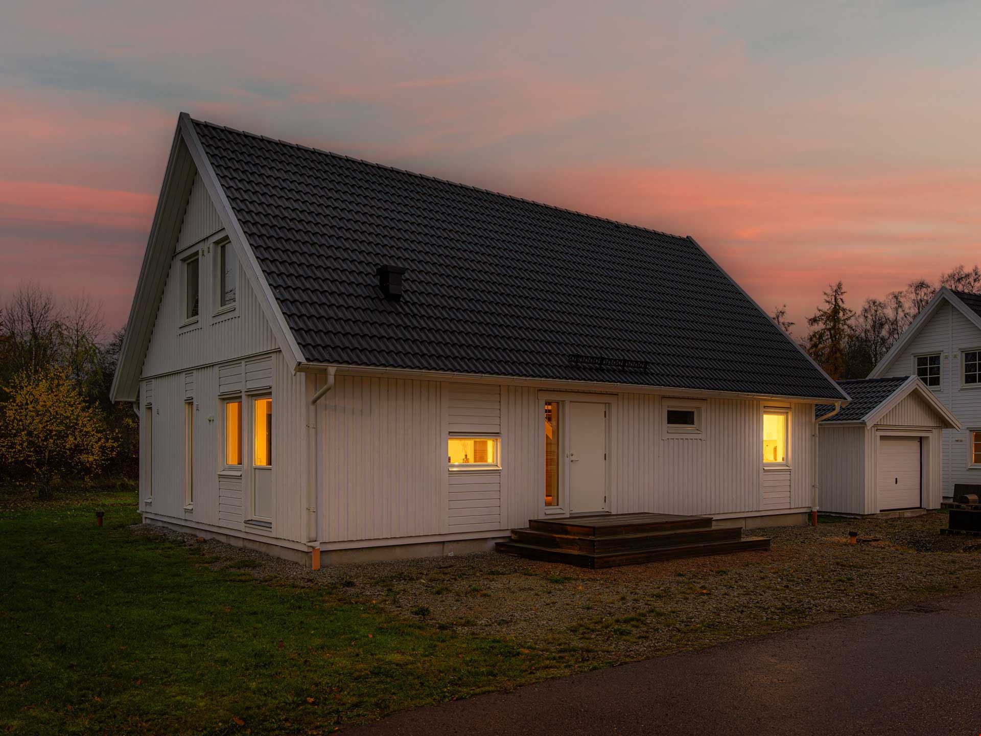 Välkommen till detta nybyggda 1,5-planshus av modellen Villa Kalmar. Huset är en av våra mest populära husmodeller och här har vi valt att uppföra det med liggande panel, svart tak, fönster med spröjs och fönster i gavelspetsarna. Invändigt har huset en genomgående hög standard, vitmålade väggar och en väl genomtänkt planlösning. Bottenplan är 95 kvadratmeter fördelat på 3 rum och kök.