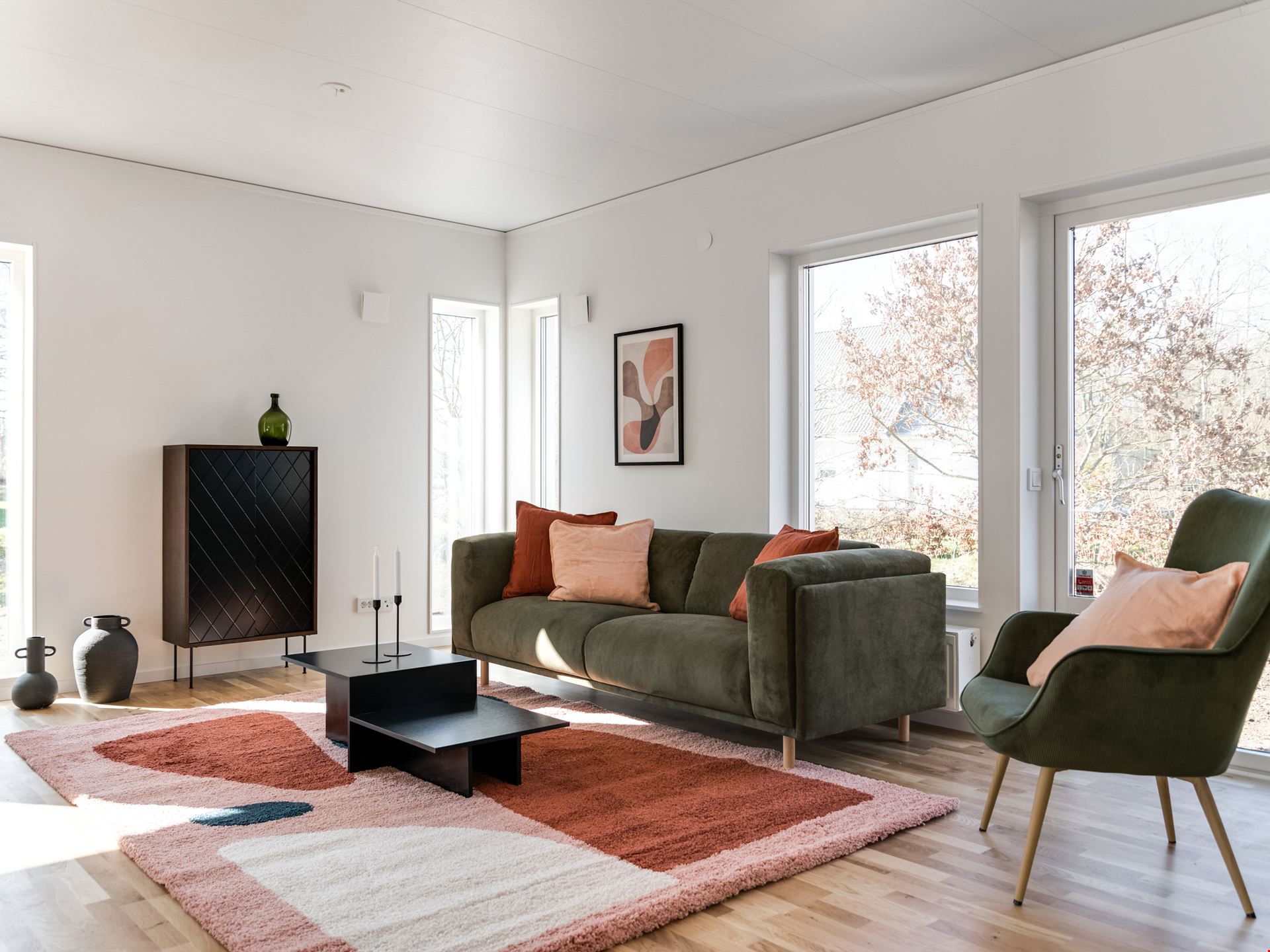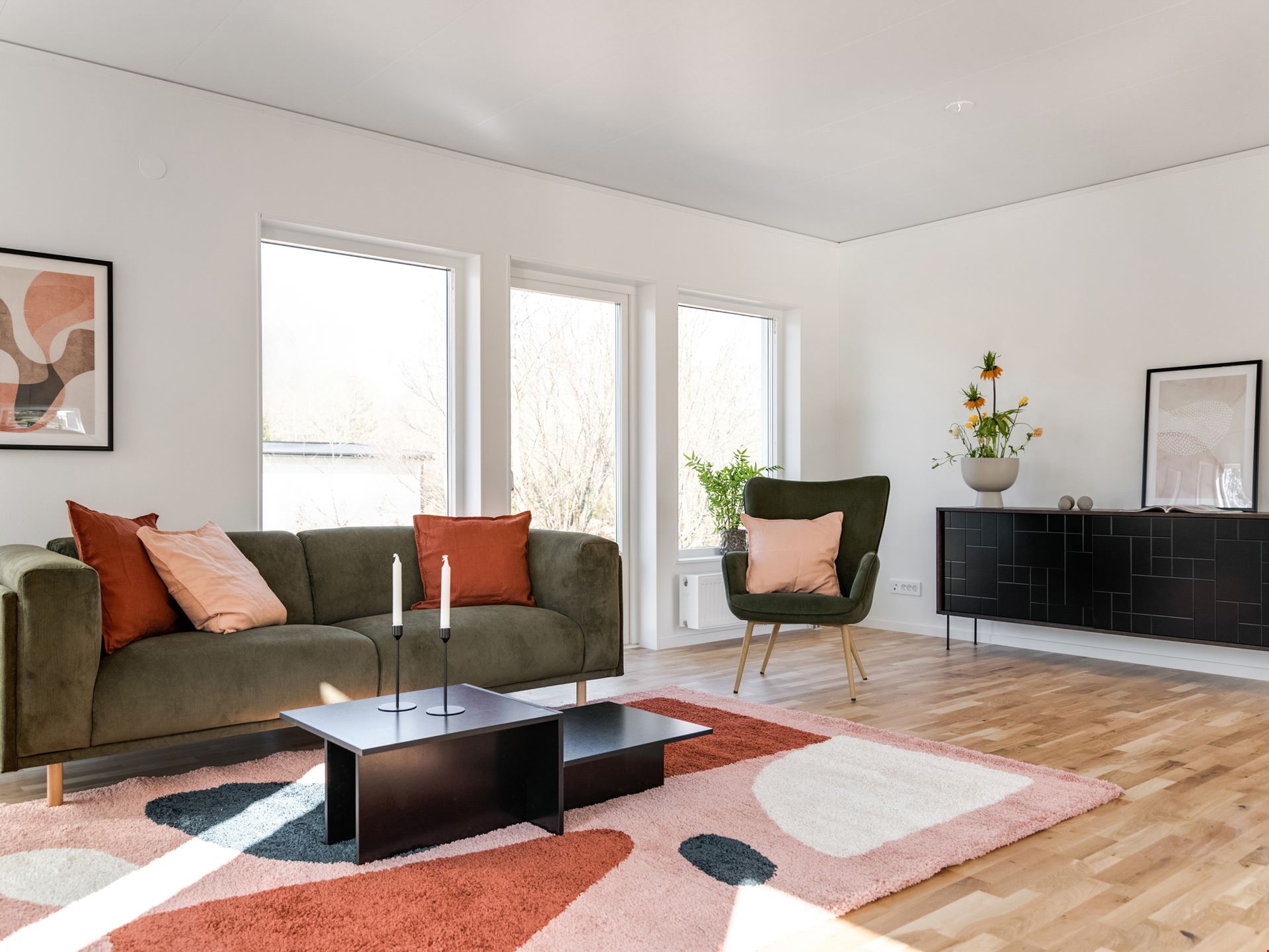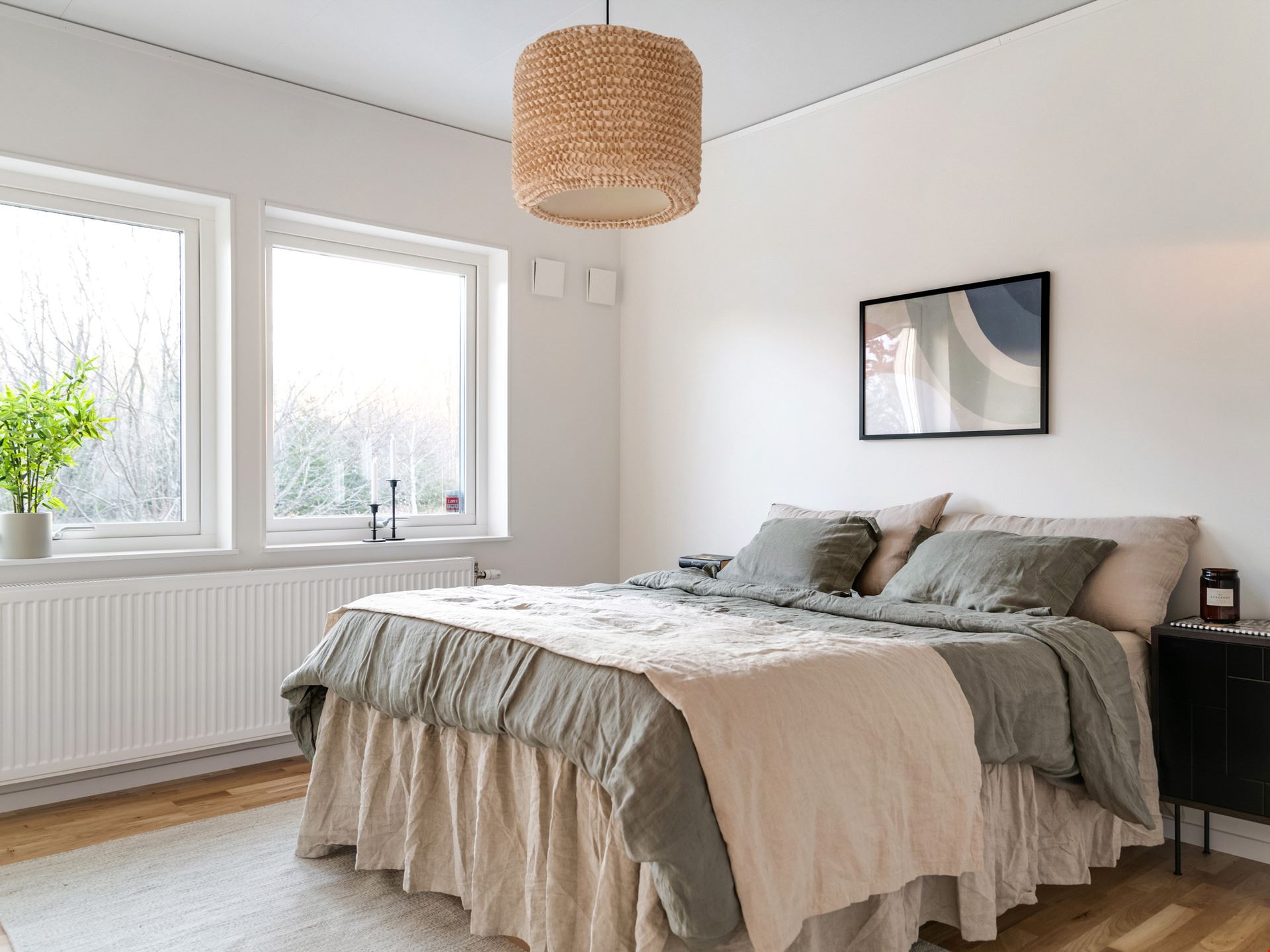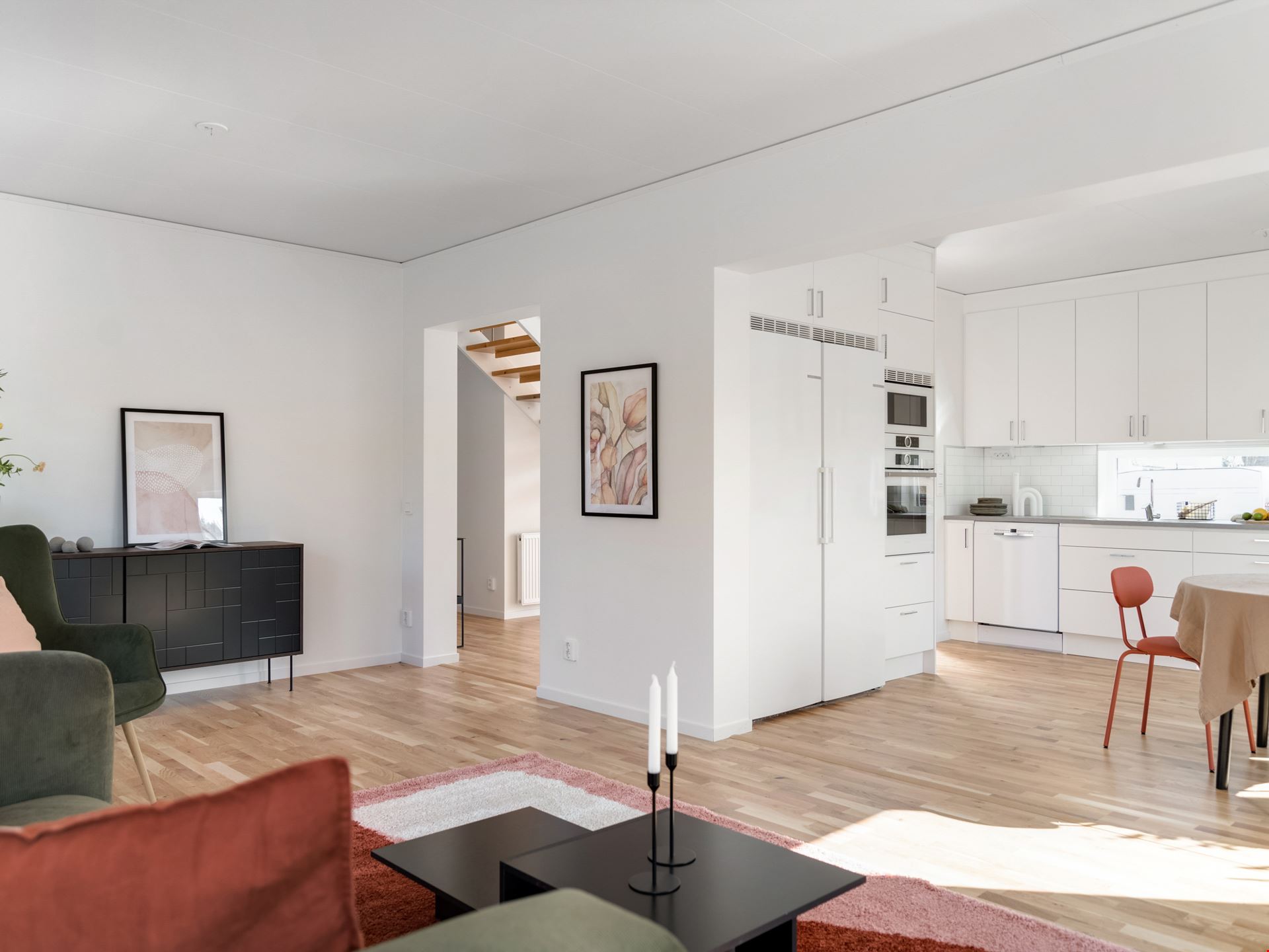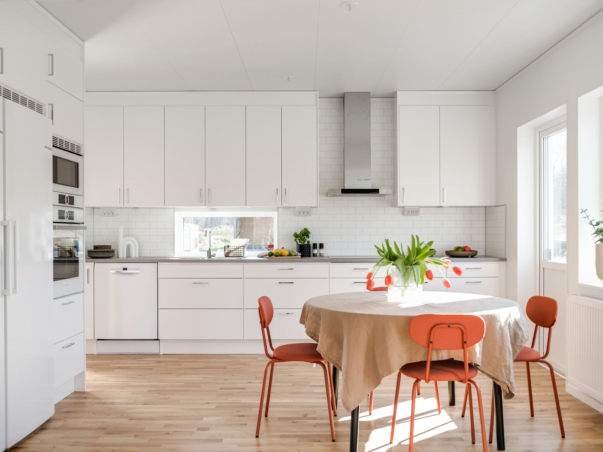 När du kliver in i det här huset möts du av en rymlig hall med fri genomsikt ut mot trädgården på andra sidan. Från hallen tar du dig vidare in mot köket som ligger i öppen anslutning mot det stora vardagsrummet och bjuder på ett fantastiskt ljusinsläpp. Här finns det gott om plats att umgås, både vid middagar och läxläsning. Köket kommer från Vedum och är utrustat med allt du kan behöva från kylskåp till microvågsugn och diskmaskin. I husets andra ände ligger sovrummet intill husets tvättstuga och badrum. Badrummet är inrett med kakel och klinker, vit kommod, dusch och bäst av allt - golvvärme!