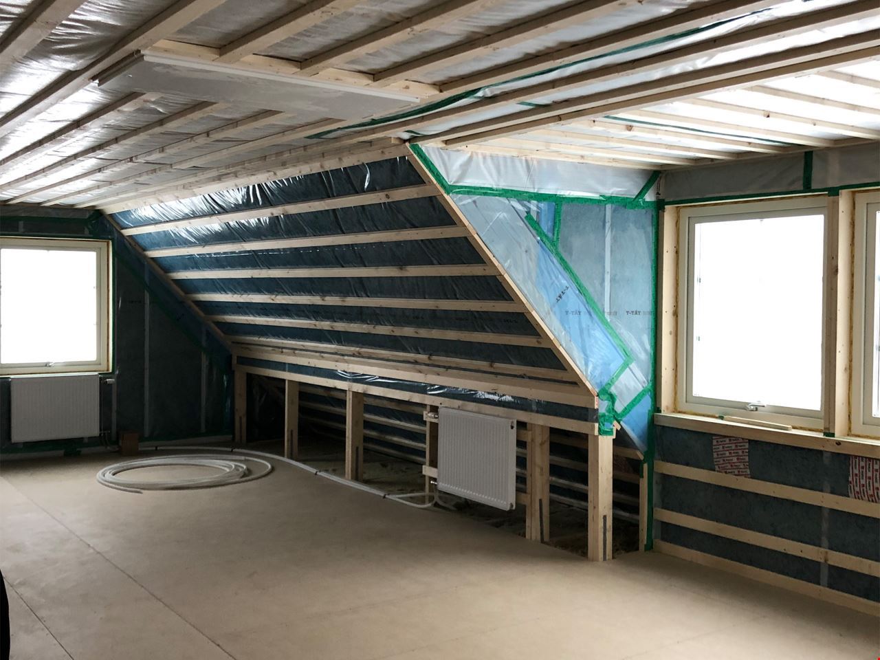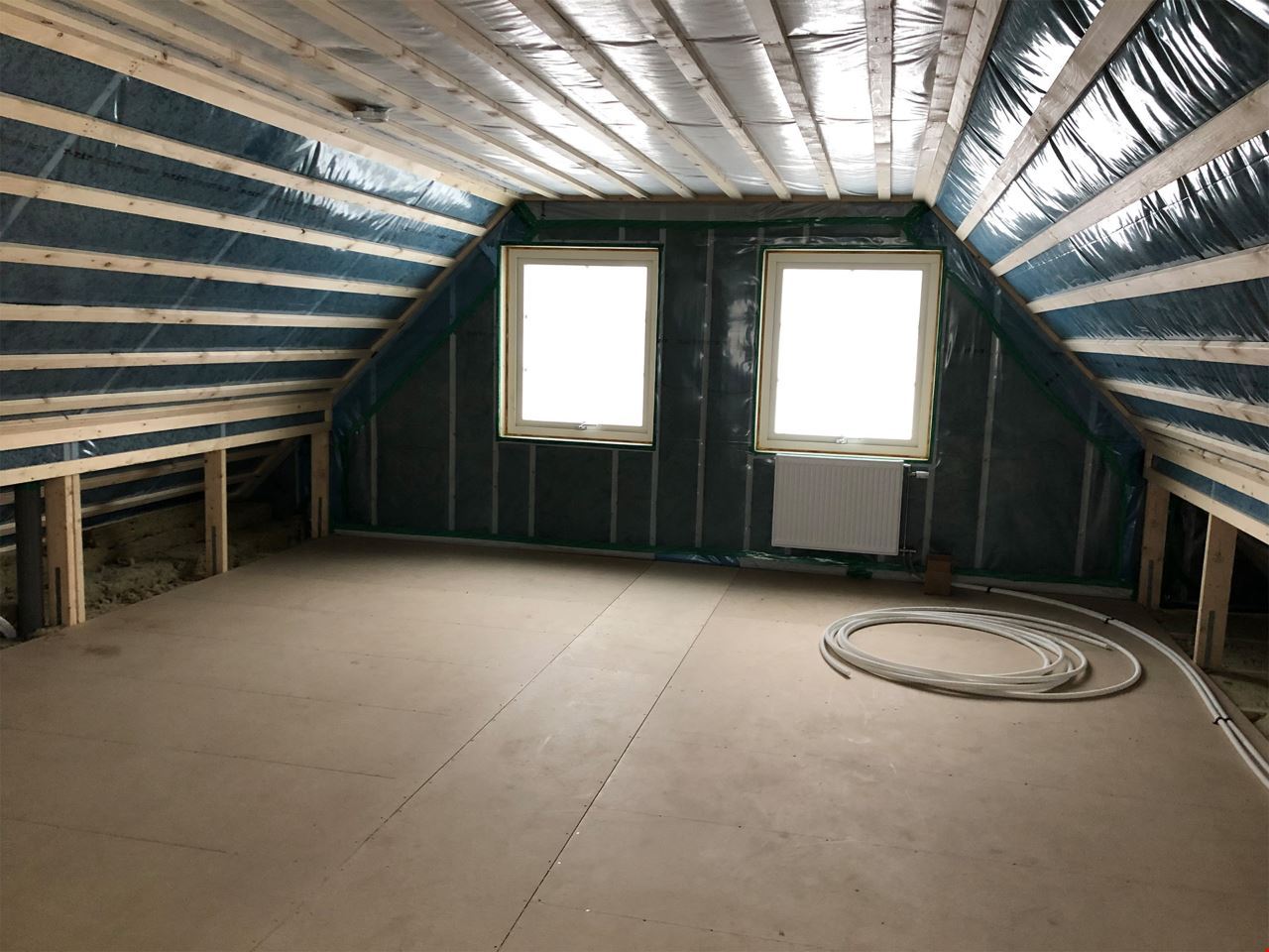 Övervåningen är inredd med klimatskal. Det innebär att det mest utmanande delen av jobbet med övervåningen, nämligen att lufttäta, isolera och glespanela redan är gjort. Vi har också satt in radiatorer som håller värmen – och gör att du kan räkna med boytan på övervåningen i energiberäkningen redan från början. Ett bra val både för dig och miljön.