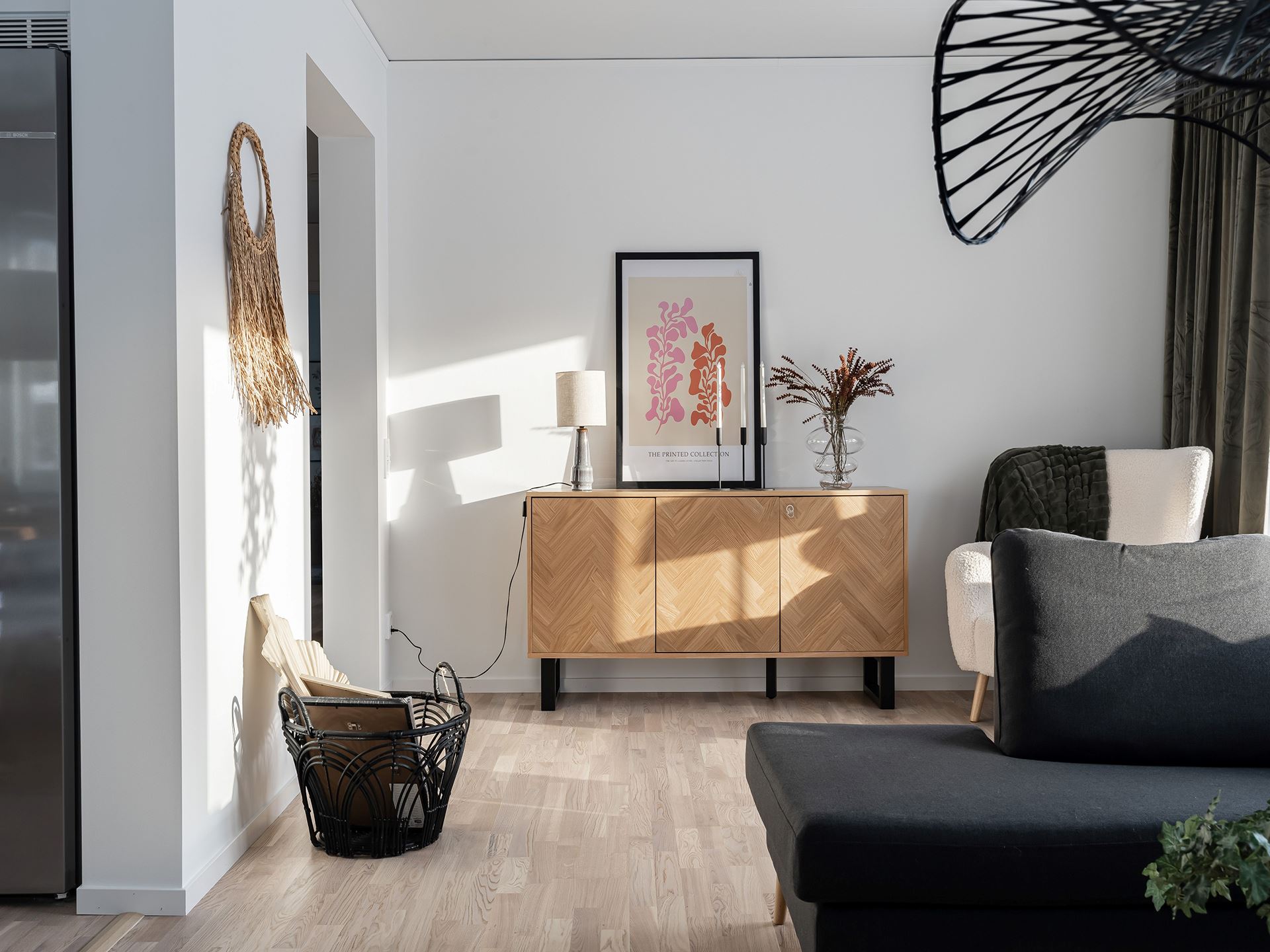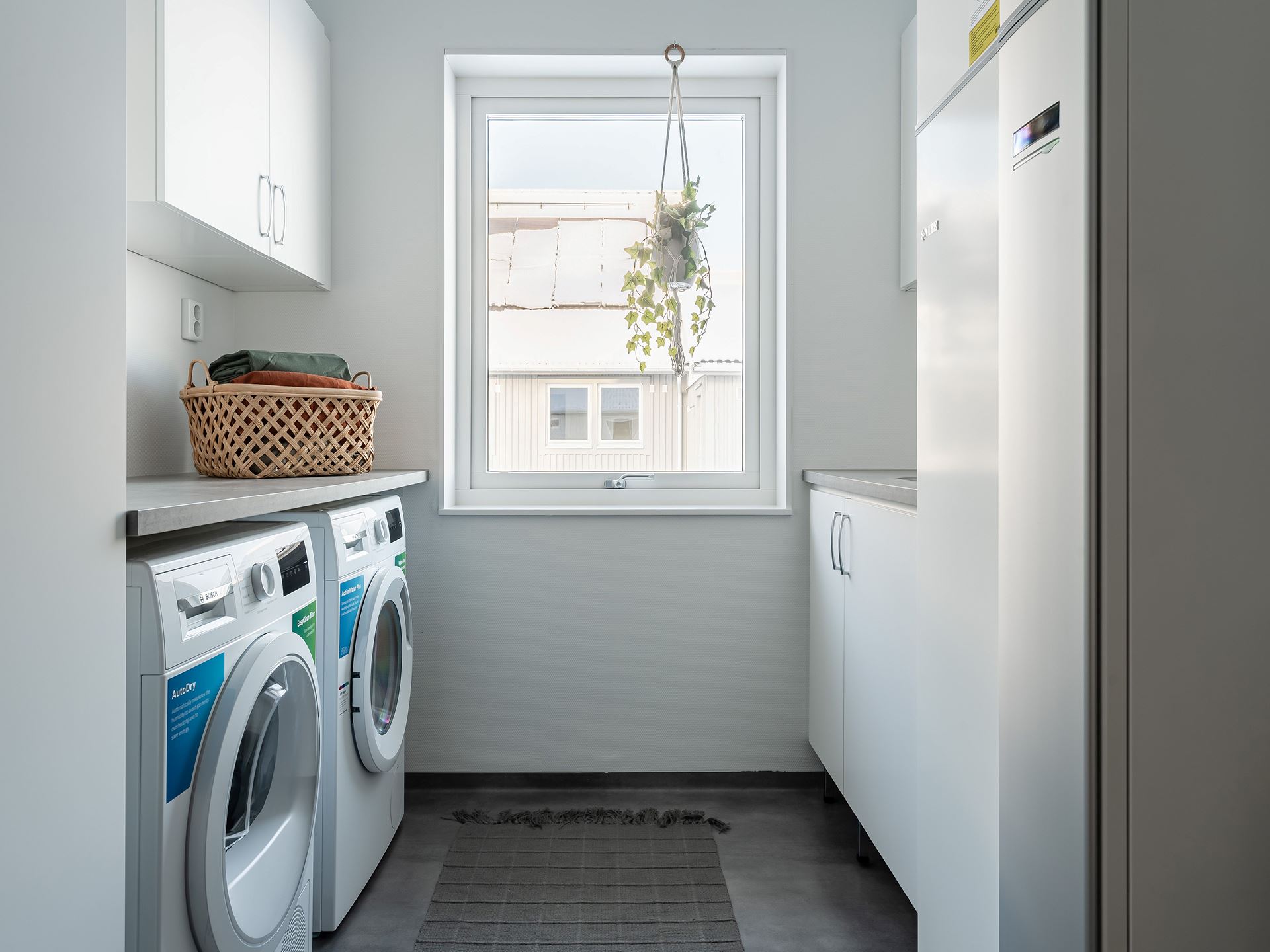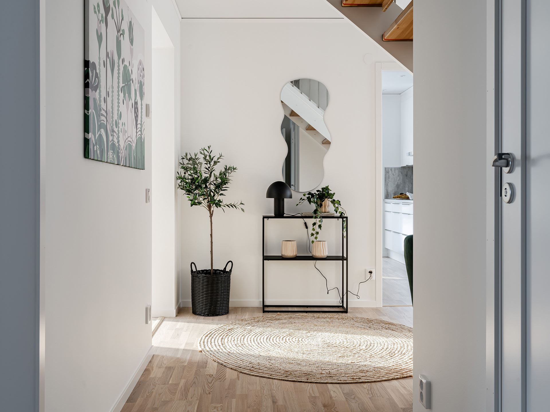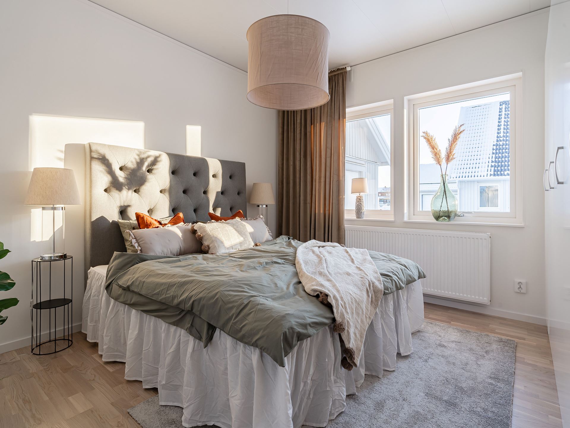 När du kliver in i det här huset möts du av en rymlig hall med fri genomsikt ut mot trädgården på andra sidan. Från hallen tar du dig vidare in mot köket som ligger i öppen anslutning mot det stora vardagsrummet och bjuder på ett fantastiskt ljusinsläpp. Här finns det gott om plats att umgås, både vid middagar och läxläsning. I husets andra ände ligger två sovrum intill husets tvättstuga och badrum.