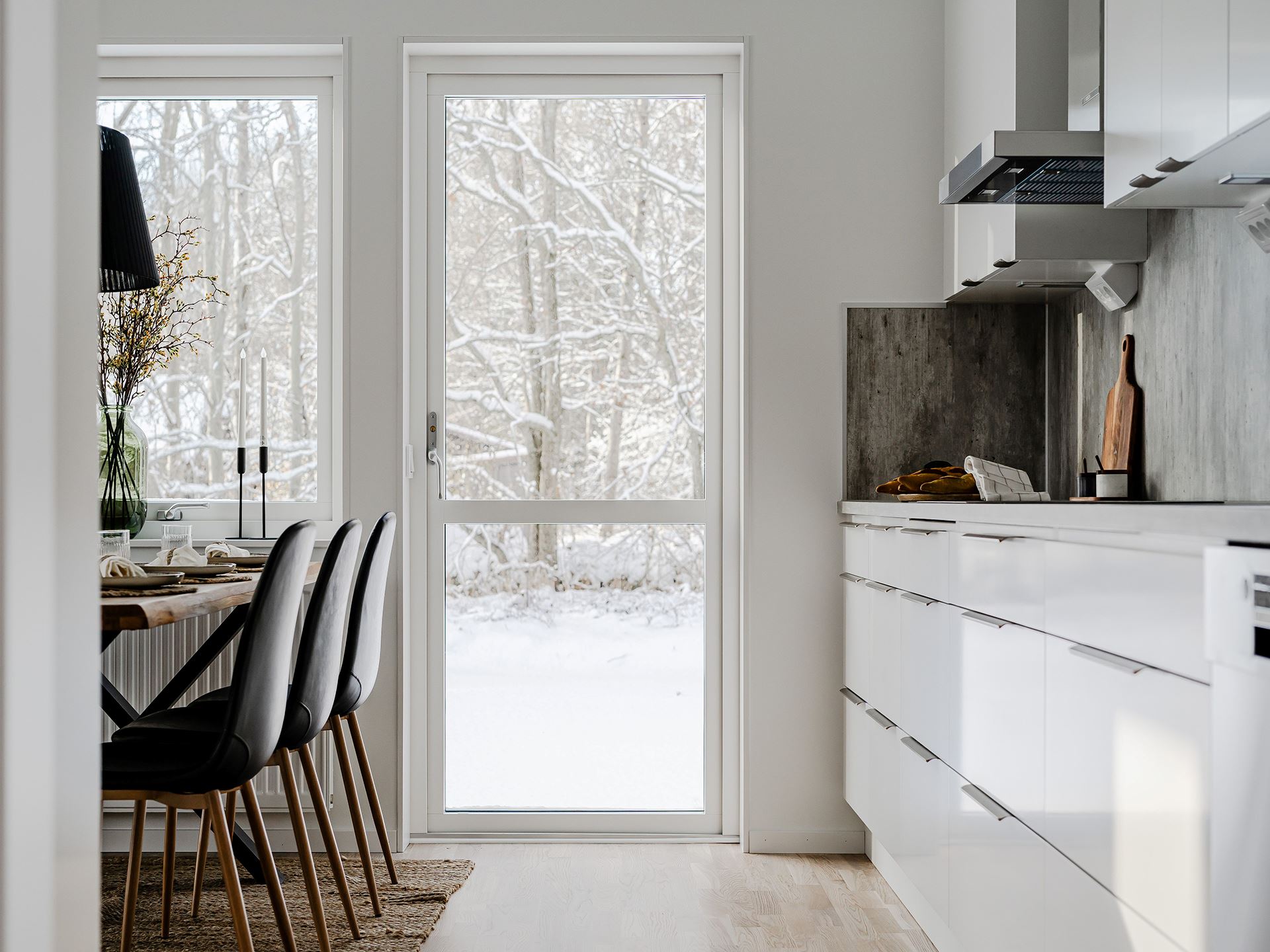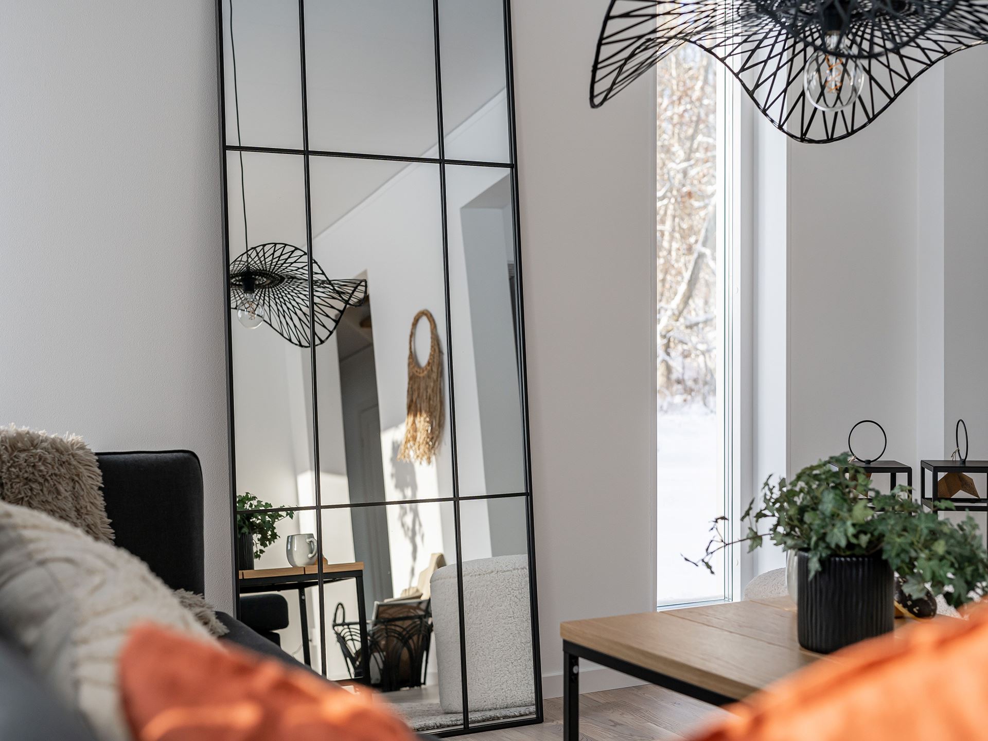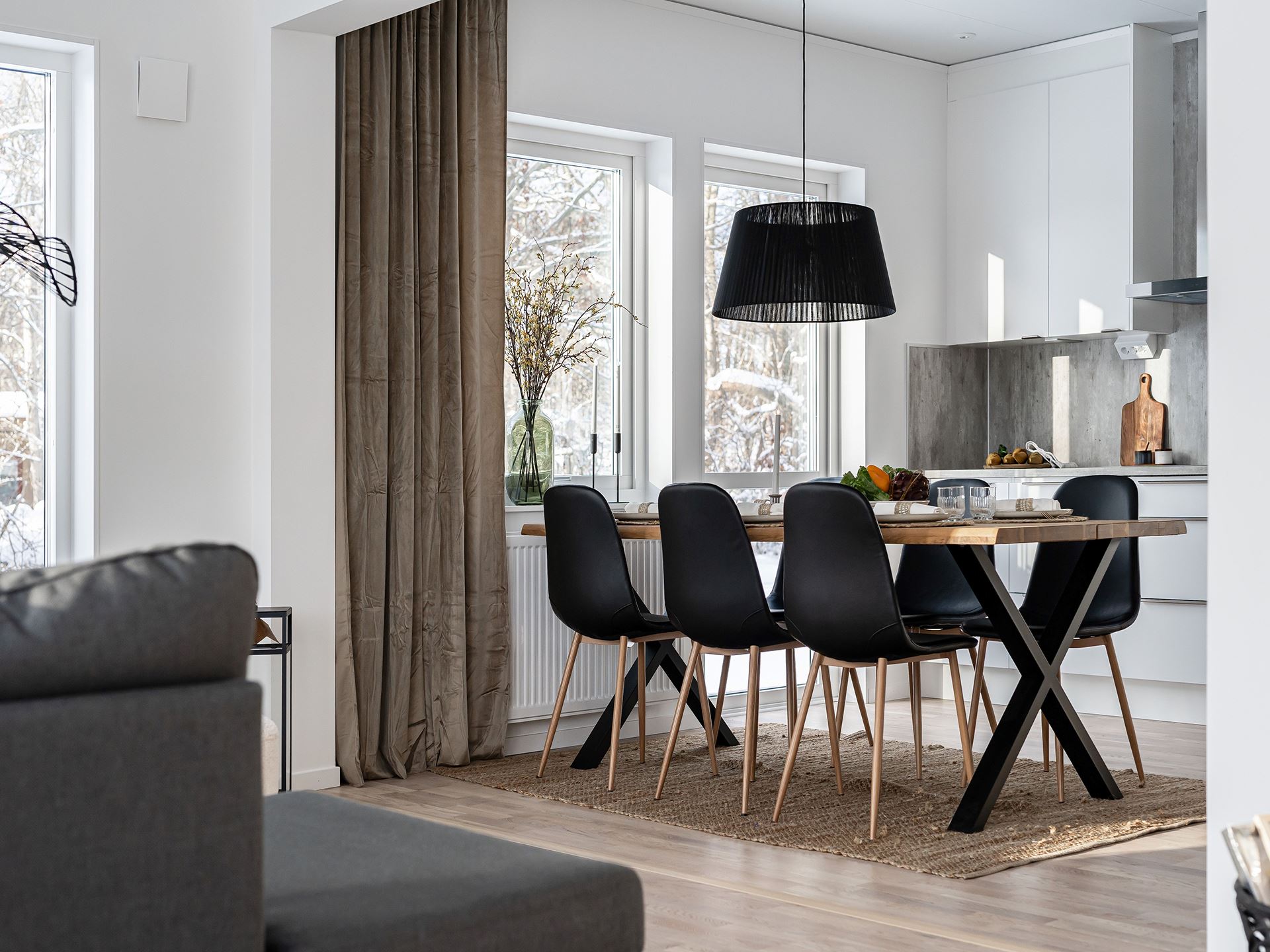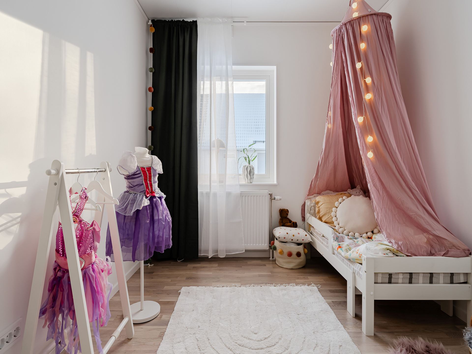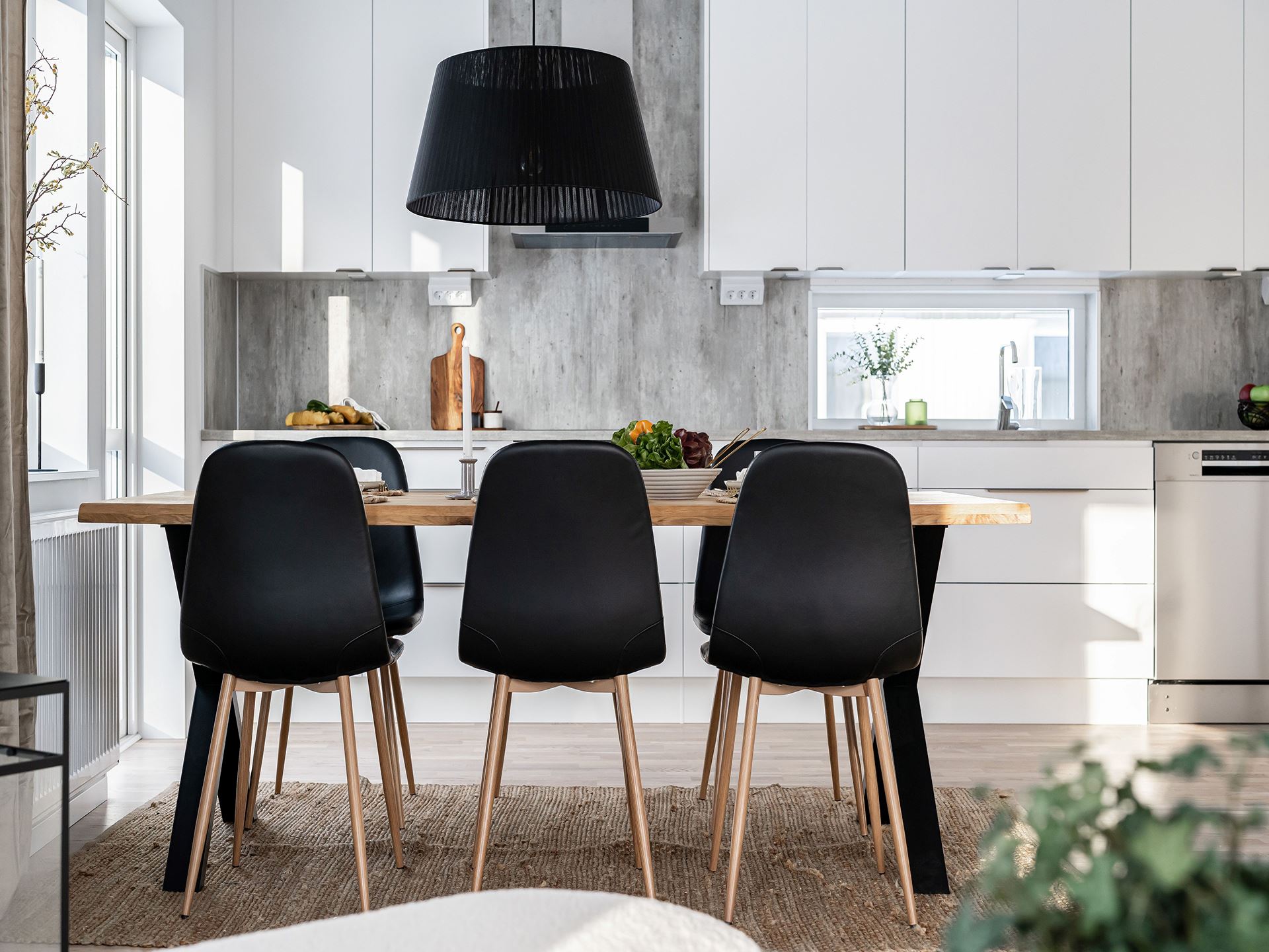 När du kliver in i det här huset möts du av en rymlig hall med fri genomsikt ut mot trädgården på andra sidan. Från hallen tar du dig vidare in mot köket som ligger i öppen anslutning mot det stora vardagsrummet och bjuder på ett fantastiskt ljusinsläpp. Här finns det gott om plats att umgås, både vid middagar och läxläsning. I husets andra ände ligger två sovrum intill husets tvättstuga och badrum.