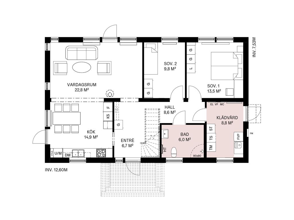 När du kliver in i det här huset möts du av en rymlig hall med fri genomsikt ut mot trädgården på andra sidan. Från hallen tar du dig vidare in mot köket som ligger i öppen anslutning mot det stora vardagsrummet och bjuder på ett fantastiskt ljusinsläpp. Här finns det gott om plats att umgås, både vid middagar och läxläsning. I husets andra ände ligger två sovrum intill husets tvättstuga och badrum.