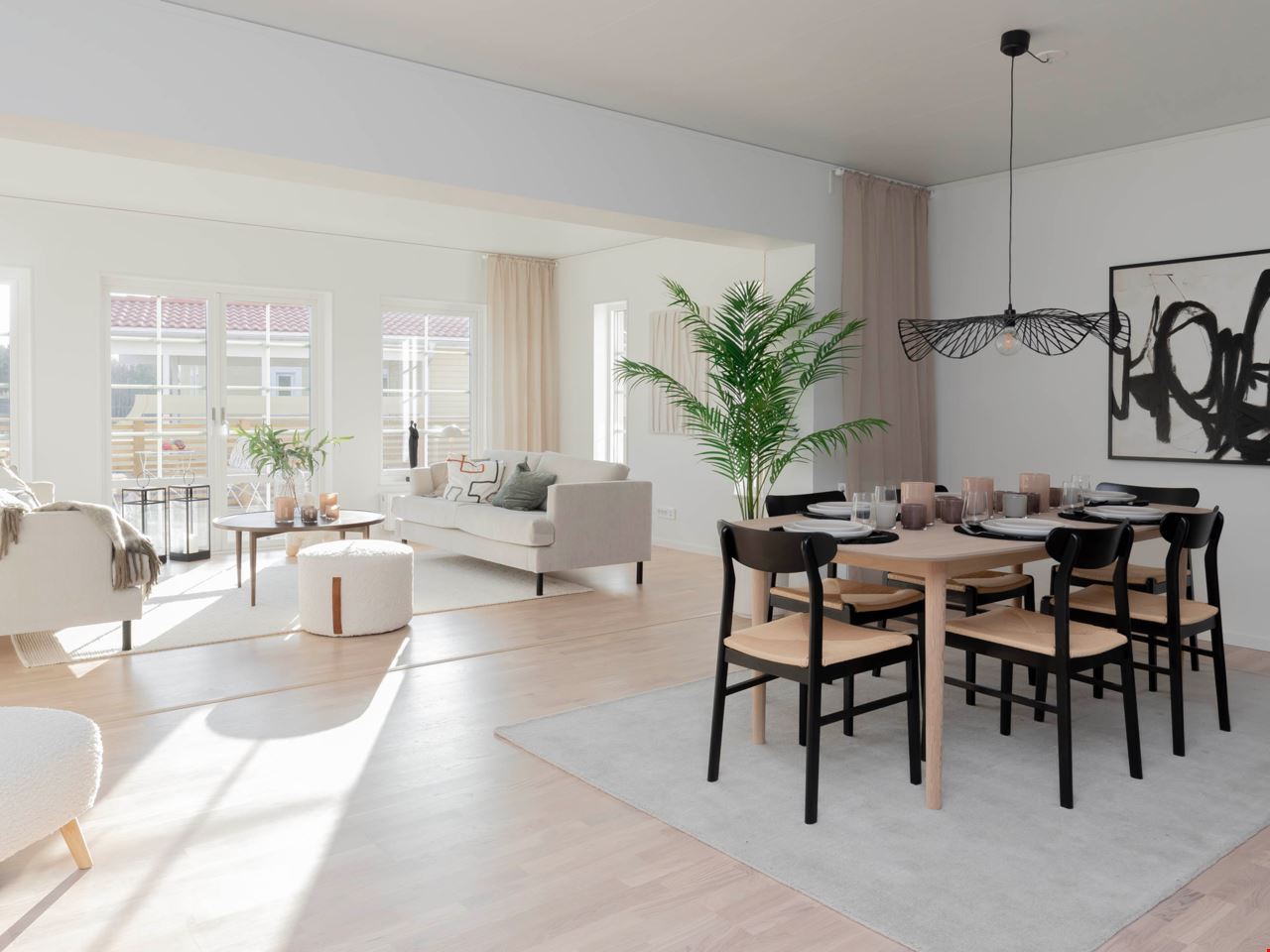 Skulle du tycka att vardagsrummets 46 kvadratmetrar inte räcker till kan du välja bort ett sovrum och få hela 55 kvadrat att umgås på.