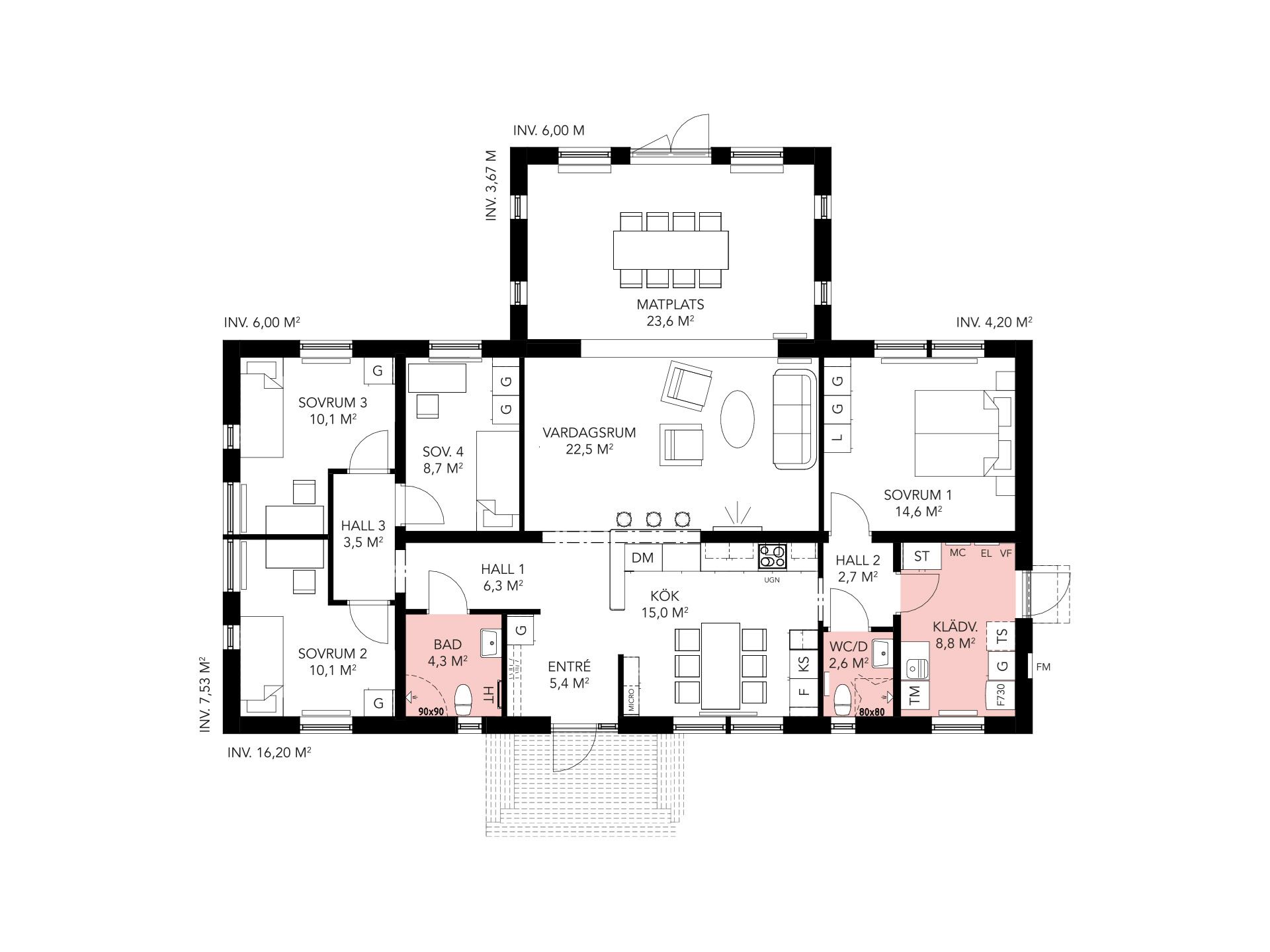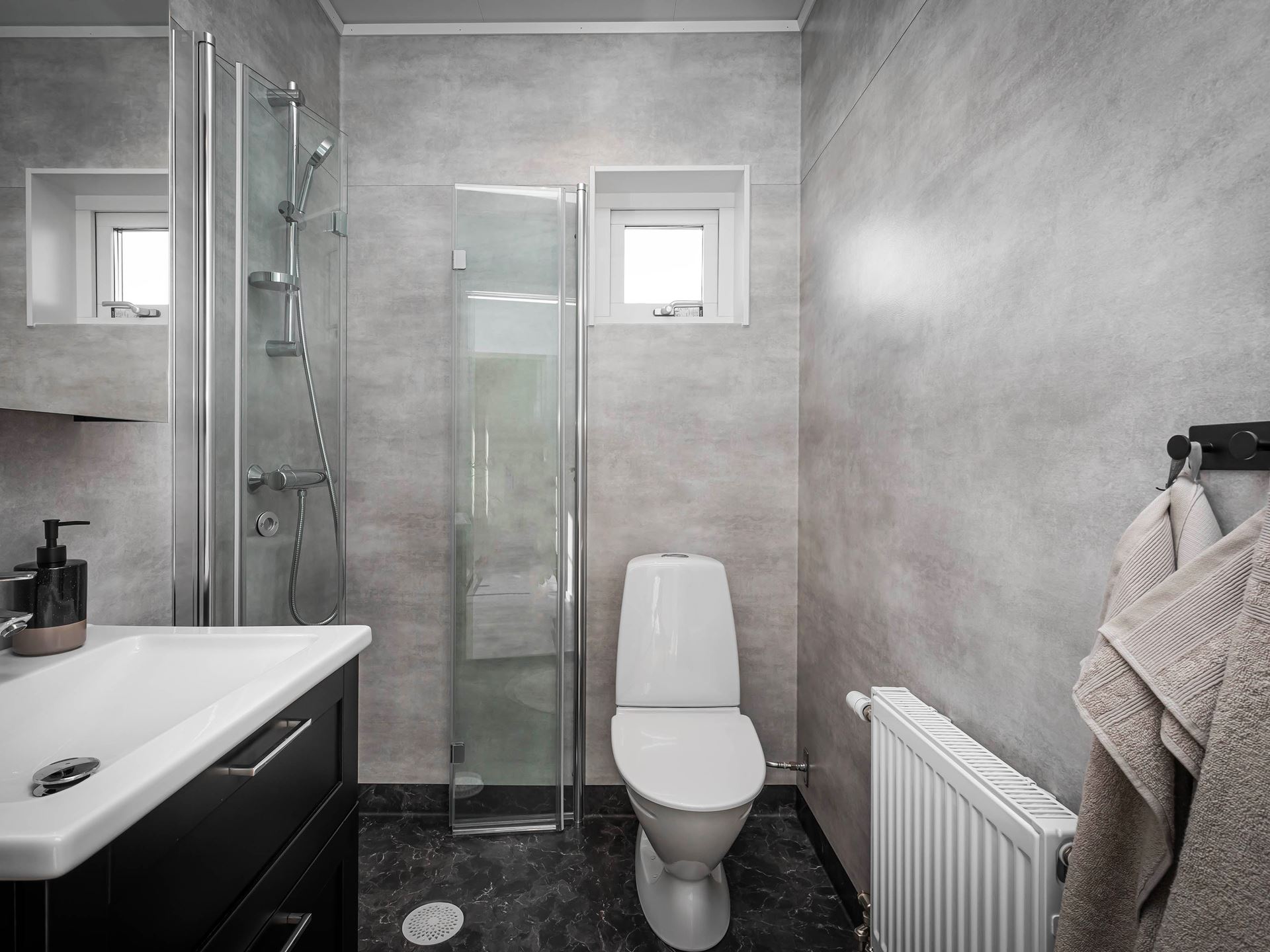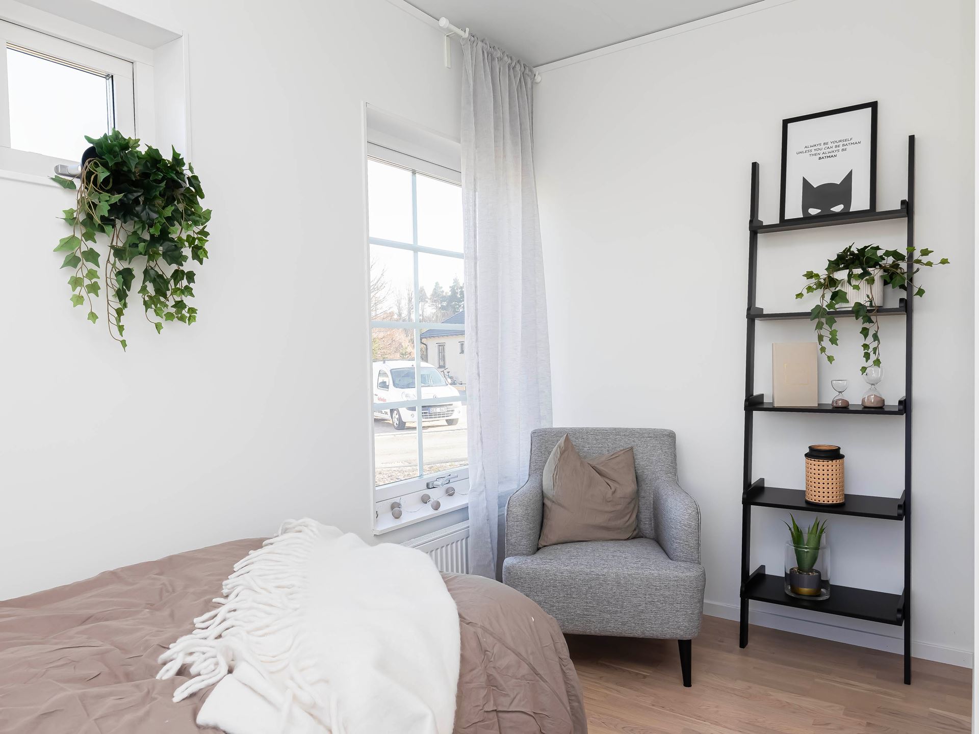 I husets vänstra del finns barn- och ungdomsavdelningen medan huvudsovrummet ligger i andra delen i anslutning till wc/dusch och klädvård.