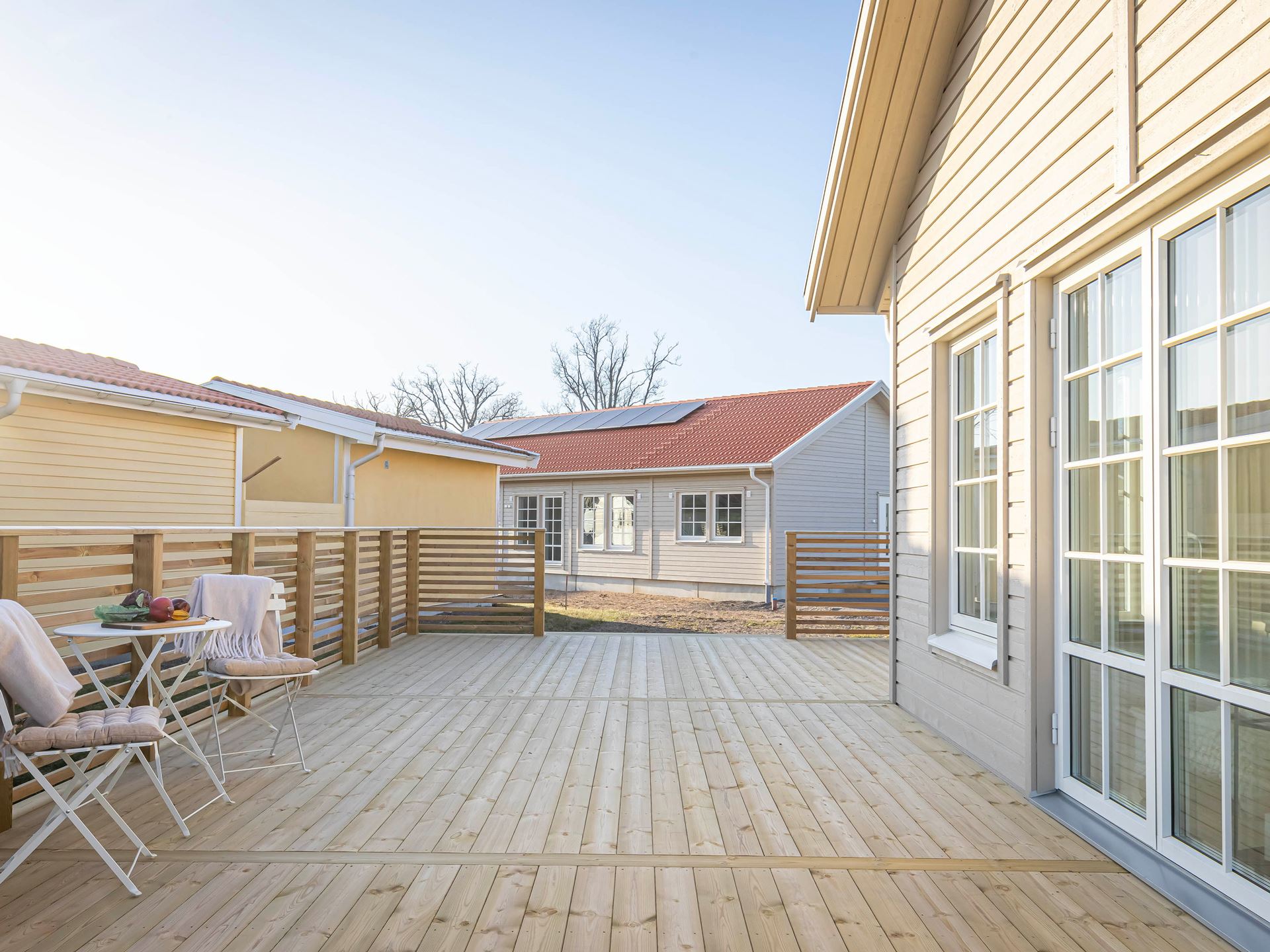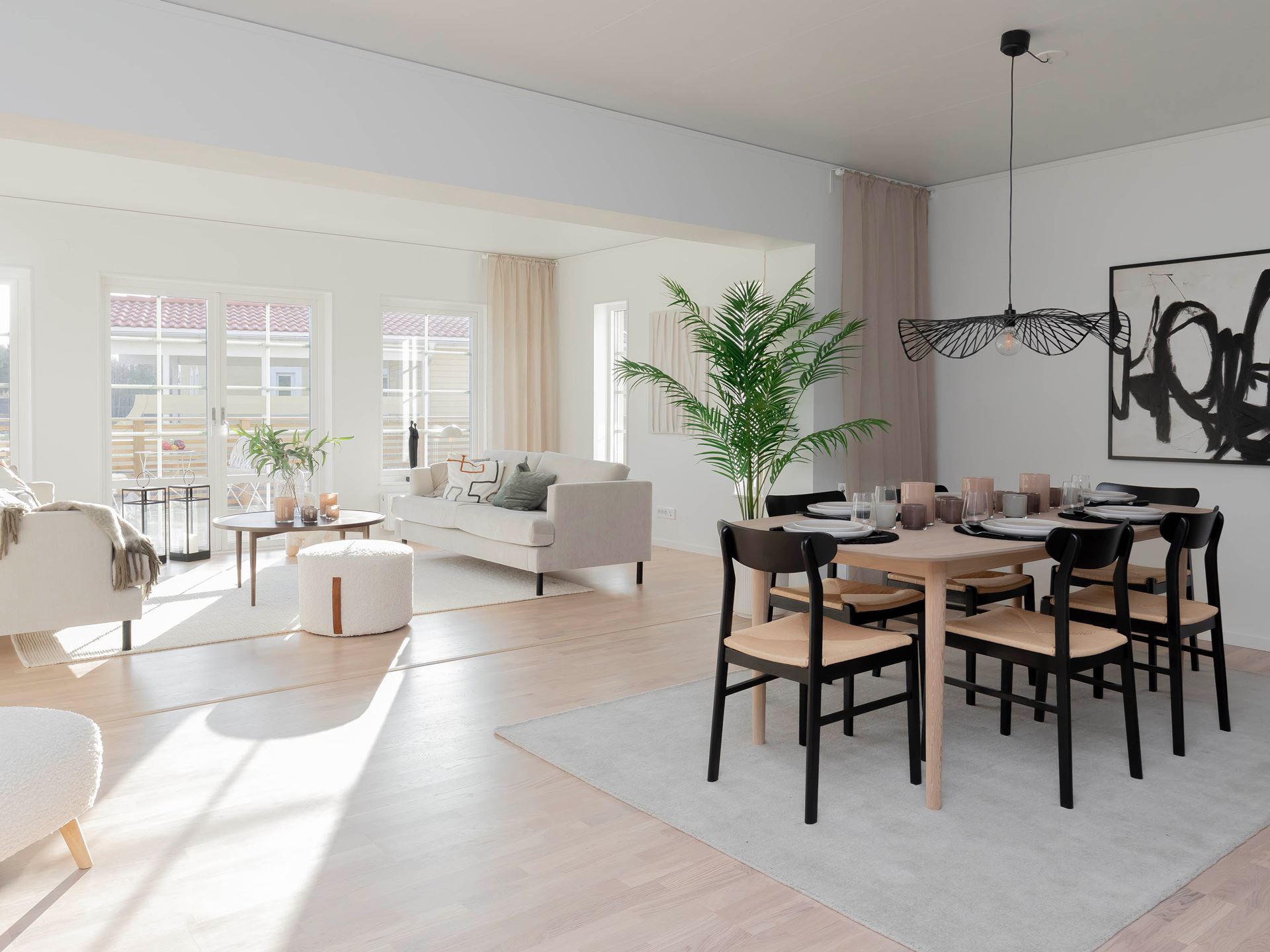 När du öppnar dörren till ett Villa Adelöv möts du av en enorm genomsikt som sträcker sig genom hela huset och ut mot uteplatsen på baksidan. Här öppnar kök och vardagsrum upp sig direkt från entrén.